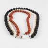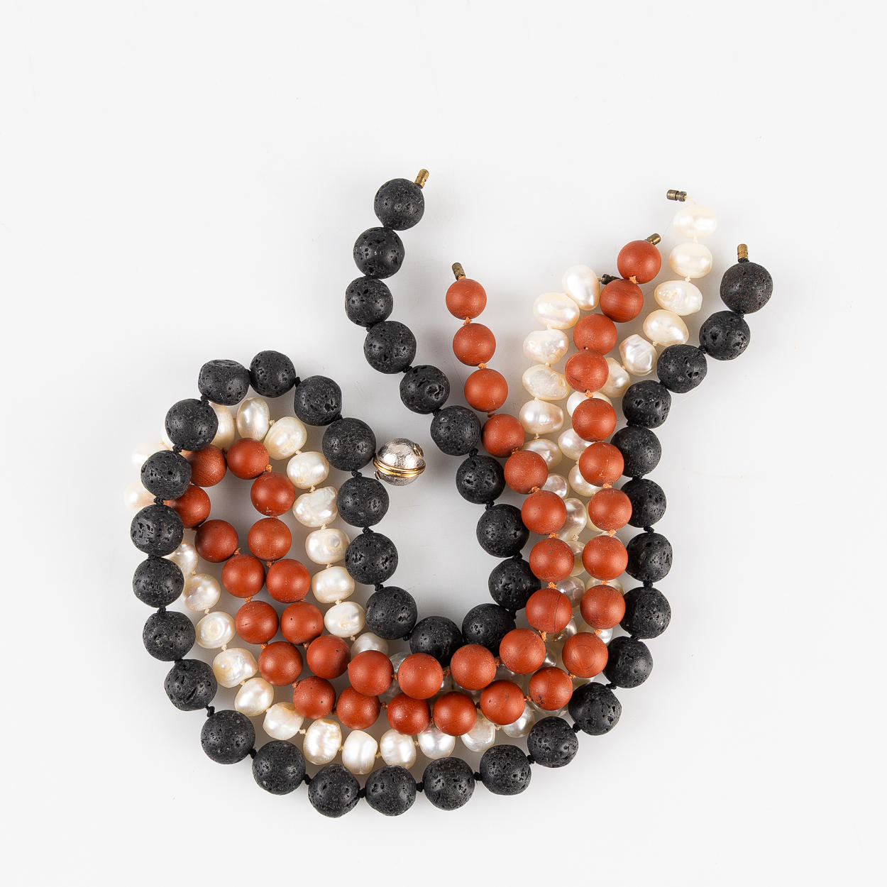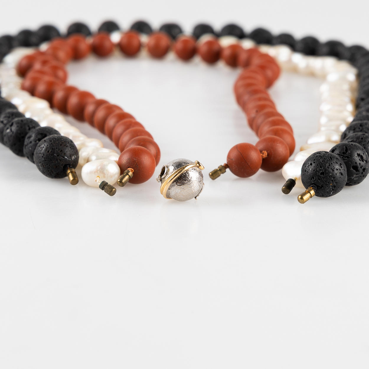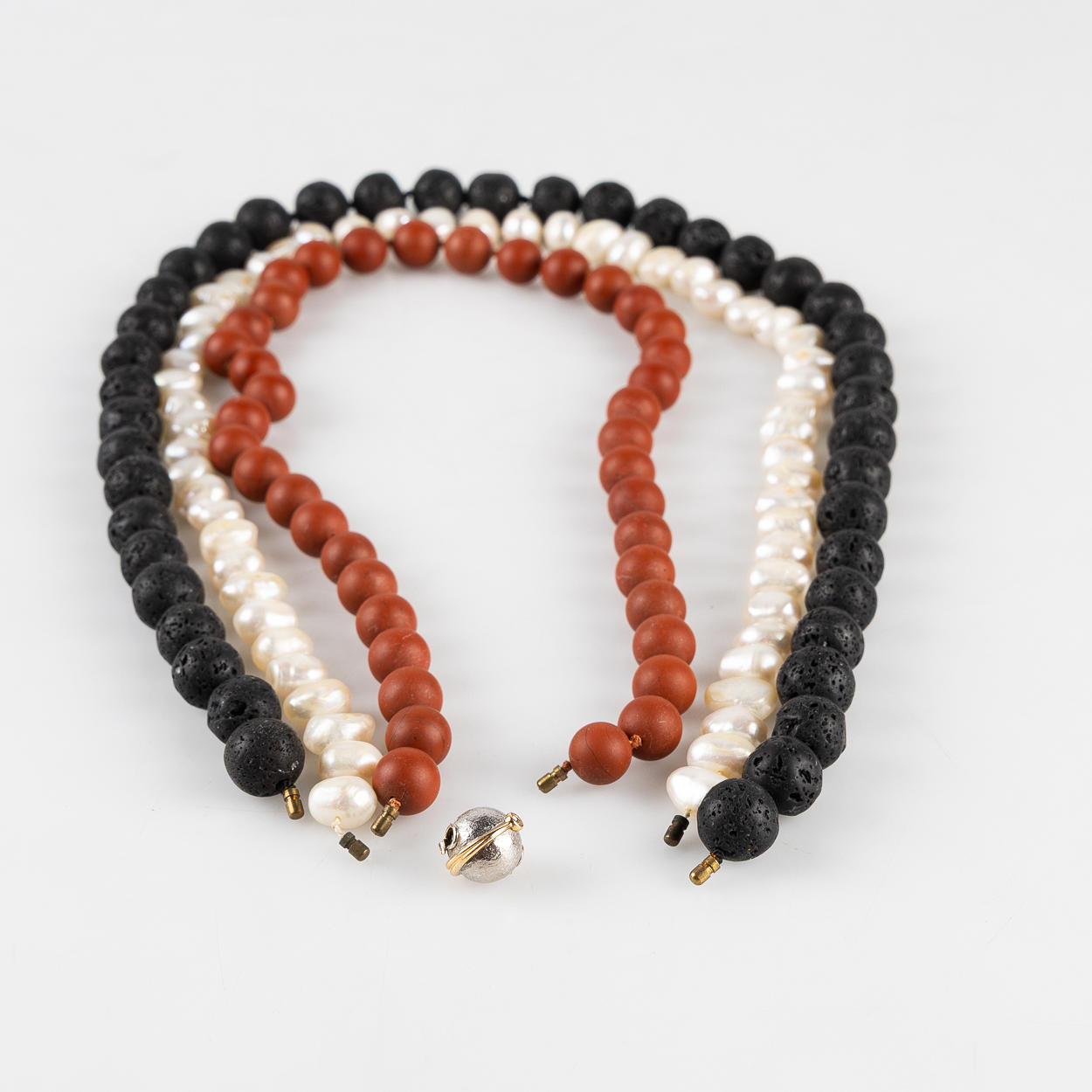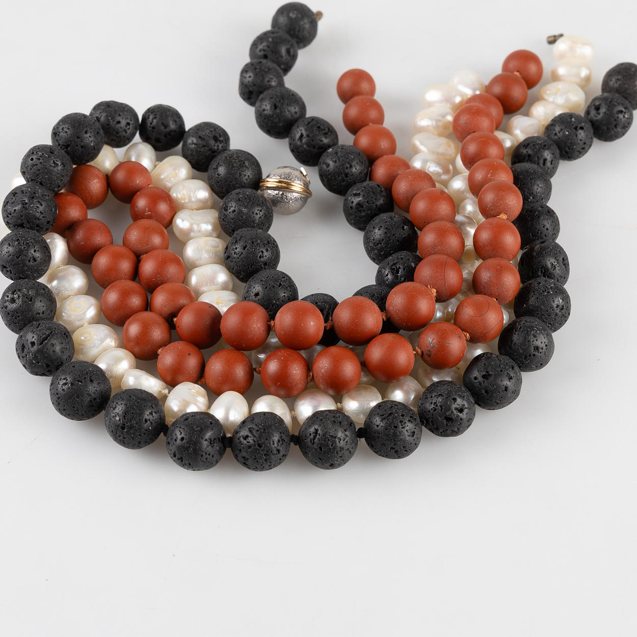 3 st. collier i röd jaspis, barocka sötvattenspärlor samt lavasten. L ca 46, 50 , 52 cm.