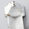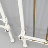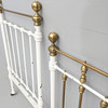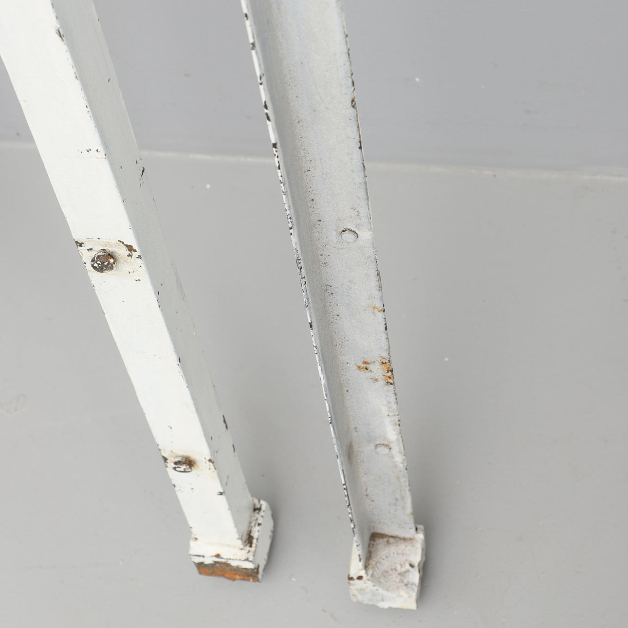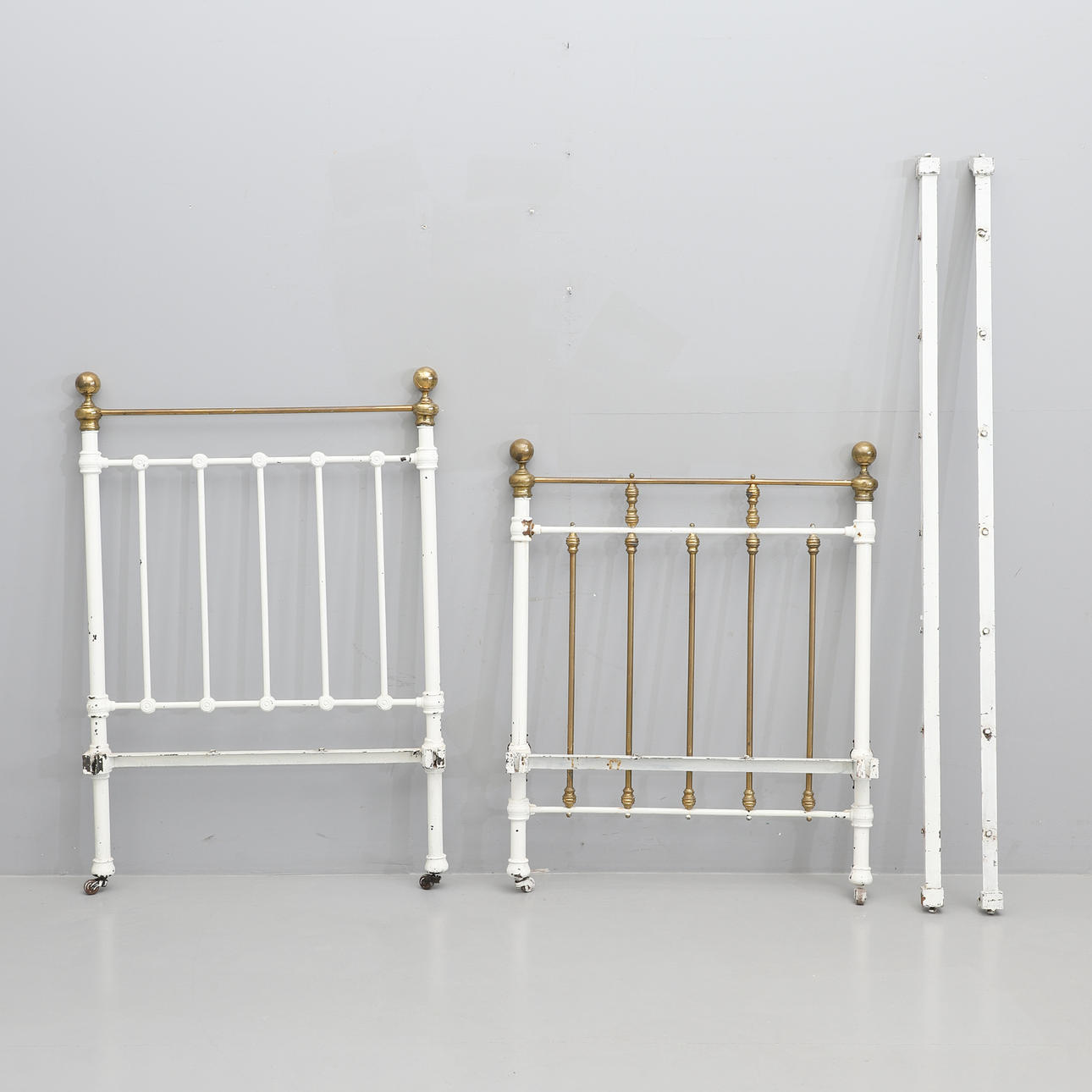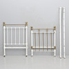 Vitlackerad, med mässingsdelar. Två gavlar med spjälor och två längsgående stag. Gavlarnas bredd 93, höjd 116 resp 135 cm. Stagens längd 185 cm.