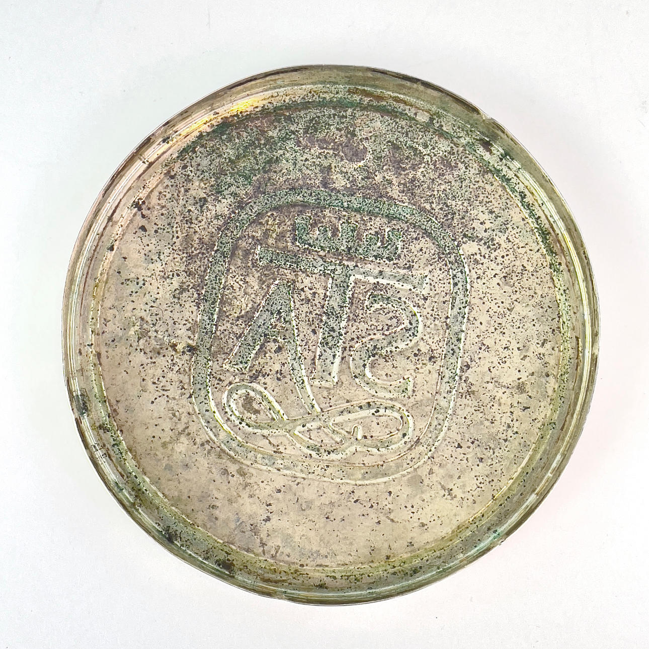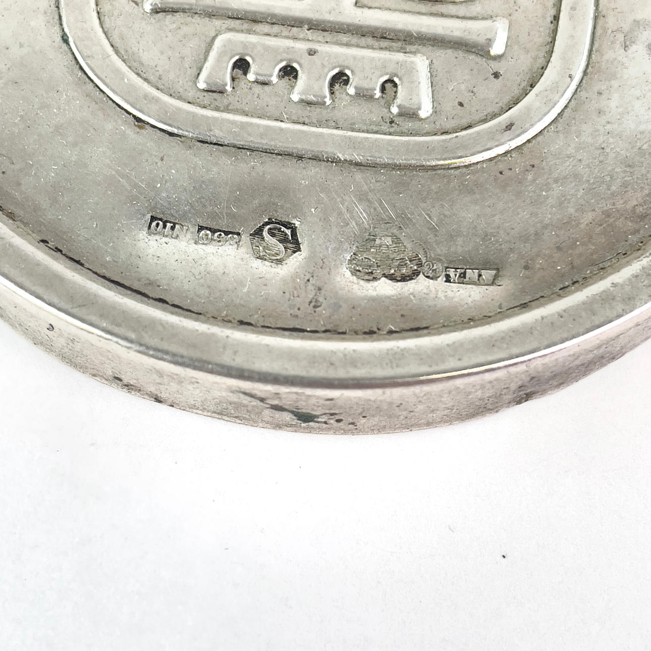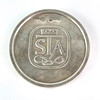 Lock till snusdosa, reliefdekor "STA", 830/1000 silver, Karana Ädelmetall AB, Helsingborg, 1987. Diameter ca 7 cm, vikt ca 12,5 gram.