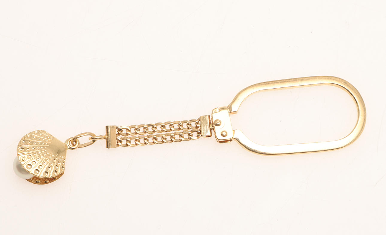 4295216. NYCKELRING, 18 KARAT GULD OCH ODLADE PÄRLOR.