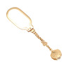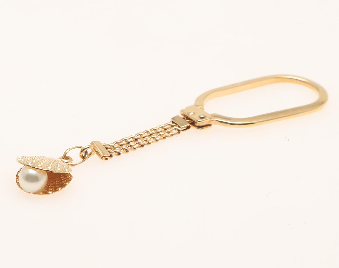 öppnas av en spänningsklämma, med en kort kedja som hänger upp ett stiliserat ostronskal, delvis öppnat för att avslöja en odlad pärla, 9 cm lång, 8,7 gram.