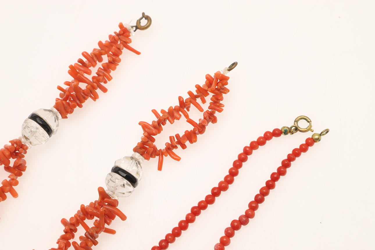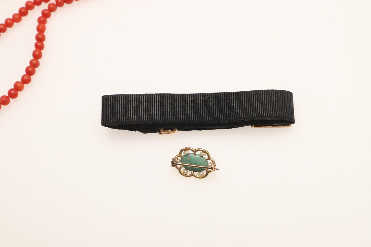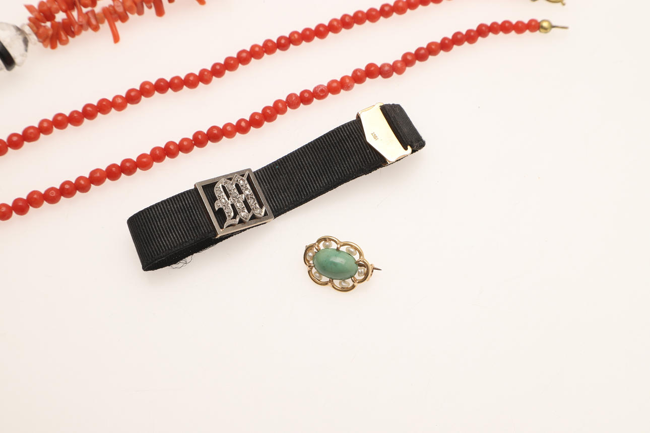 formad som två rader korallskärvor med kristalldistanser, med metalllås, 38,5 cm lång, 40,0 gram, tillsammans med ett korallpärlhalsband, med metalllås. 40cm långt, 11,4 gram, ett diamantinfatterat initialt armband, infattat i 15 karat guld på ett svart bandband, och en brosch i turkos, pärla och guld.