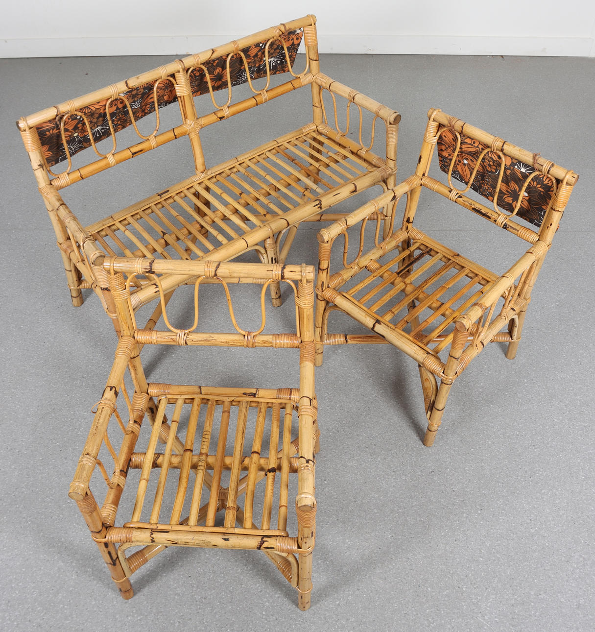 Bestående av: Soffa: längd 130, sitthöjd 46 cm 2 fåtöljer, sitthöjd 46, rygghöjd 84 cm Bord, längd 110, bredd 61, höjd 62 cm.