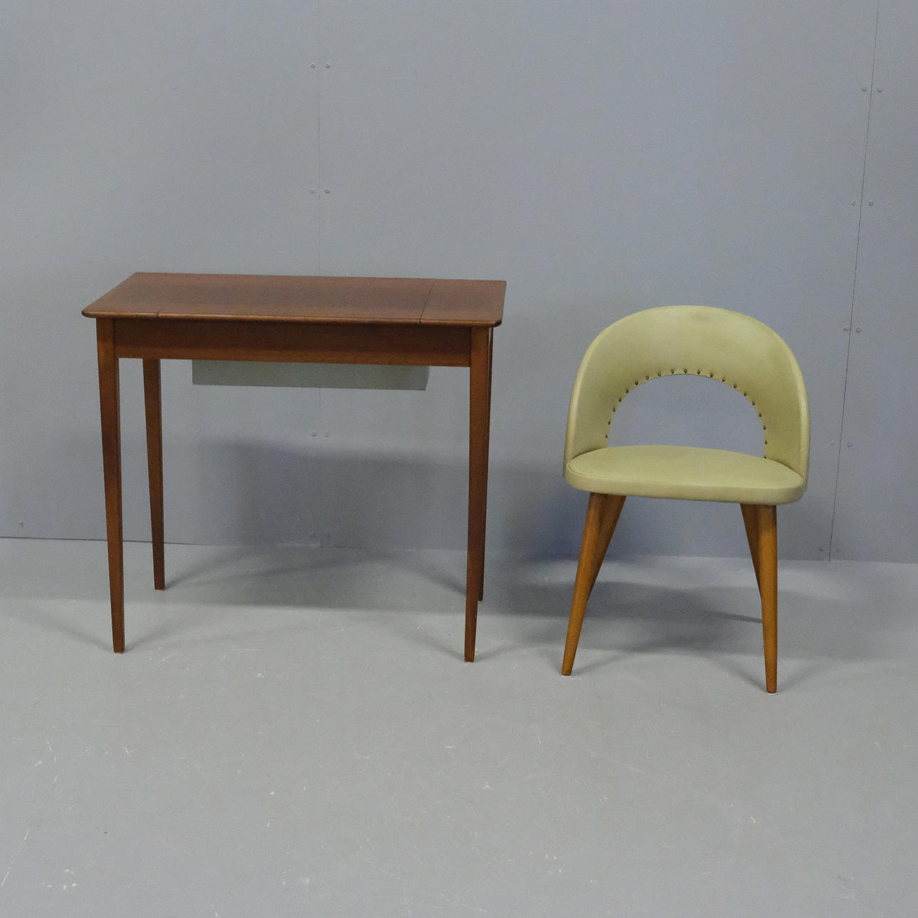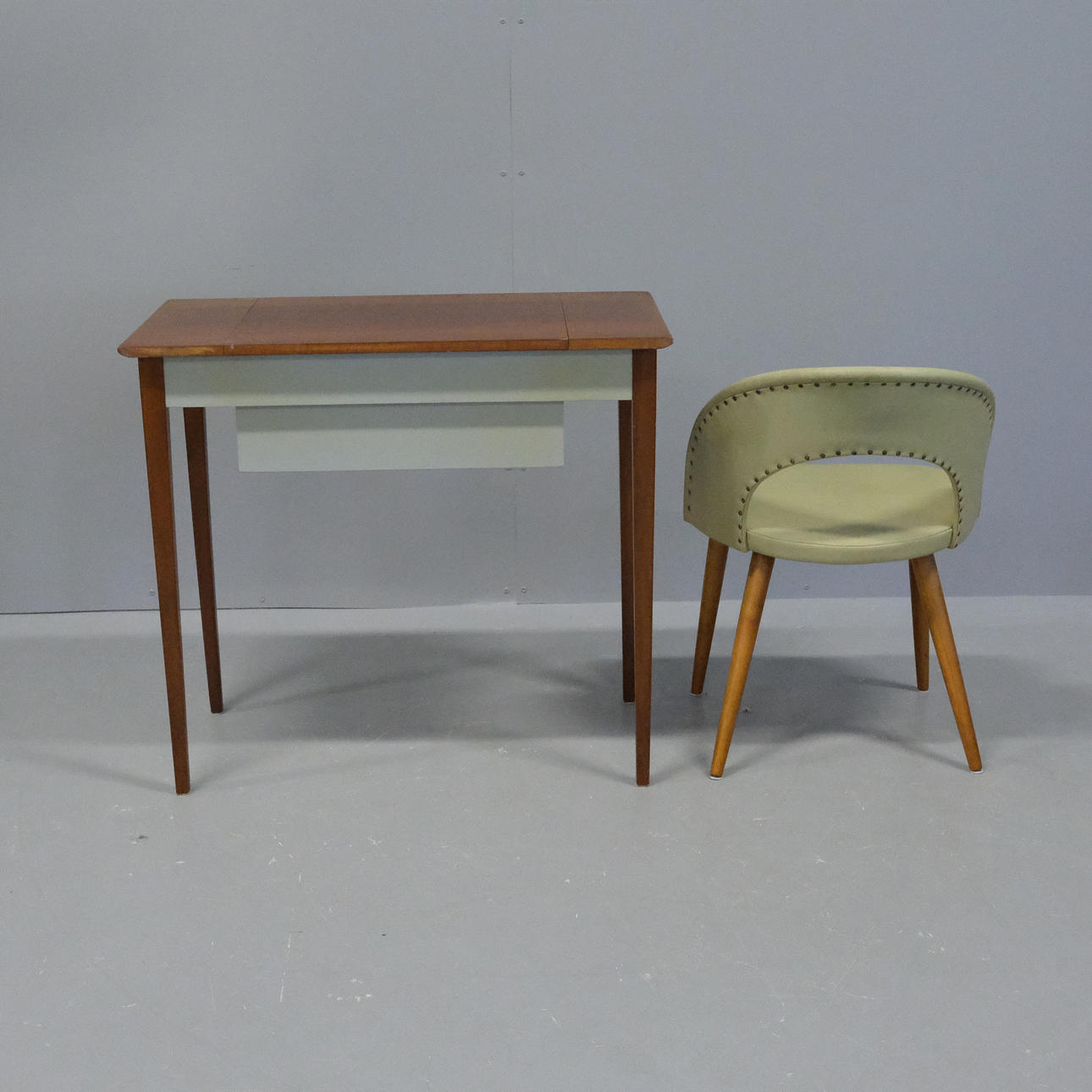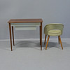Sminkbord, höjd 71cm, bredd 80cm, längd 44cm. Stol, galon, höjd 67cm, sitthöjd 41cm, bredd 50cm.