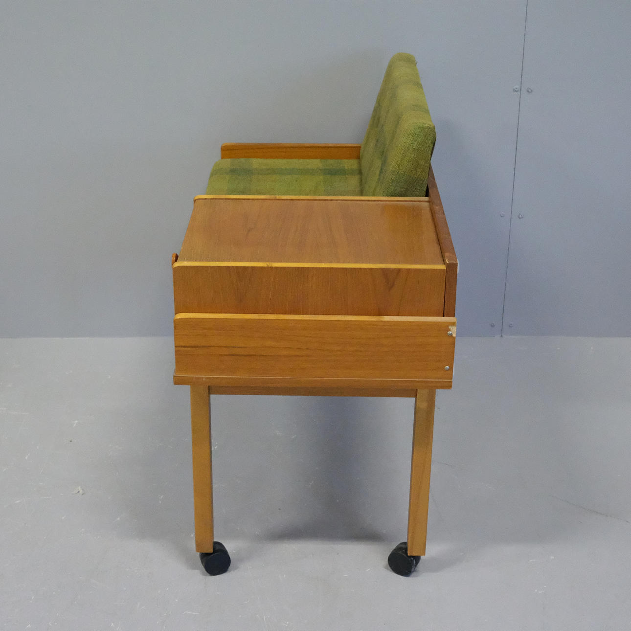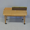 På hjul, en utdragslåda. Höjd 66cm, sitthöjd 45cm. Bredd 80cm, djup 40cm.