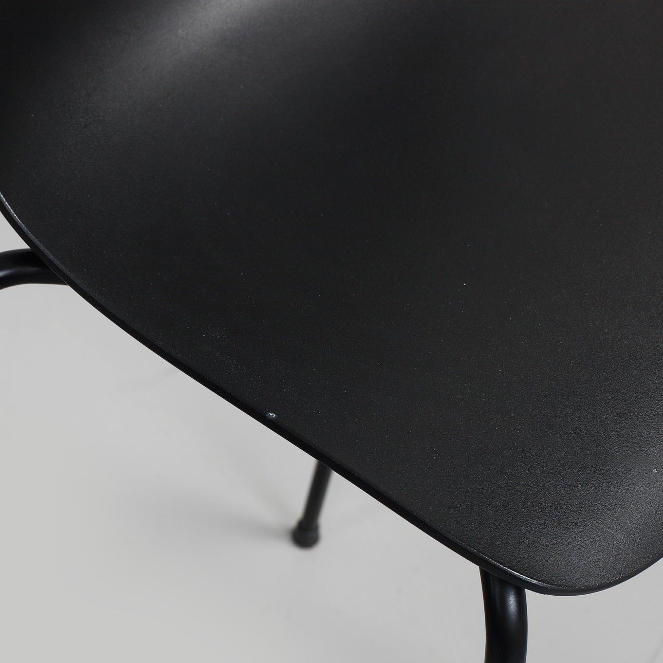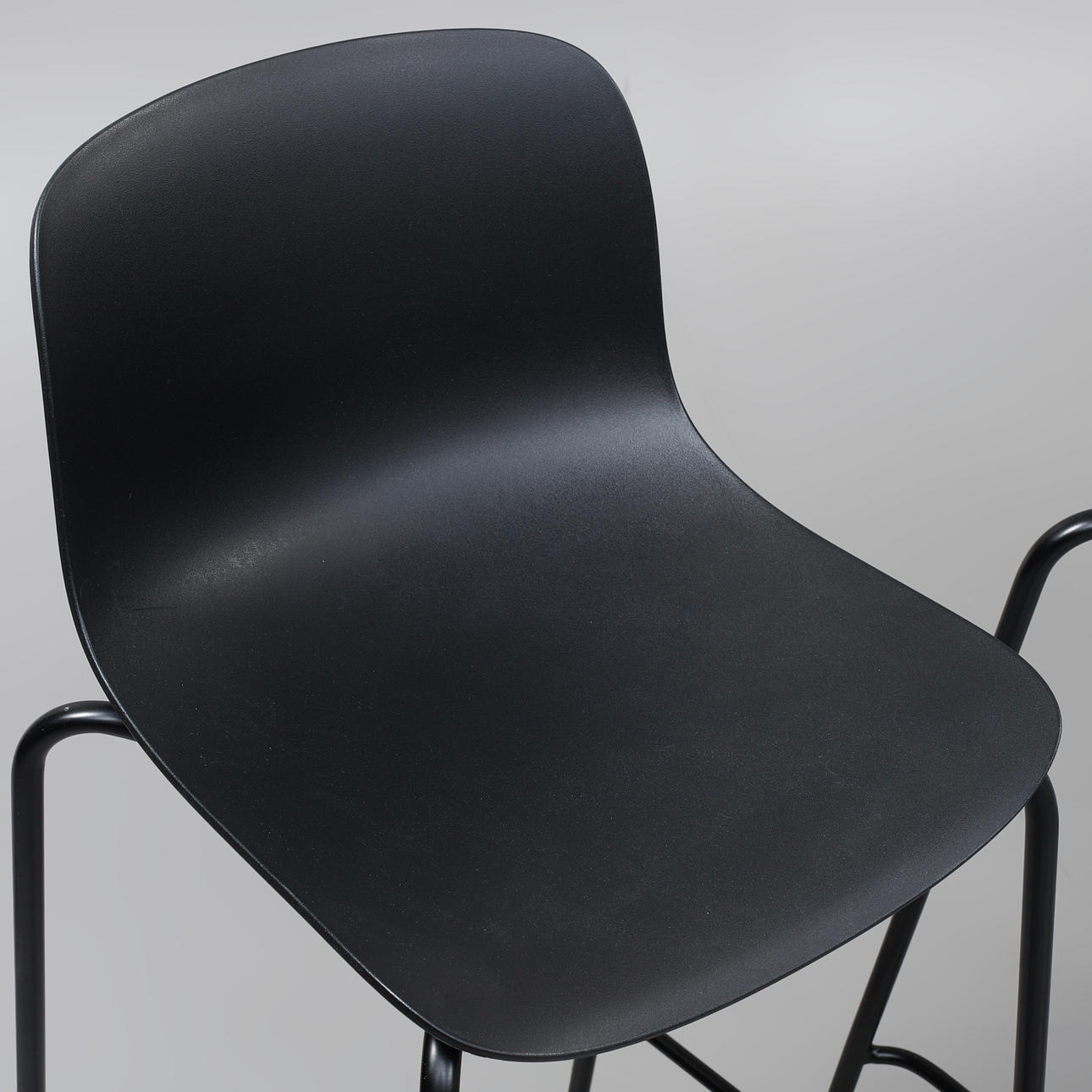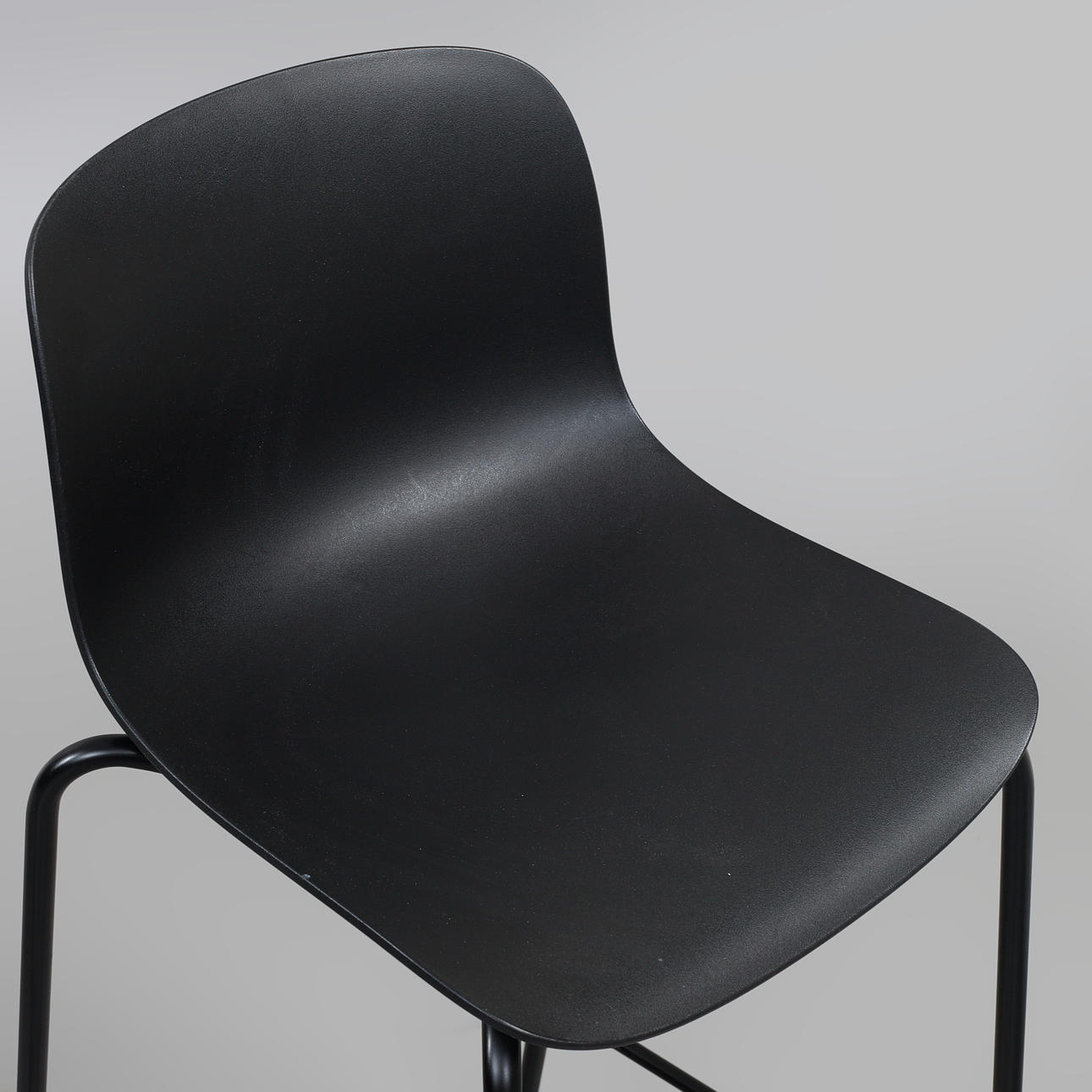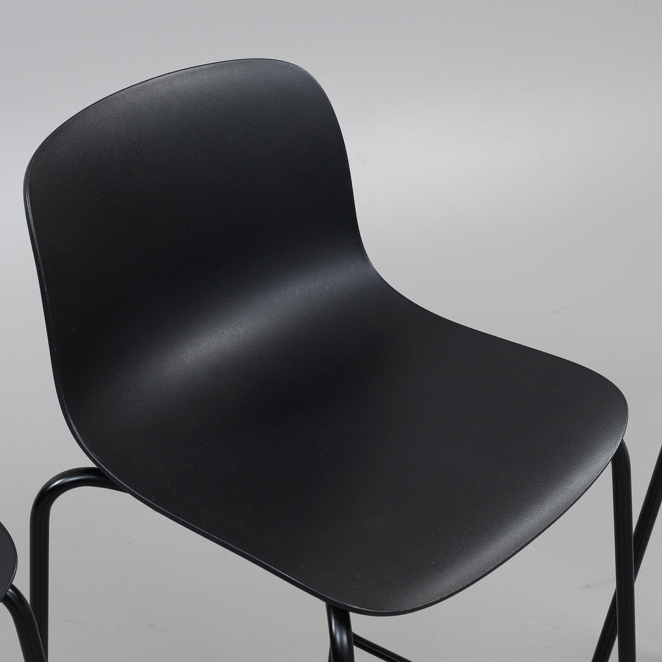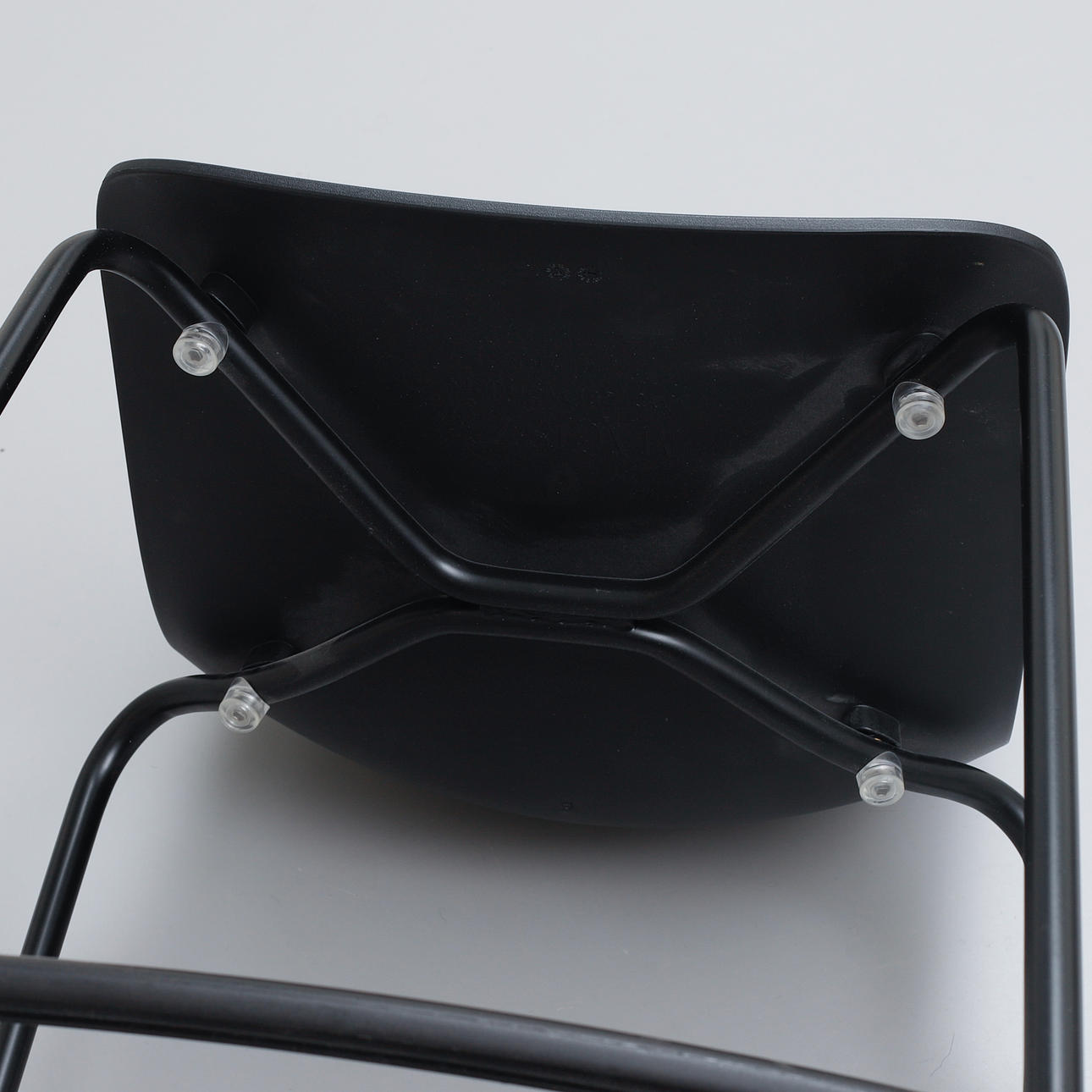 Stomme i stålrör, sitsar i formpressad plast. Sitthöjd ca 74, rygghöjd ca 99, bredd ca 38, djup ca 49 cm. Runda dynor i fårskinn från Scandilock Design medföljer.