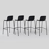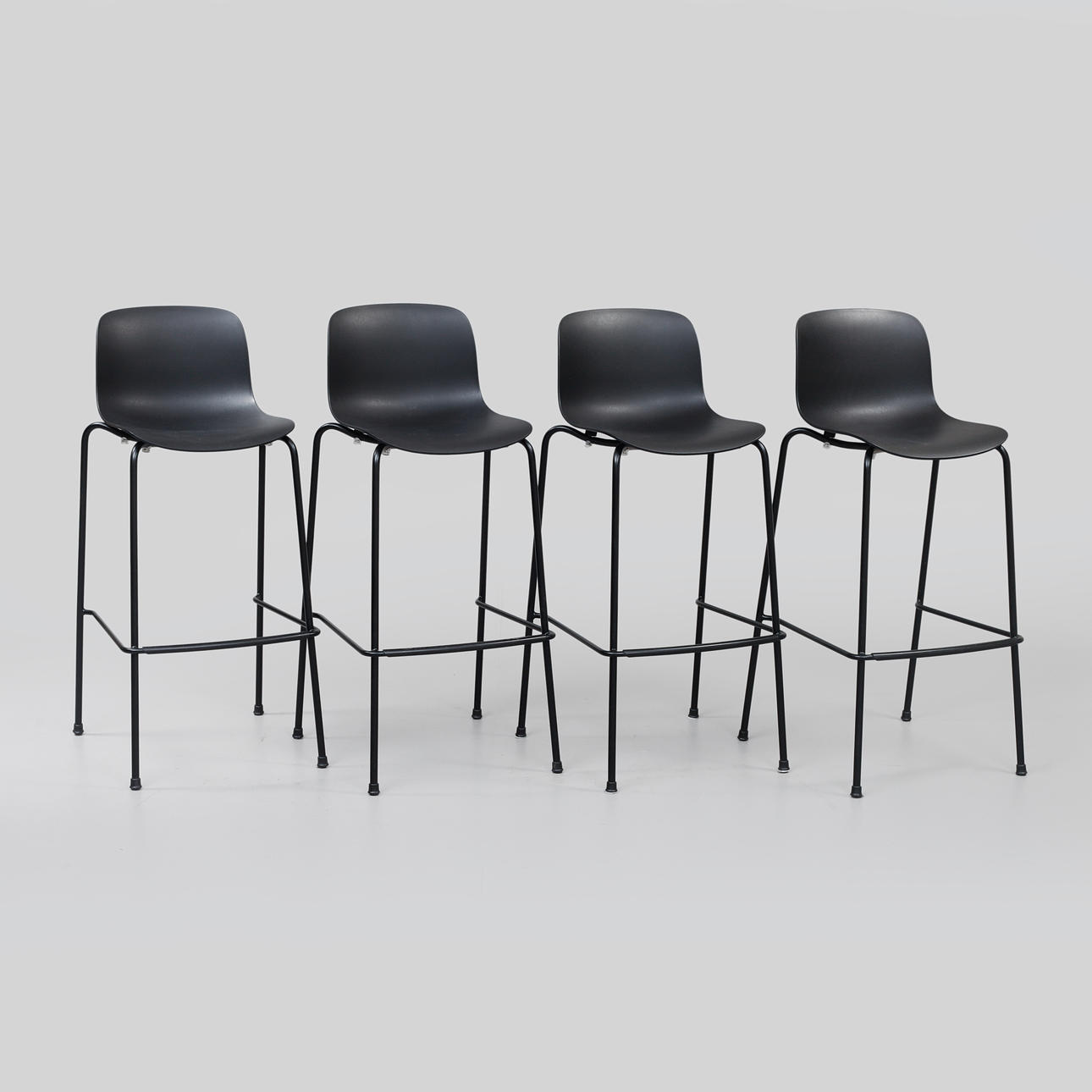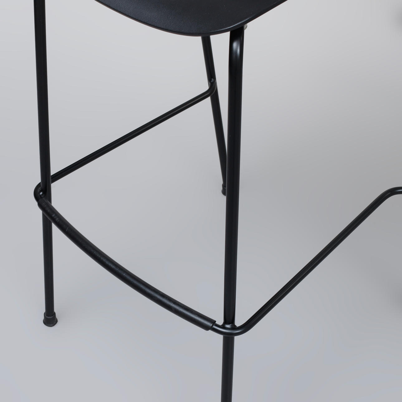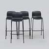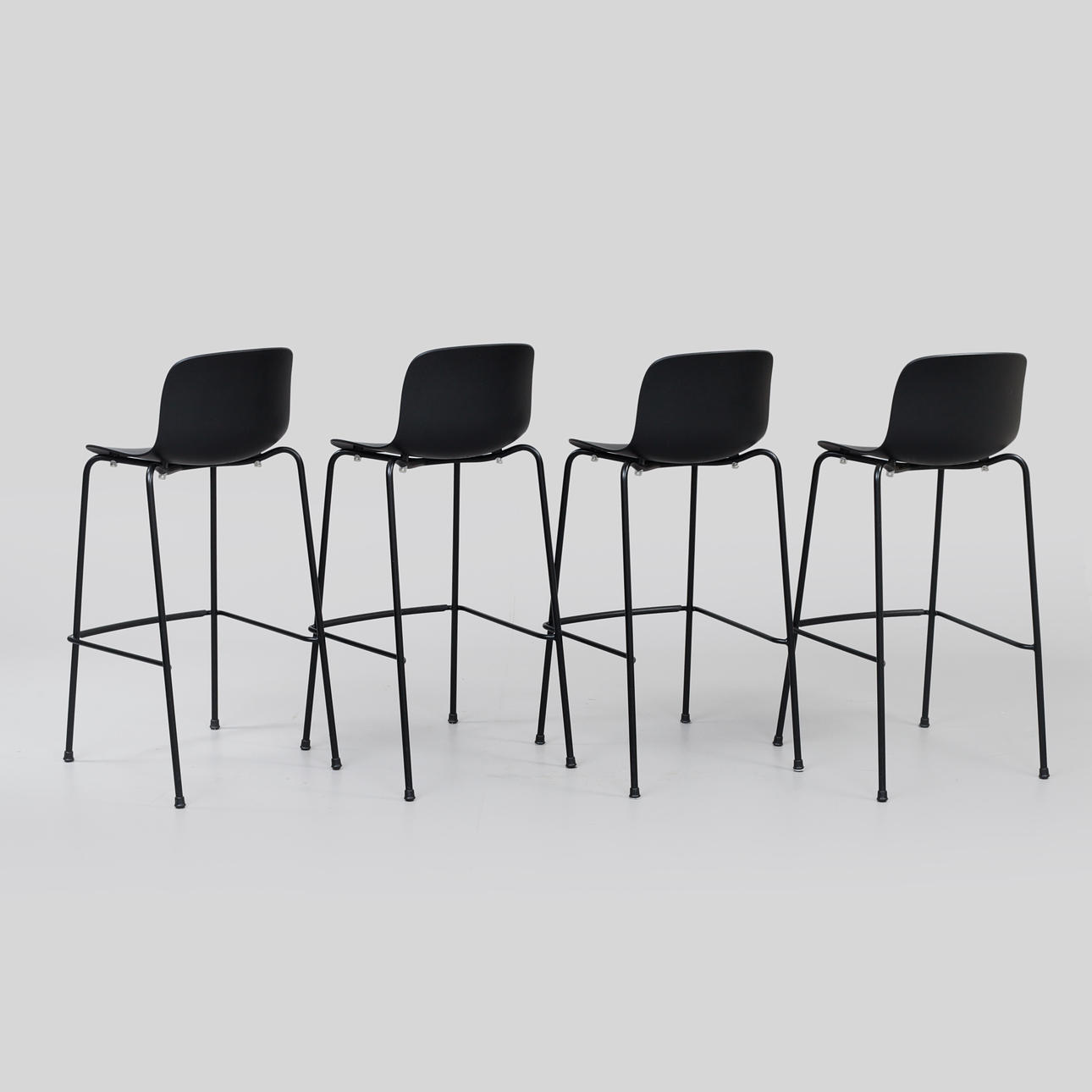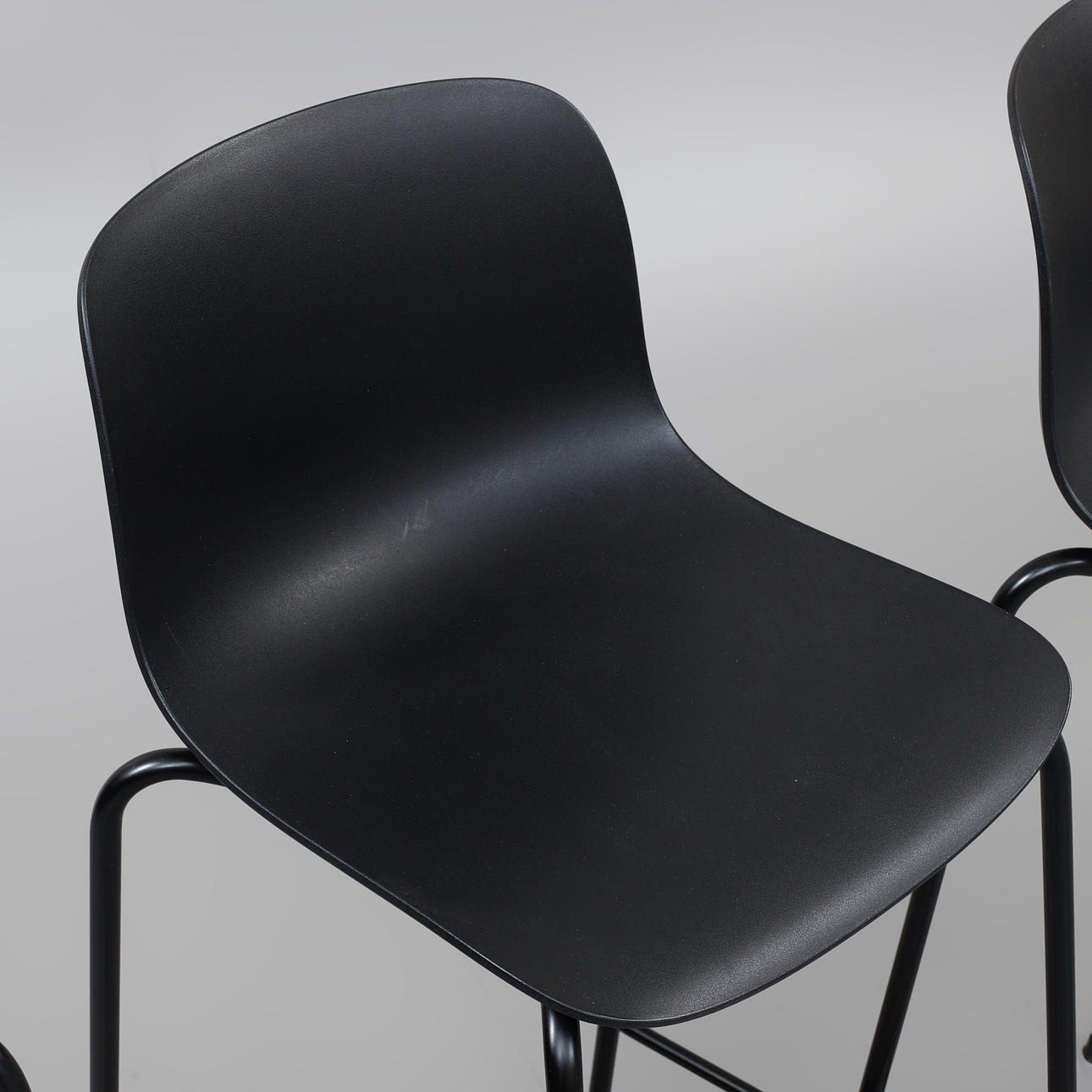 Stomme i stålrör, sitsar i formpressad plast. Sitthöjd ca 74, rygghöjd ca 99, bredd ca 38, djup ca 49 cm. Runda dynor i fårskinn från Scandilock Design medföljer.