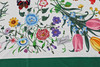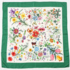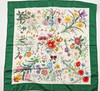 Handrullad kant, blomstermotiv och insekter på ljus botten med grön kant. Tryckt "Gucci" samt "V. Accornero". 100% siden. Ca 86x86 cm.