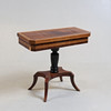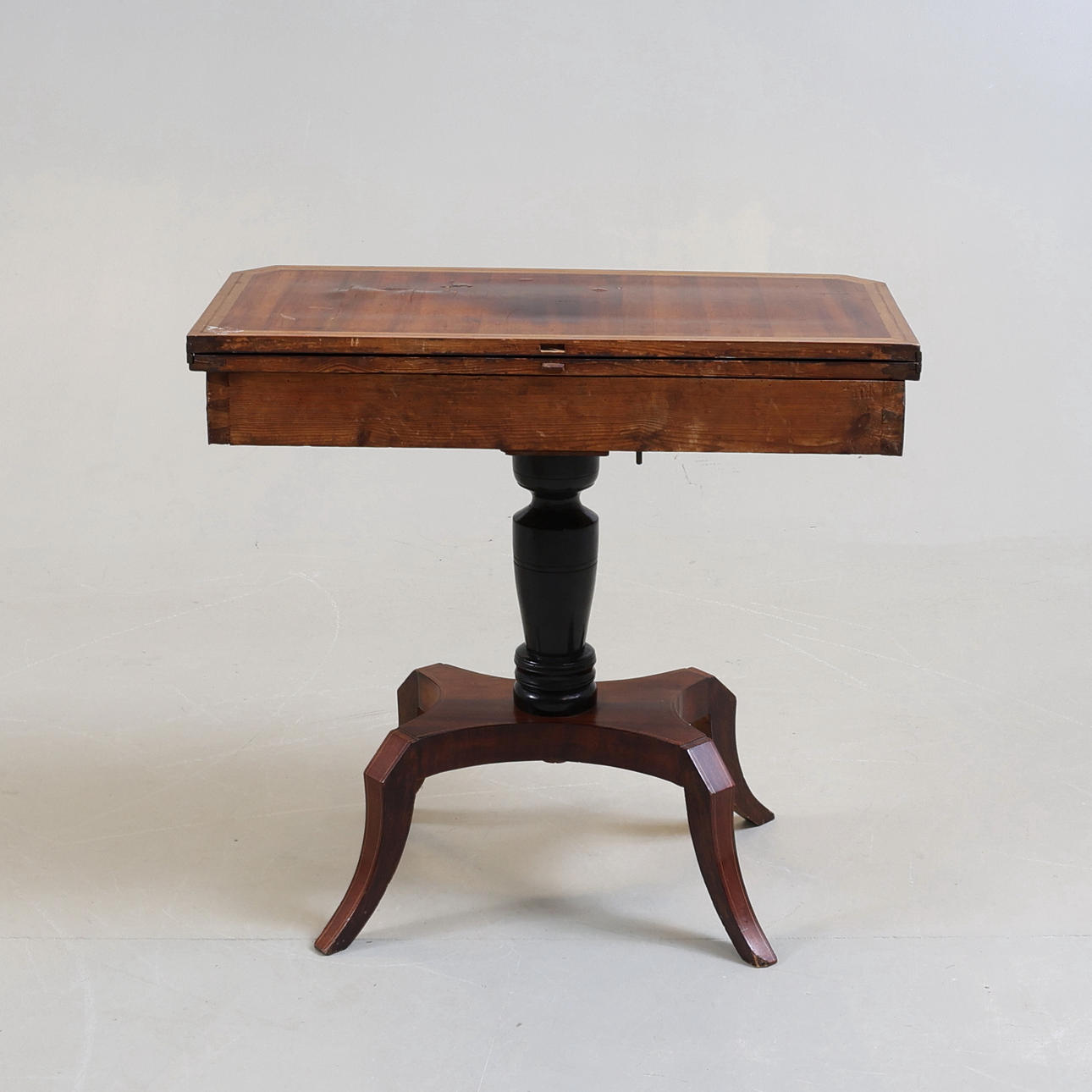 Fanerad. Vrid- och utfällbar bordsskiva. Underliggande förvaring.