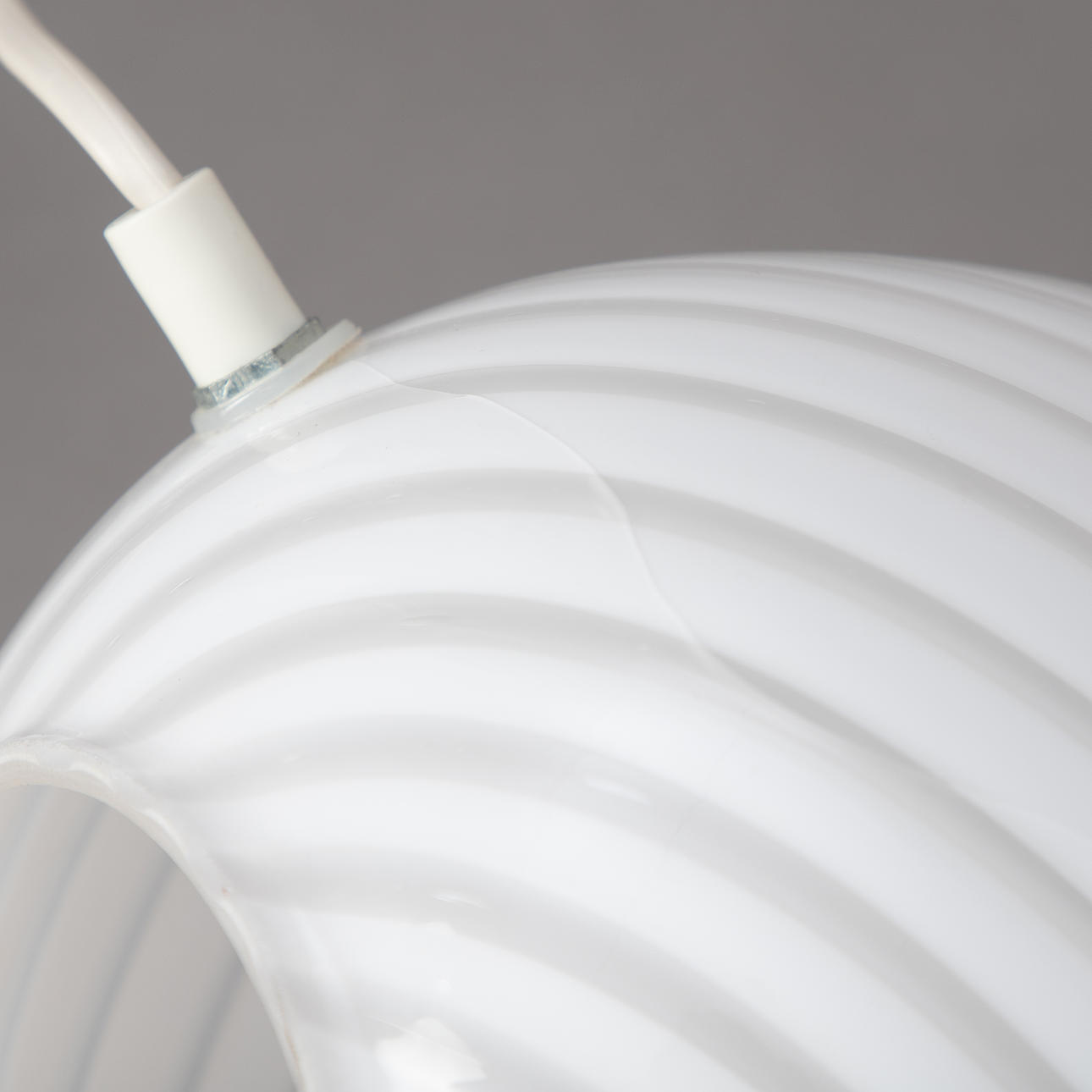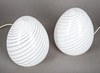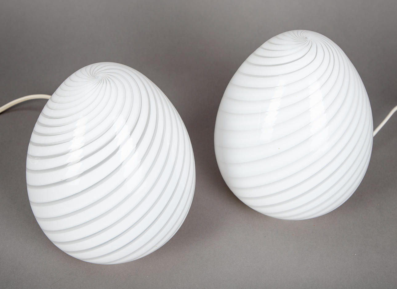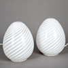 Par äggformade Murano-glasbordslampor i vitt med Rigadin Ritorto - spiraldekoration. En brännare i taget, E14-uttag.