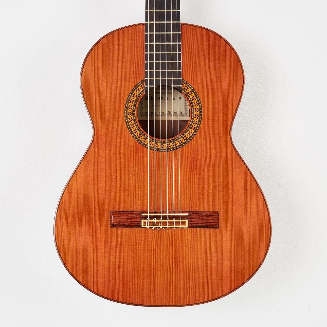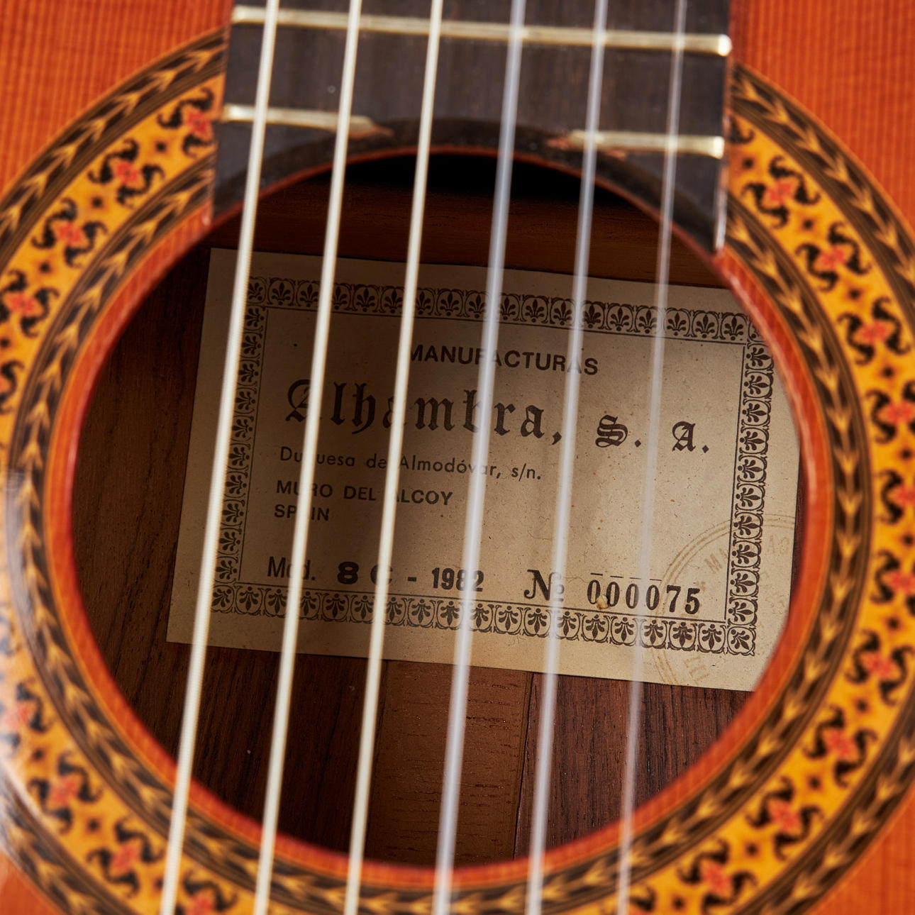 ALHAMBRA, modell 8C, klassisk nylonsträngad gitarr med lock i solid ceder, sidor och botten indisk rosewood, tillverkad i Spanien, Muro de Alcoy, ca 1982, med hårt fodral.
