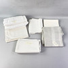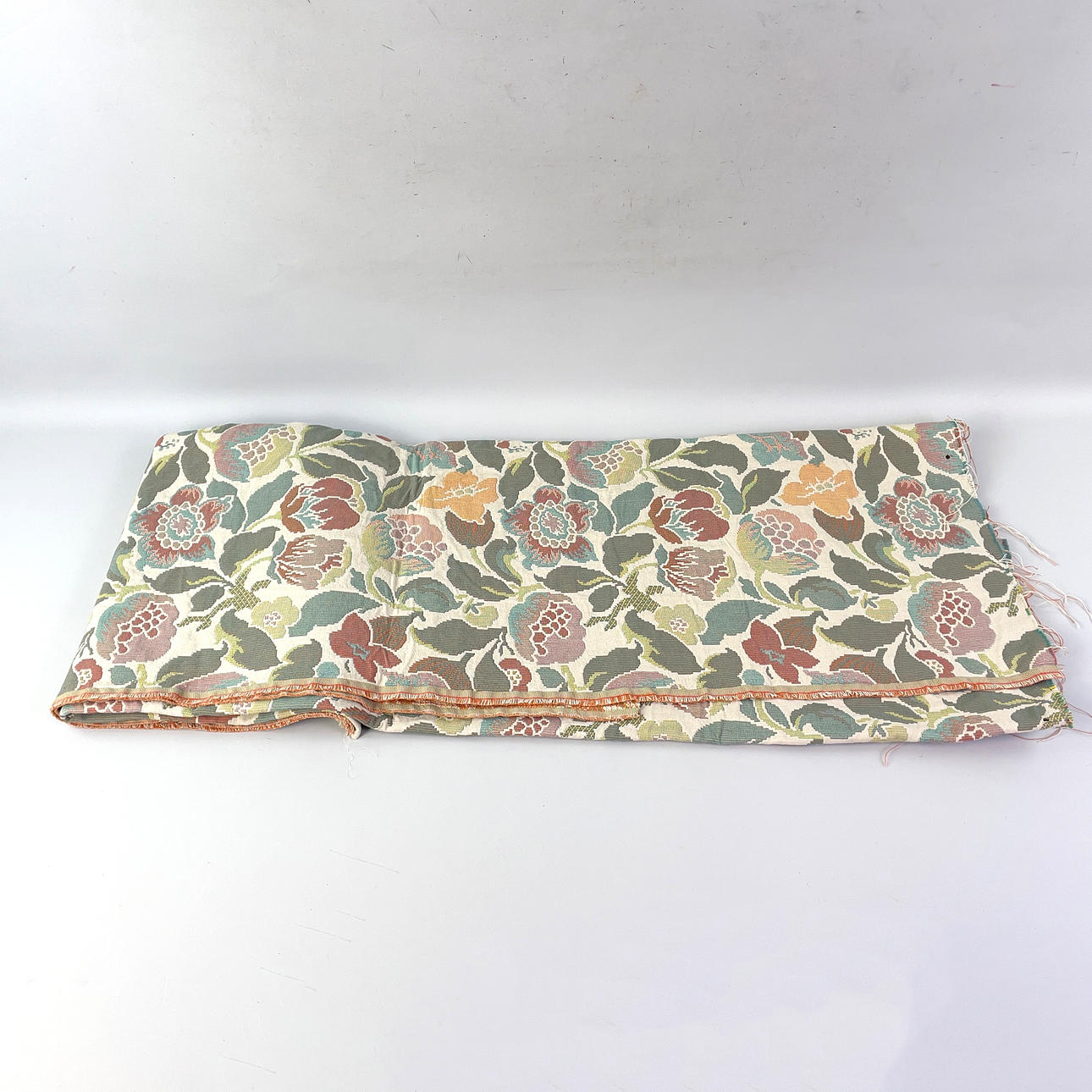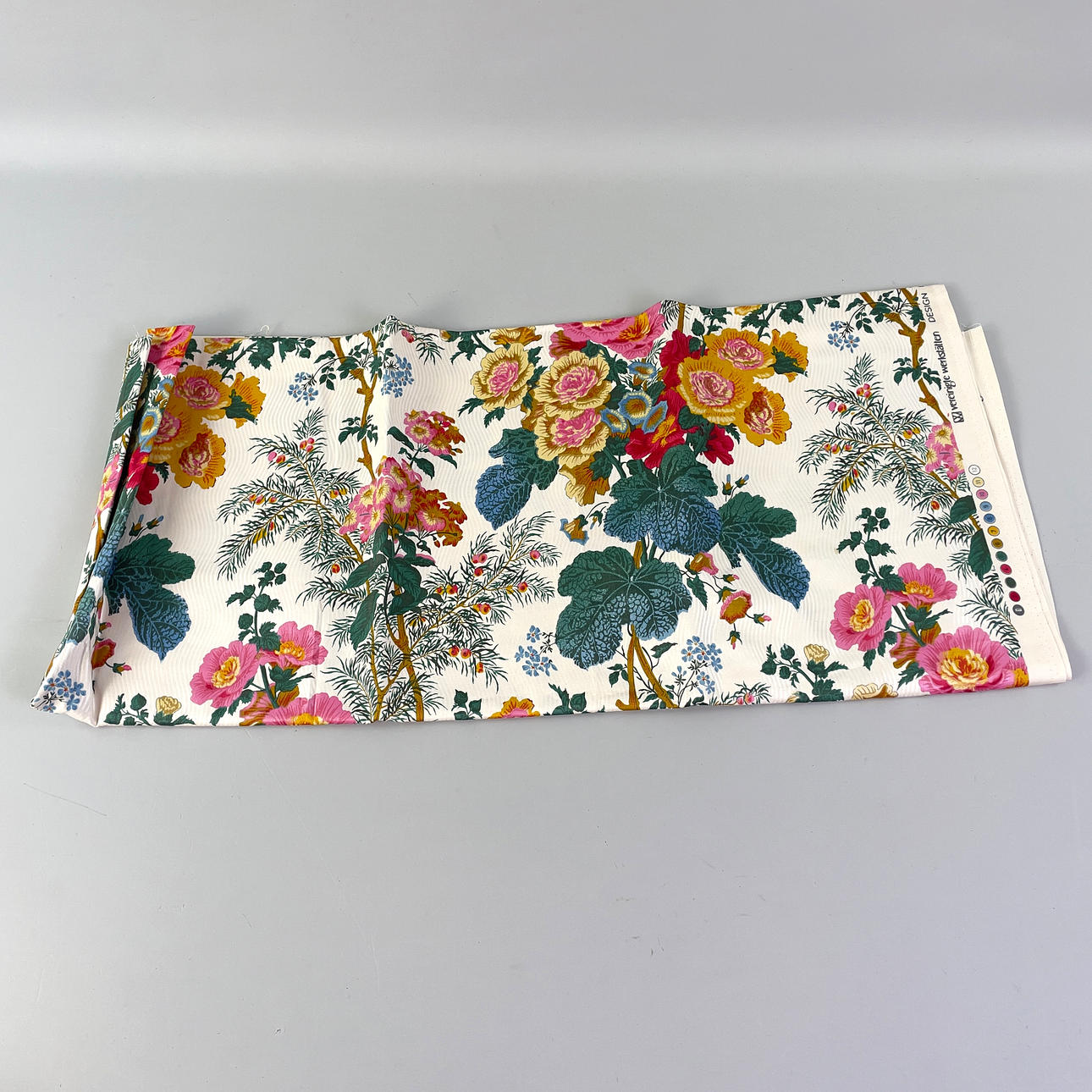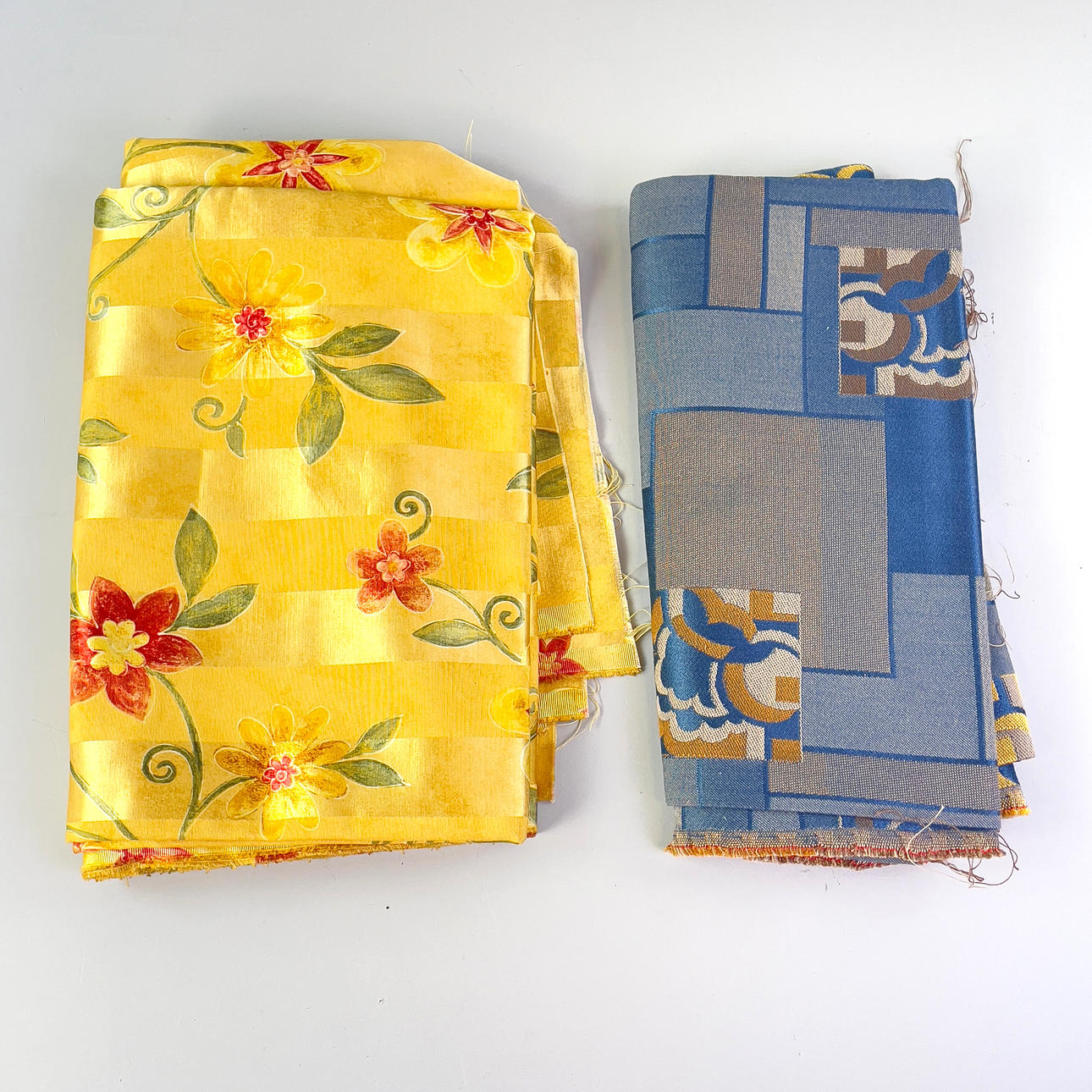 Ett parti tyger i en flyttkartong. Bestående av dukar i olika storlekar samt stuvbitar i större storlekar. Mått flyttkartong: 59 x 39 x 40 cm.