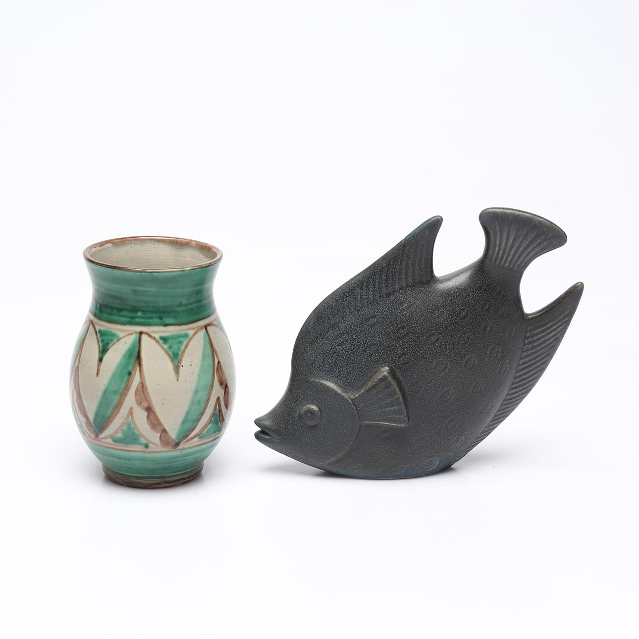 Längd ca 25 cm. Fisk samt dopping, stengods, Gunnar Nylund Vas, Kosta, Vicke Lindstrand. Vas, lergods, Bo Fajans.