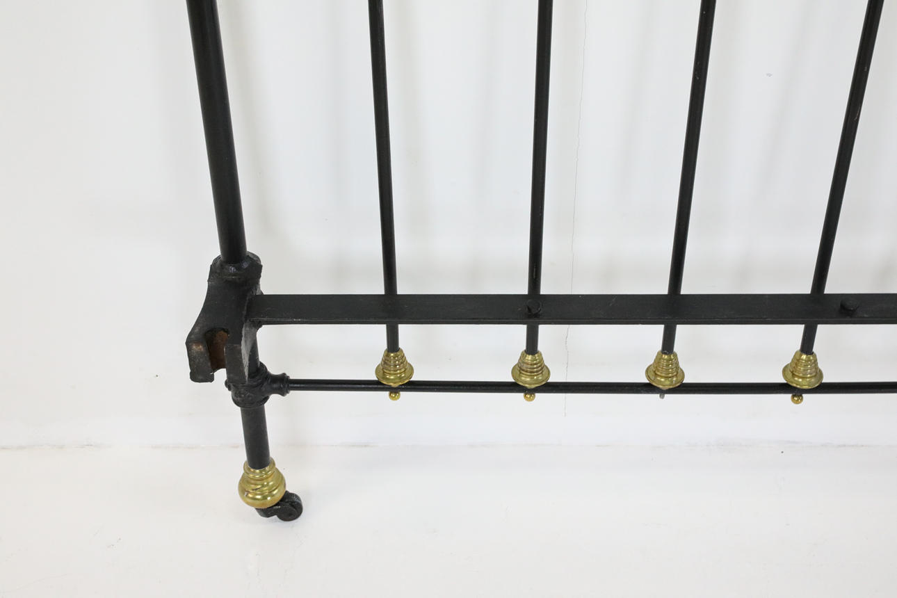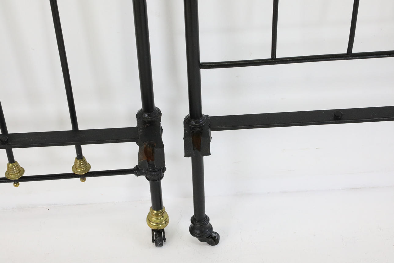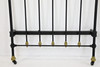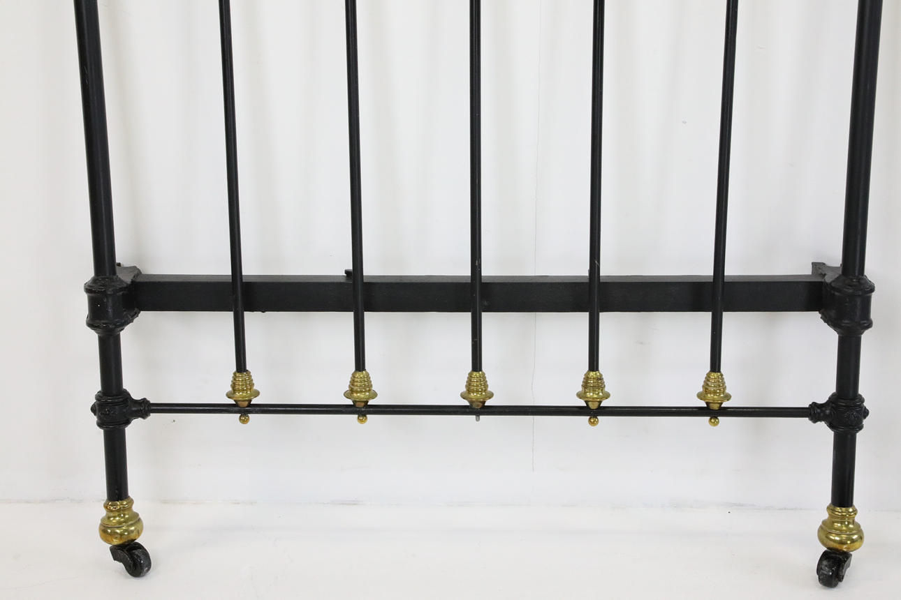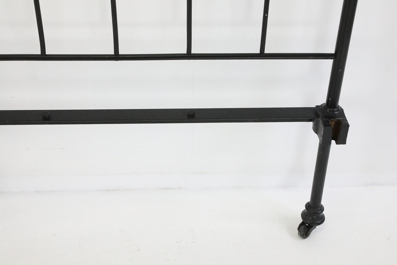 På hjultrissor. Höjd huvudgavel 140 cm Höjd fotgavel 113 cm Bredd 90 cm Längd ca 172 cm.