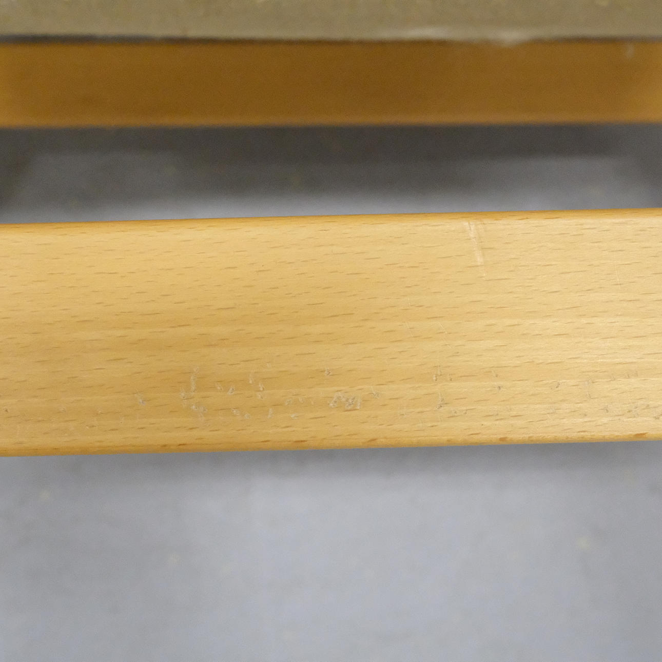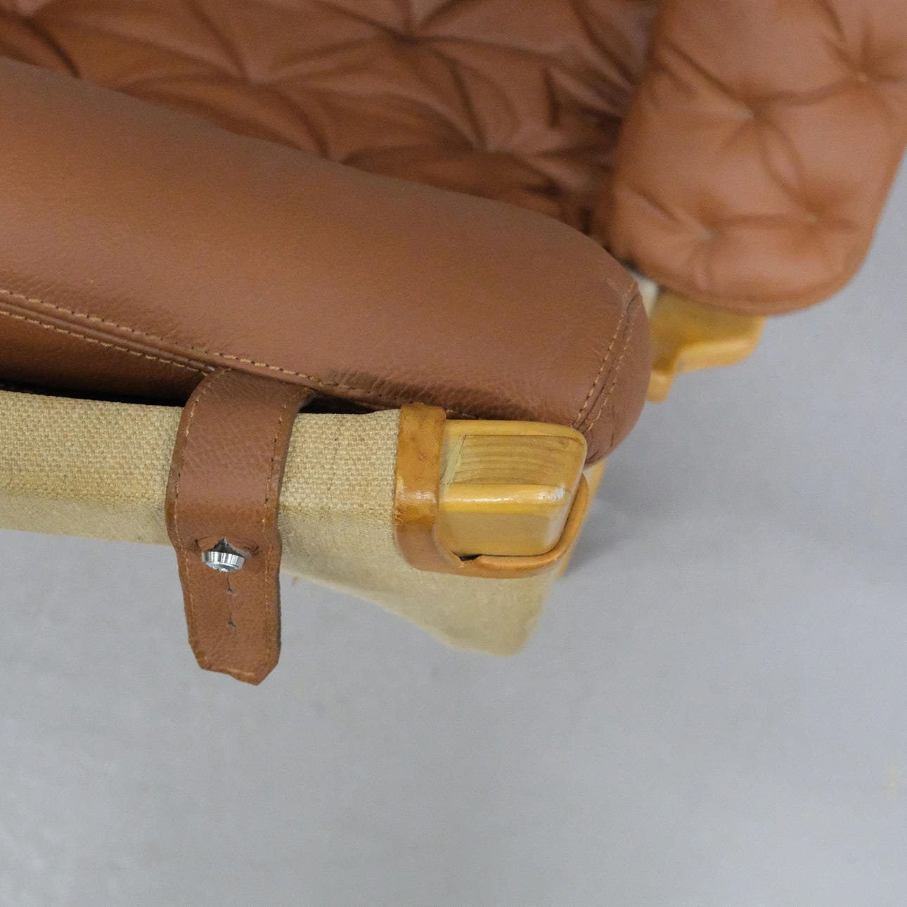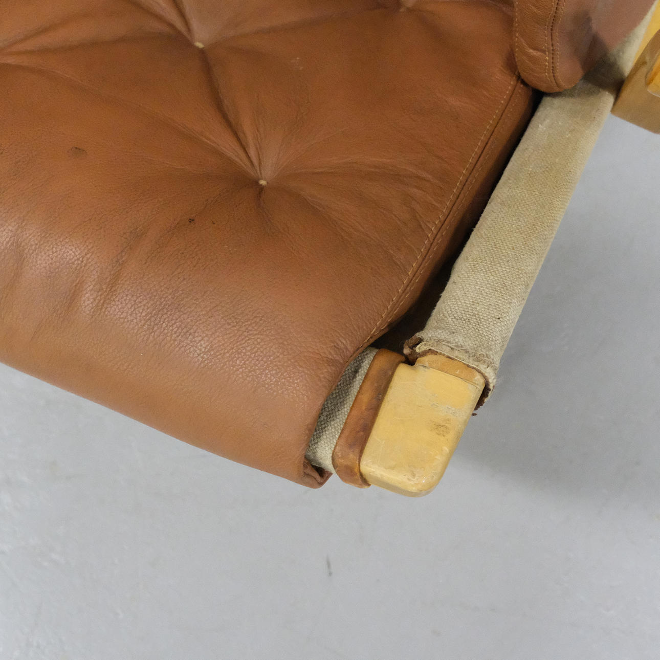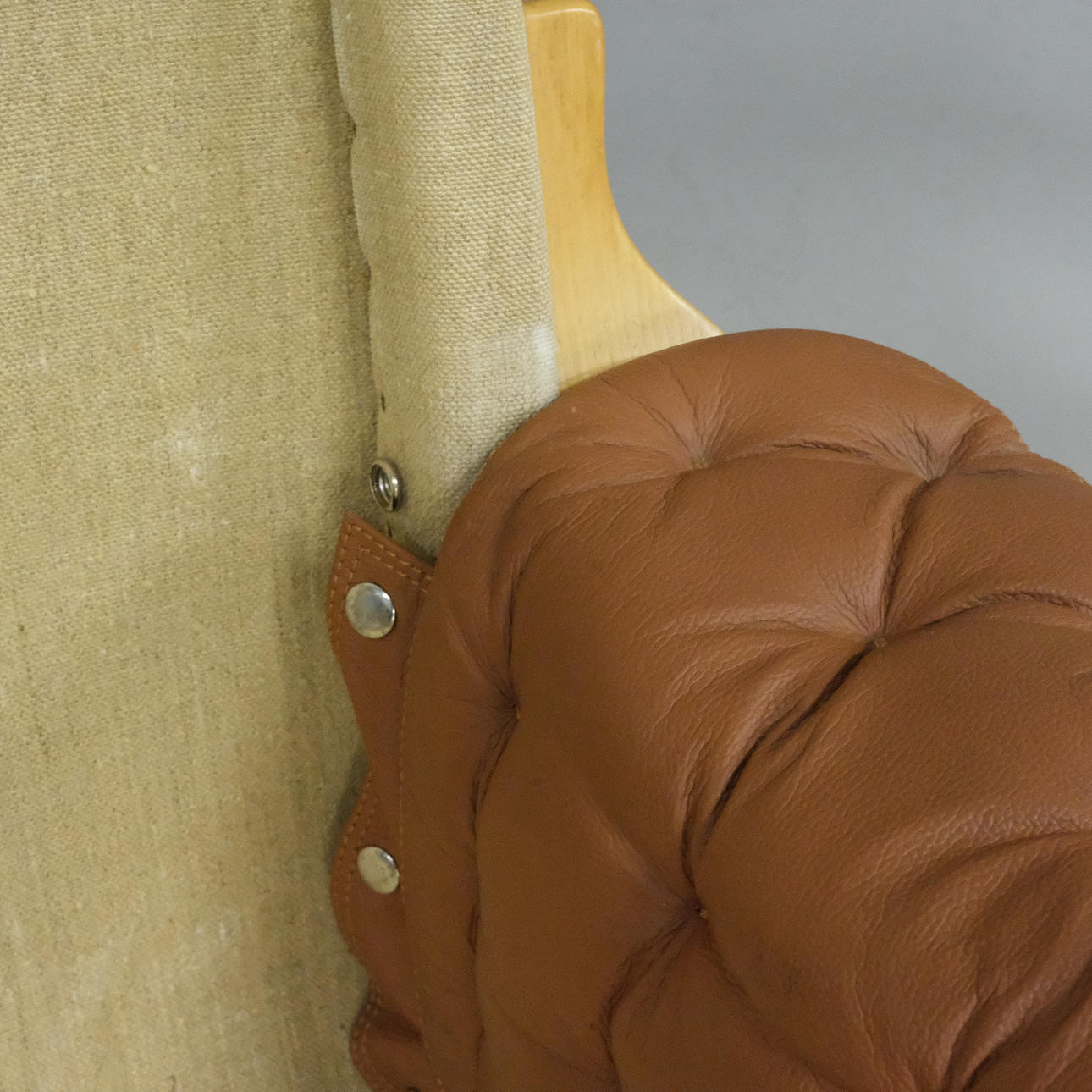 Bruksslitage och märken förekommer. Cognacsfärgad klädsel med lätt patina samt baksidan med fel kardborre-sida. Ett hörn har släpp i böjträet, och i det andra hörnet saknas läderskyddet på canvas-klädseln. Armstödens knäppfästen har dålig passform till stommen.