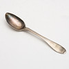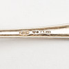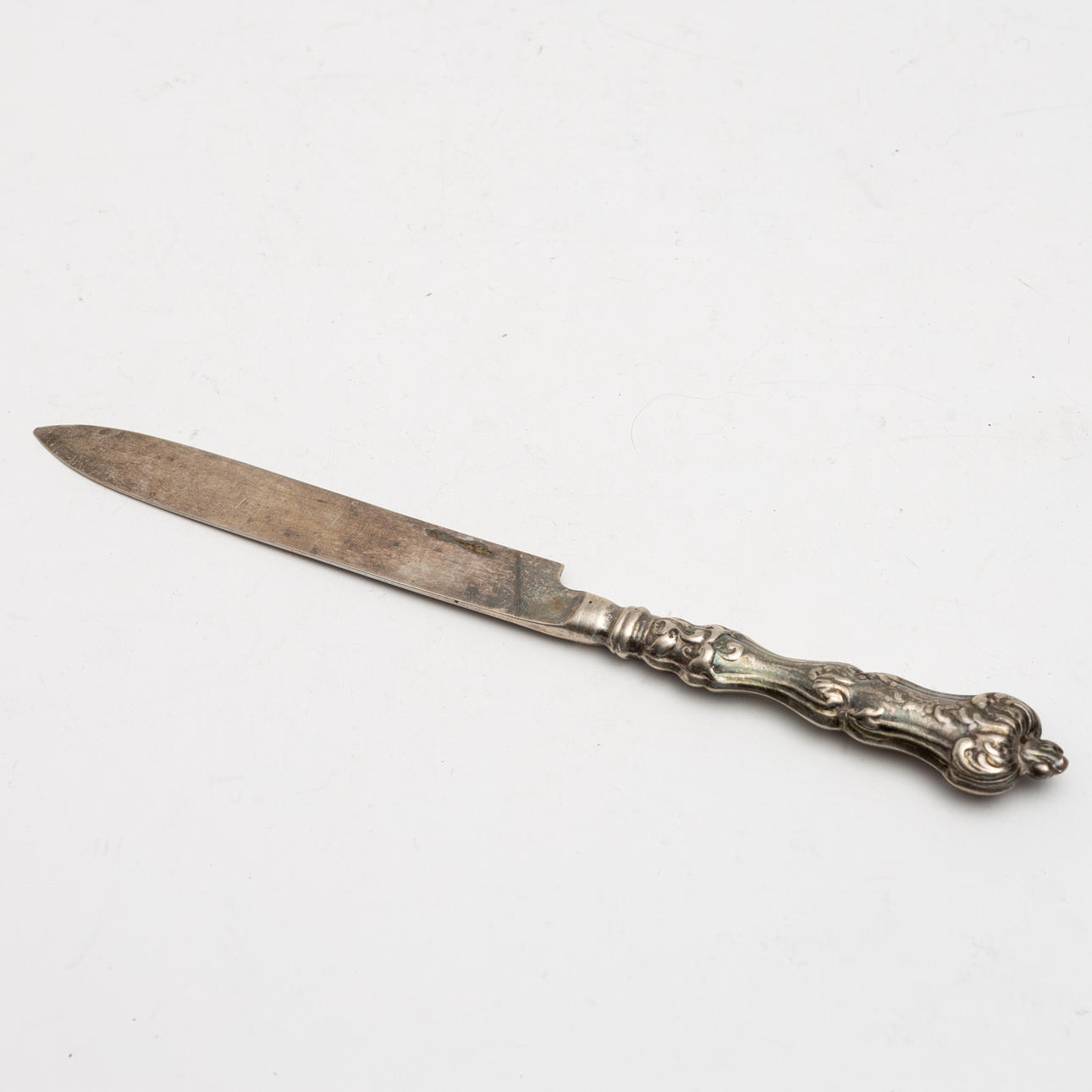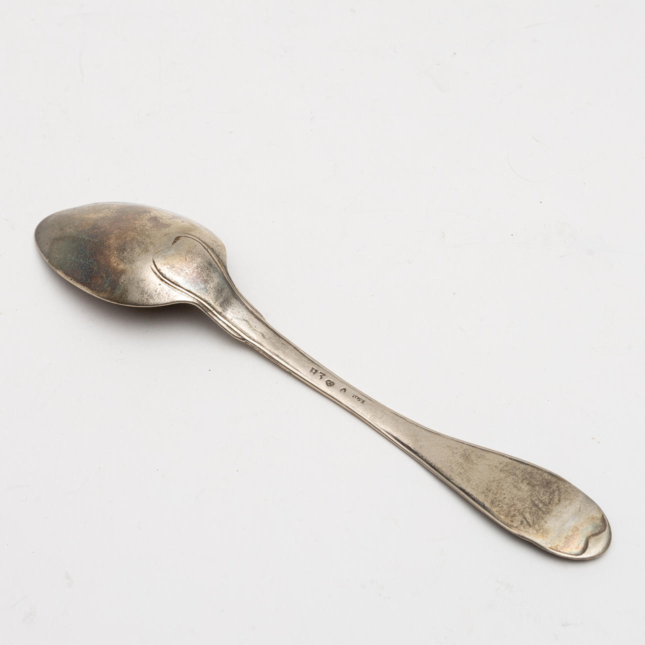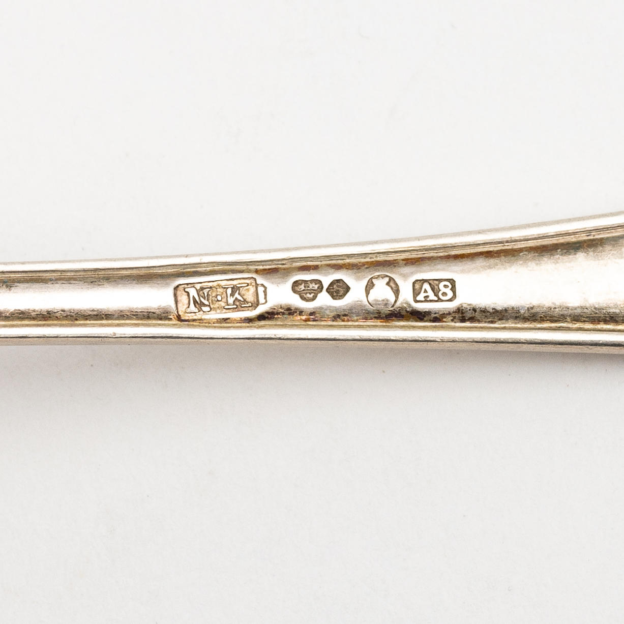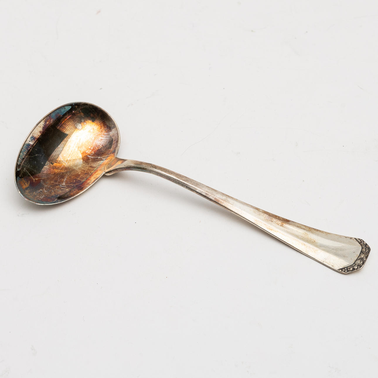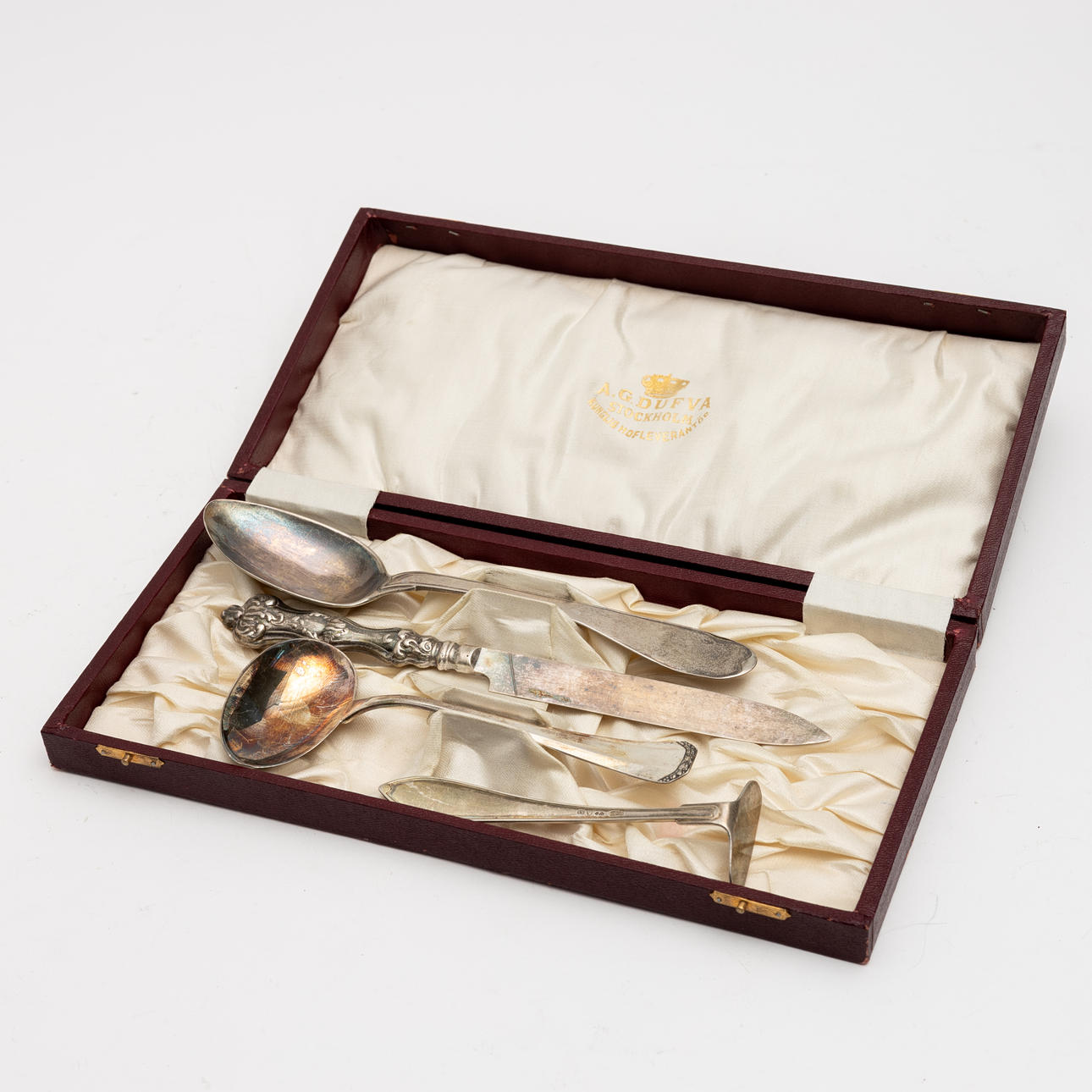 Kniv, längd ca 19 cm. Påpetare, längd ca 10,5 cm. Sked, längd ca 13,5 cm. Sked, längd ca 18 cm. Totalvikt ca 98 g. I ask.