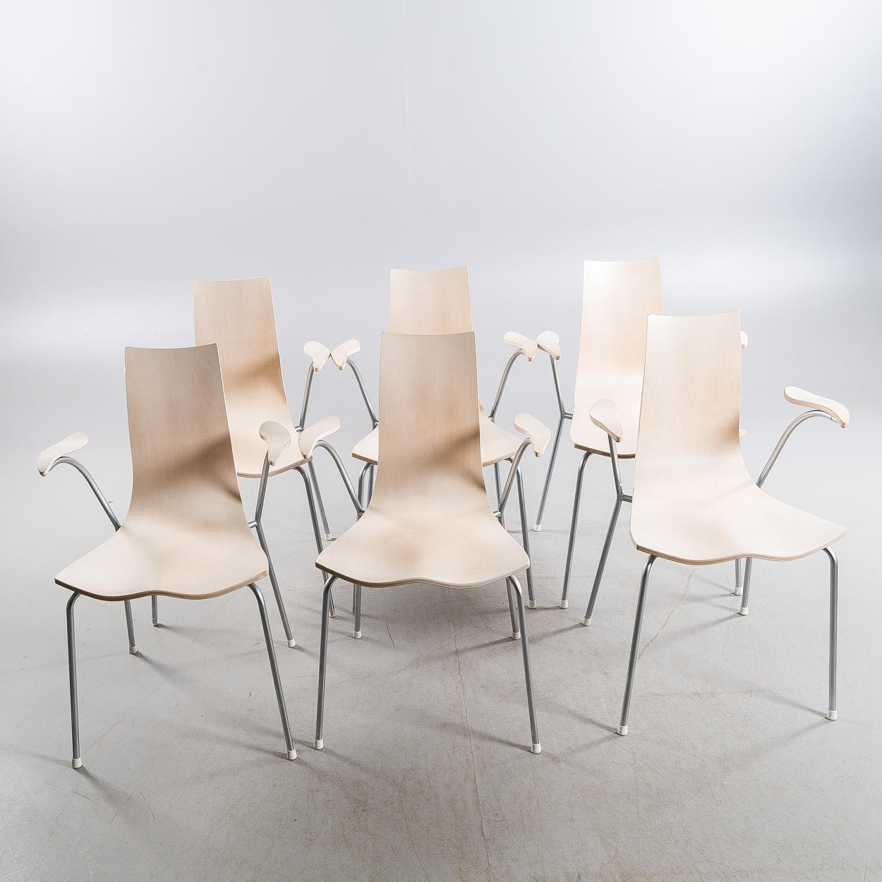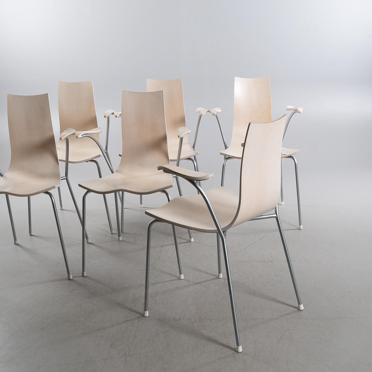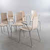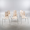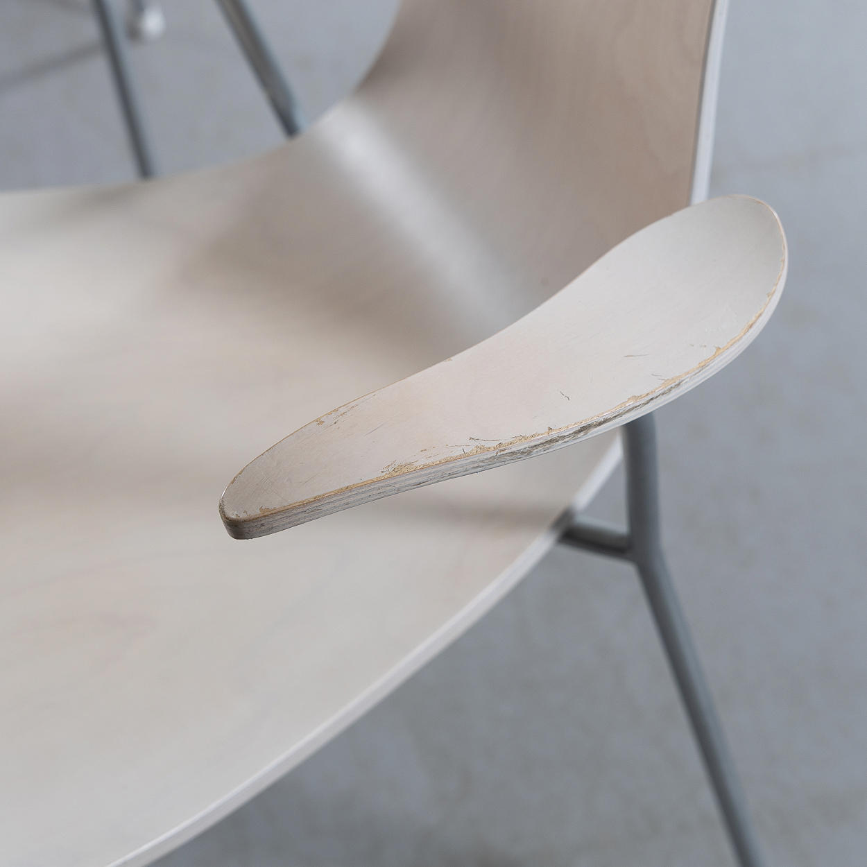 Sits och armstöd i formpressat trä. Underrede i metall. Sitthöjd 46 cm, rygghöjd 82 cm, bredd 56 cm.