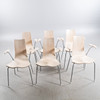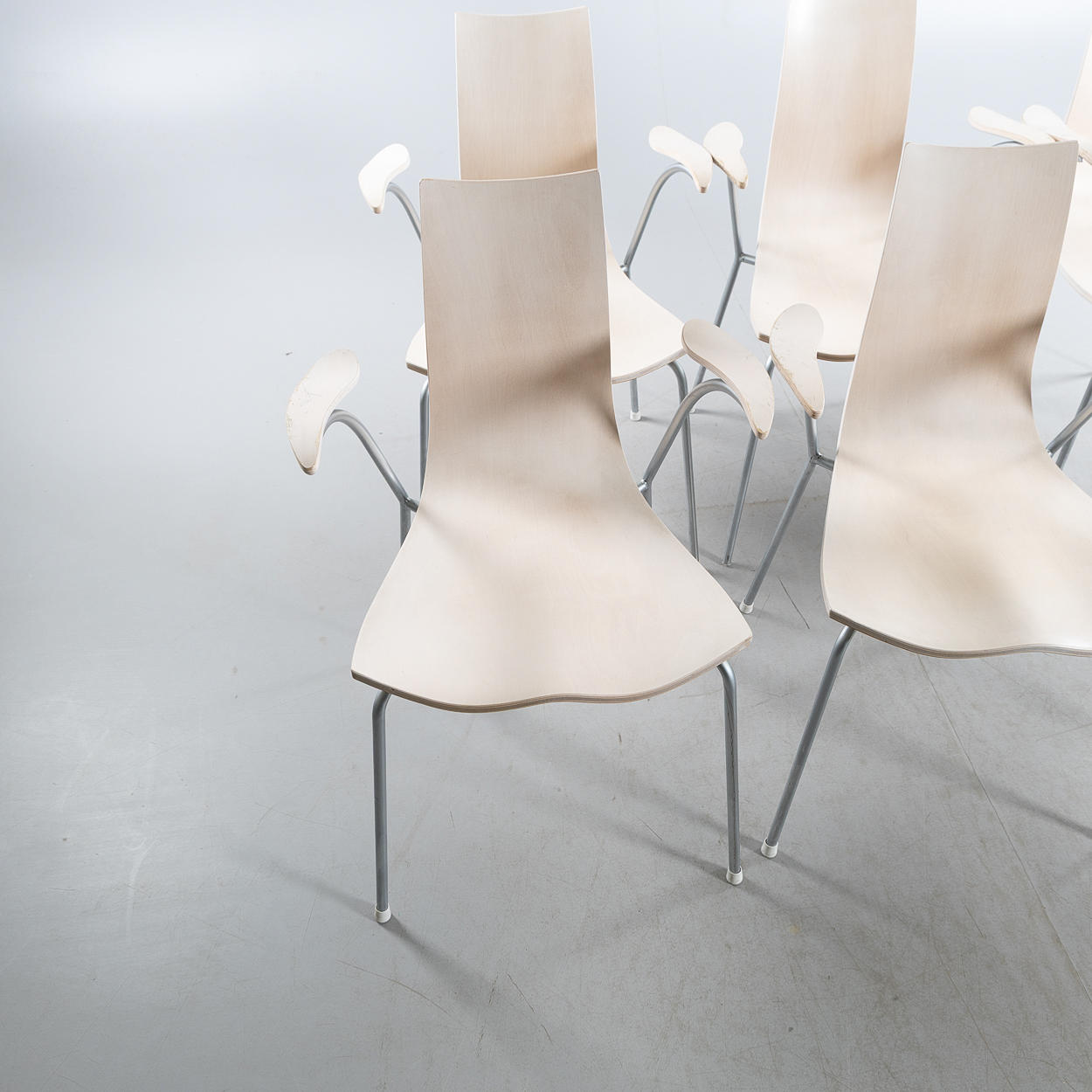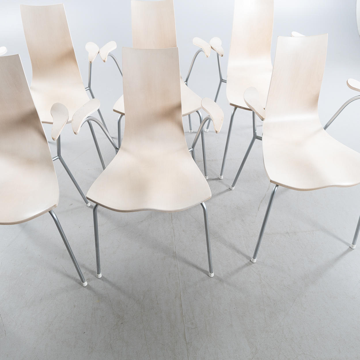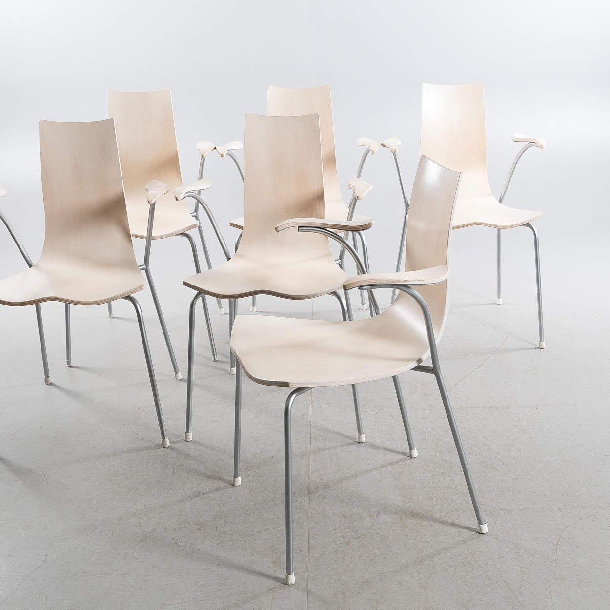 Sits och armstöd i formpressat trä. Underrede i metall. Sitthöjd 46 cm, rygghöjd 82 cm, bredd 56 cm.