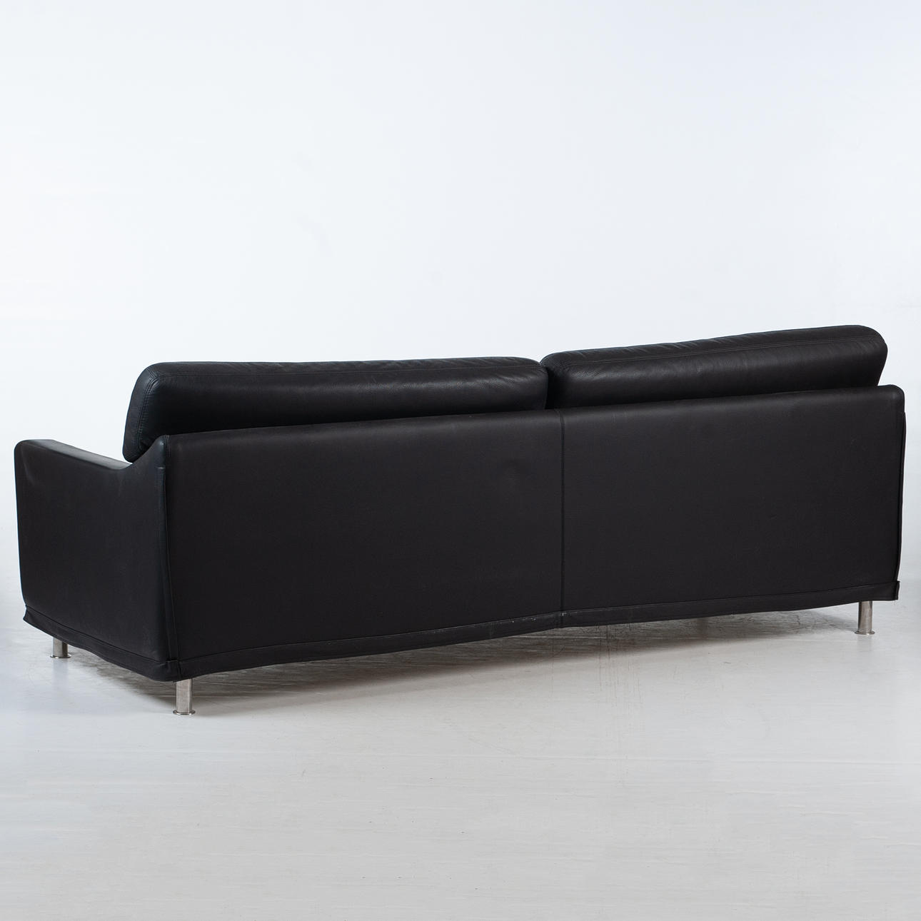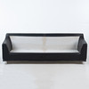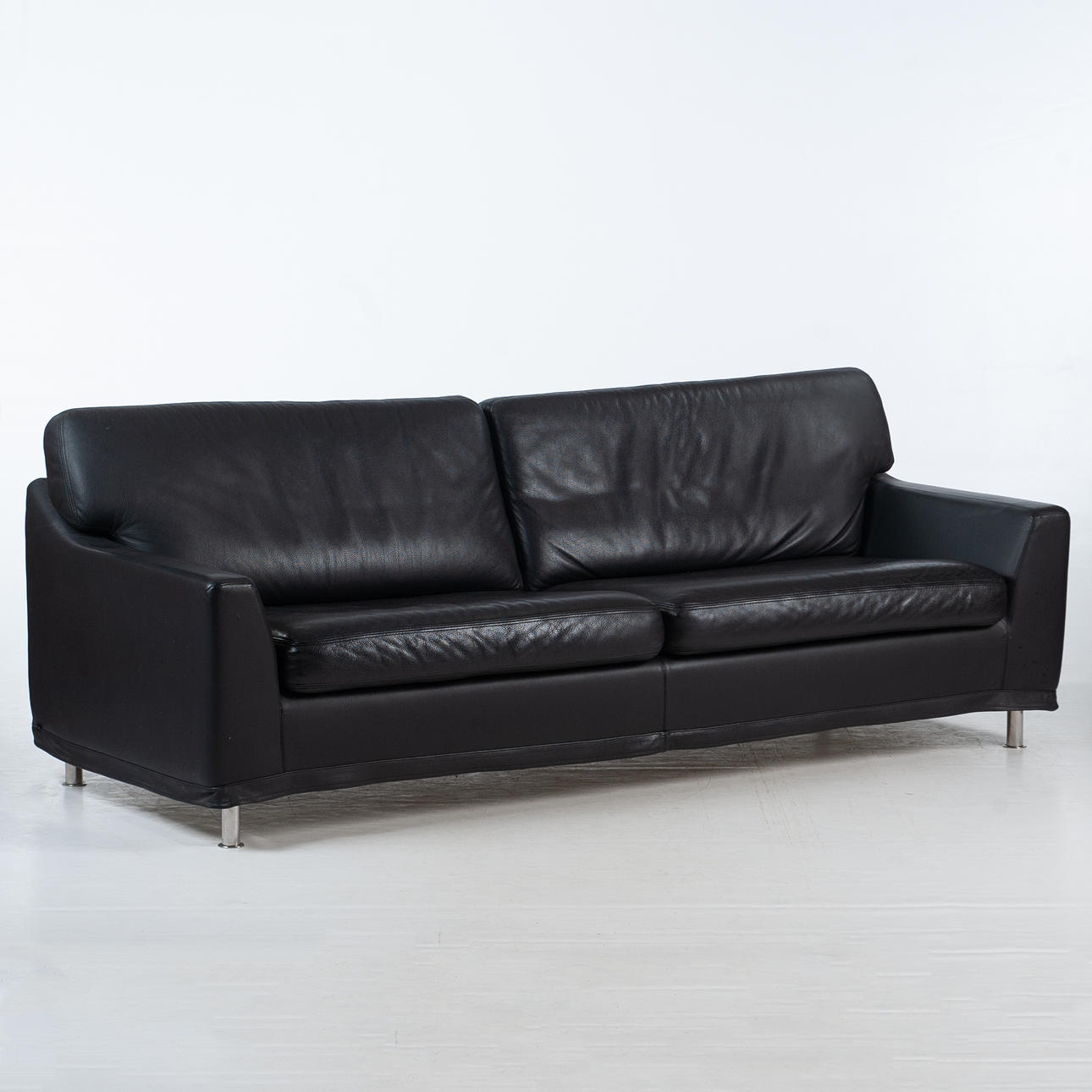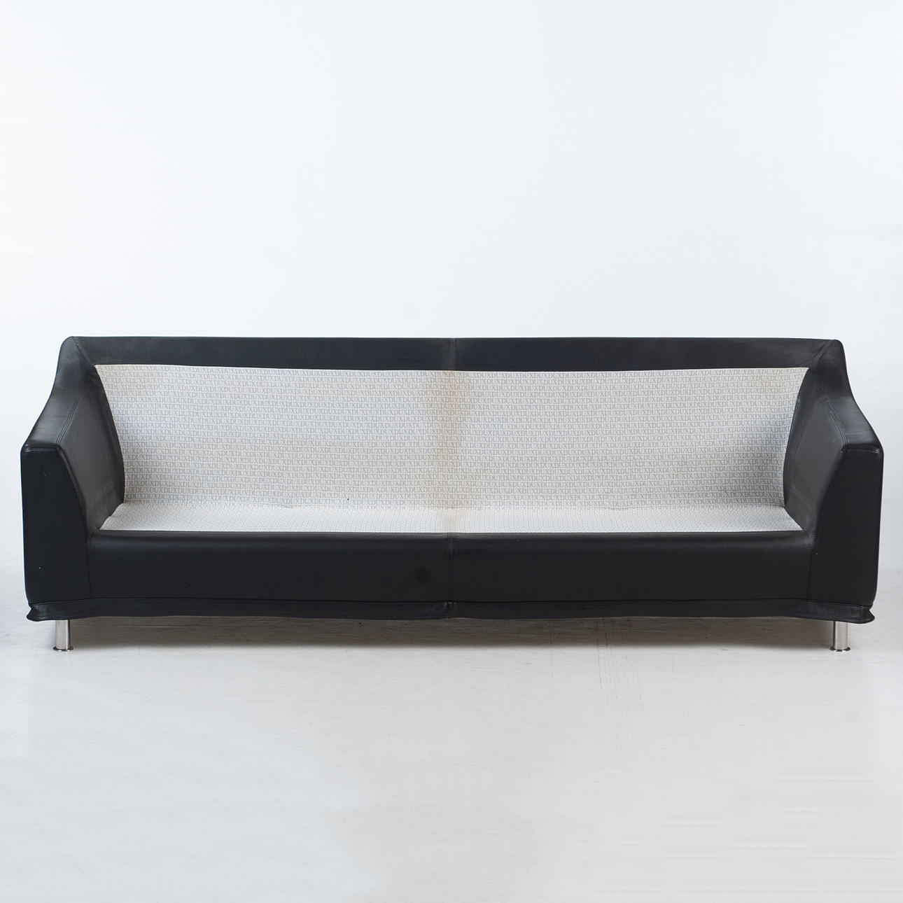 Tresitssoffa från svenska DUX, klädd i svart läder med kromade ben. Klassisk modell. Längd 200cm. Djup 83cm. Höjd 76cm. Sitthöjd 40cm.