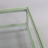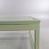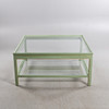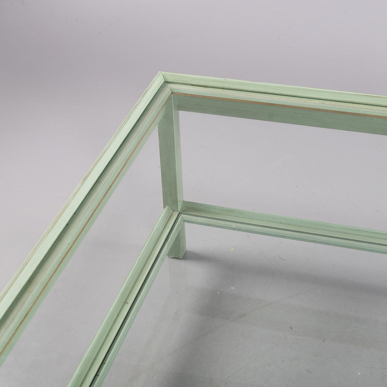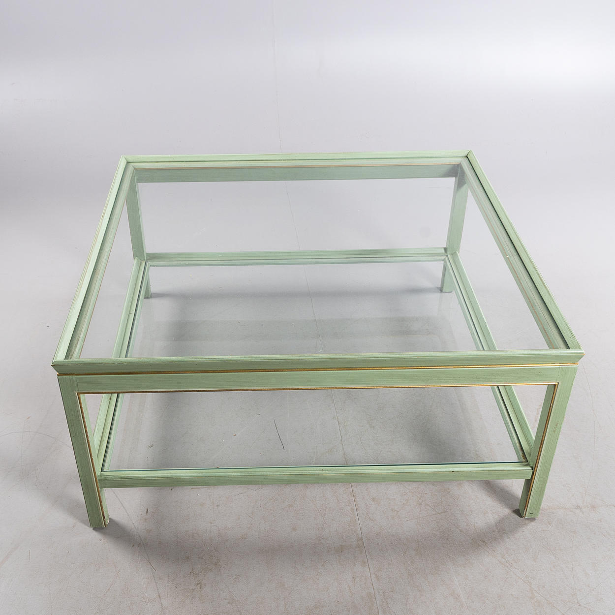 Bemålat trä, bronserade lister, 2 lösa glasskivor, höjd ca 51. 111x111 cm.