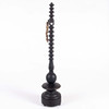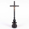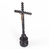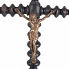 Fristående kors i svarvat och mörkbetsat trä med dekorerade kulformer och mässingsdetaljer. Kristusfigur i metall med detaljerad utformning och strålkrans. Ursprungligen avsett för liturgiskt bruk, sannolikt katolskt.