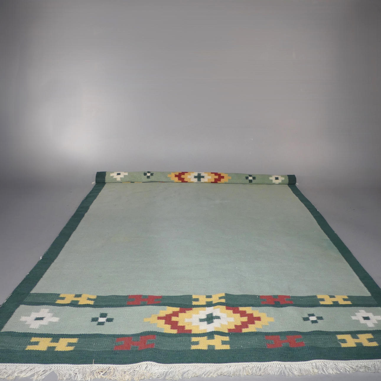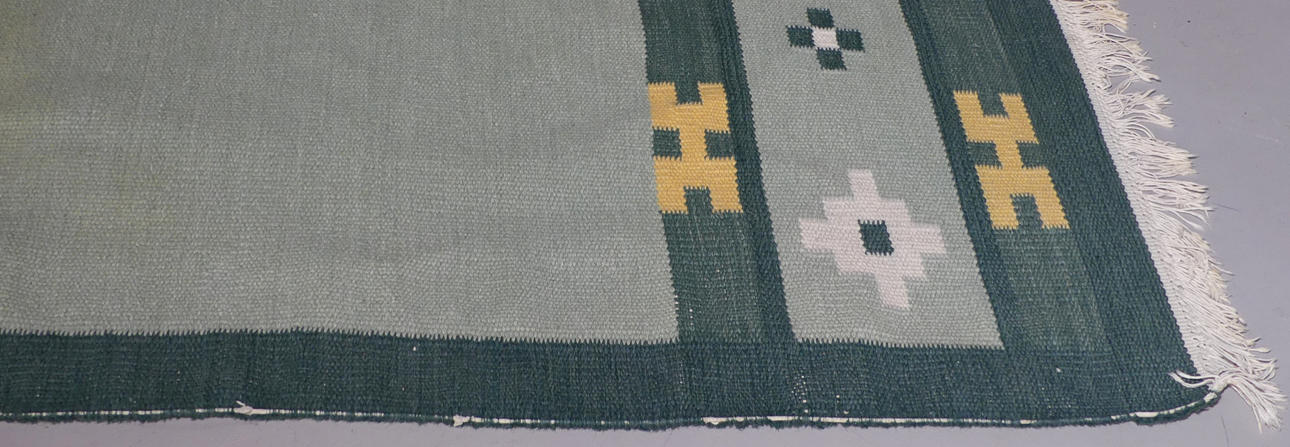 Kantvarp synlig på flera ställen. En bit med skadade fransar.