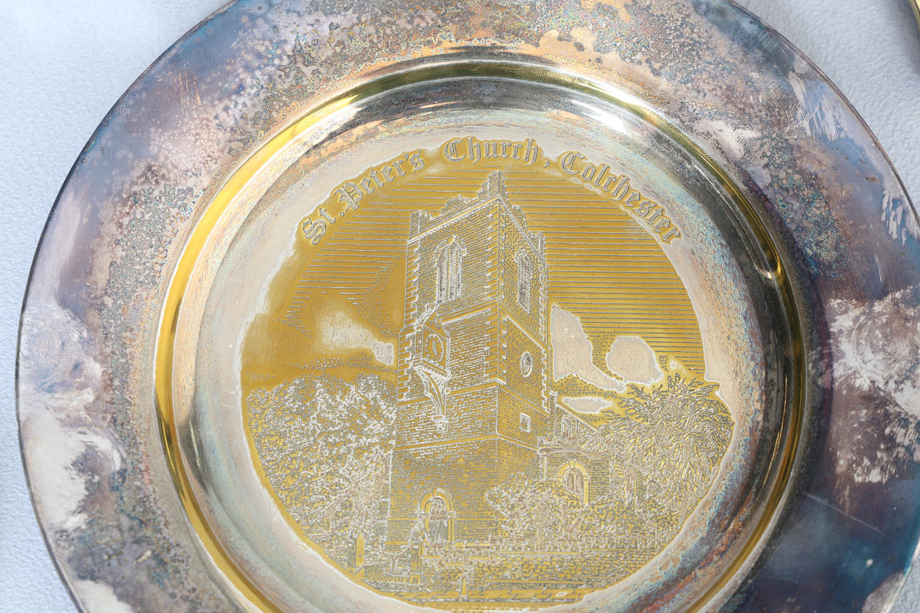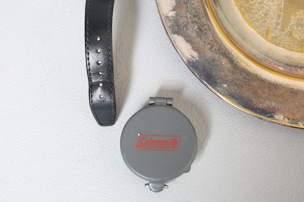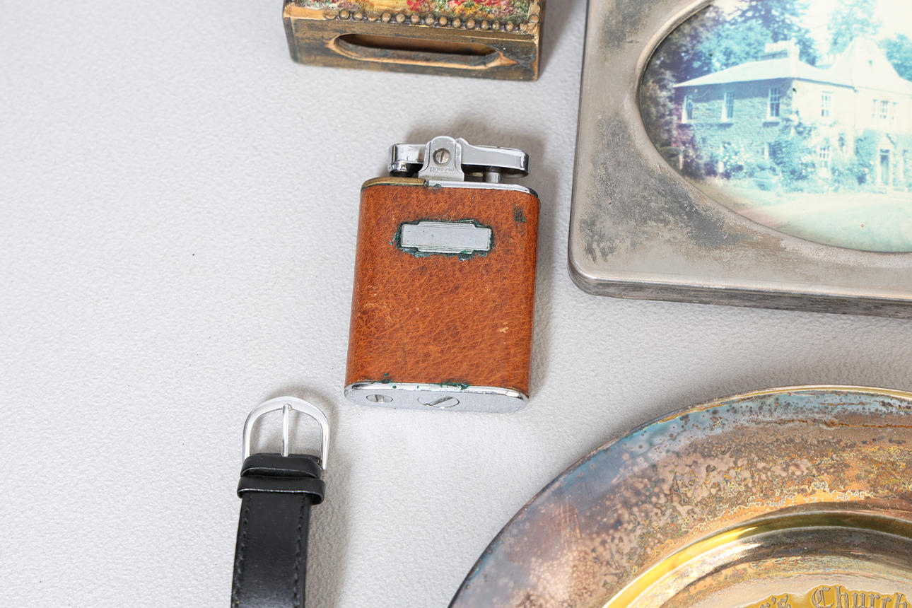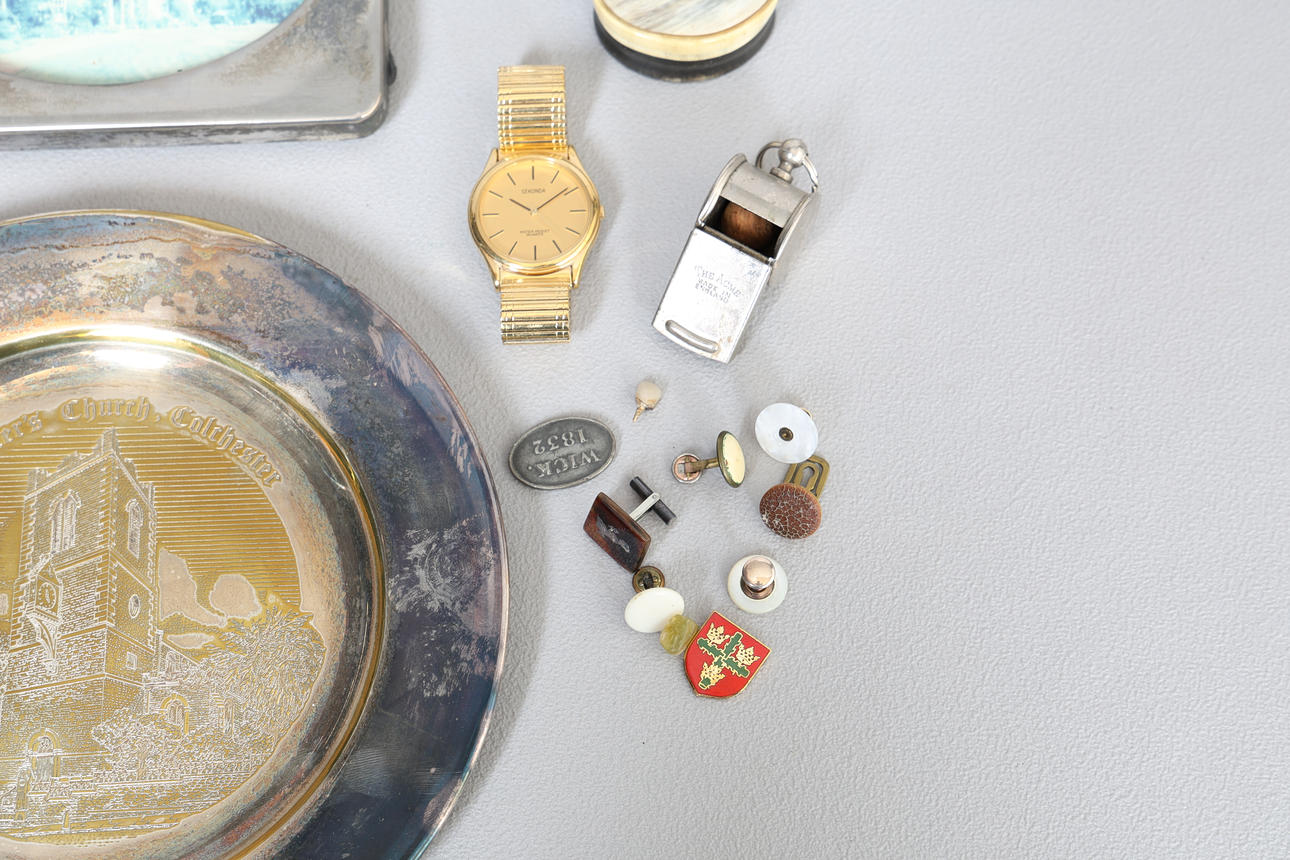 För att inkludera ett Tissot armbandsur, en Sekonda, en tennfigur av en sjöman, en snuslåda från 1800-talet, Acme-visselpipan, en silverpläterad fotoram, en Coleman-kompass etc, det största föremålet 14 cm brett, en silverpläterad skål som föreställer 'St. Peters kyrka, Colchester 20cm diameter (antal).
