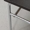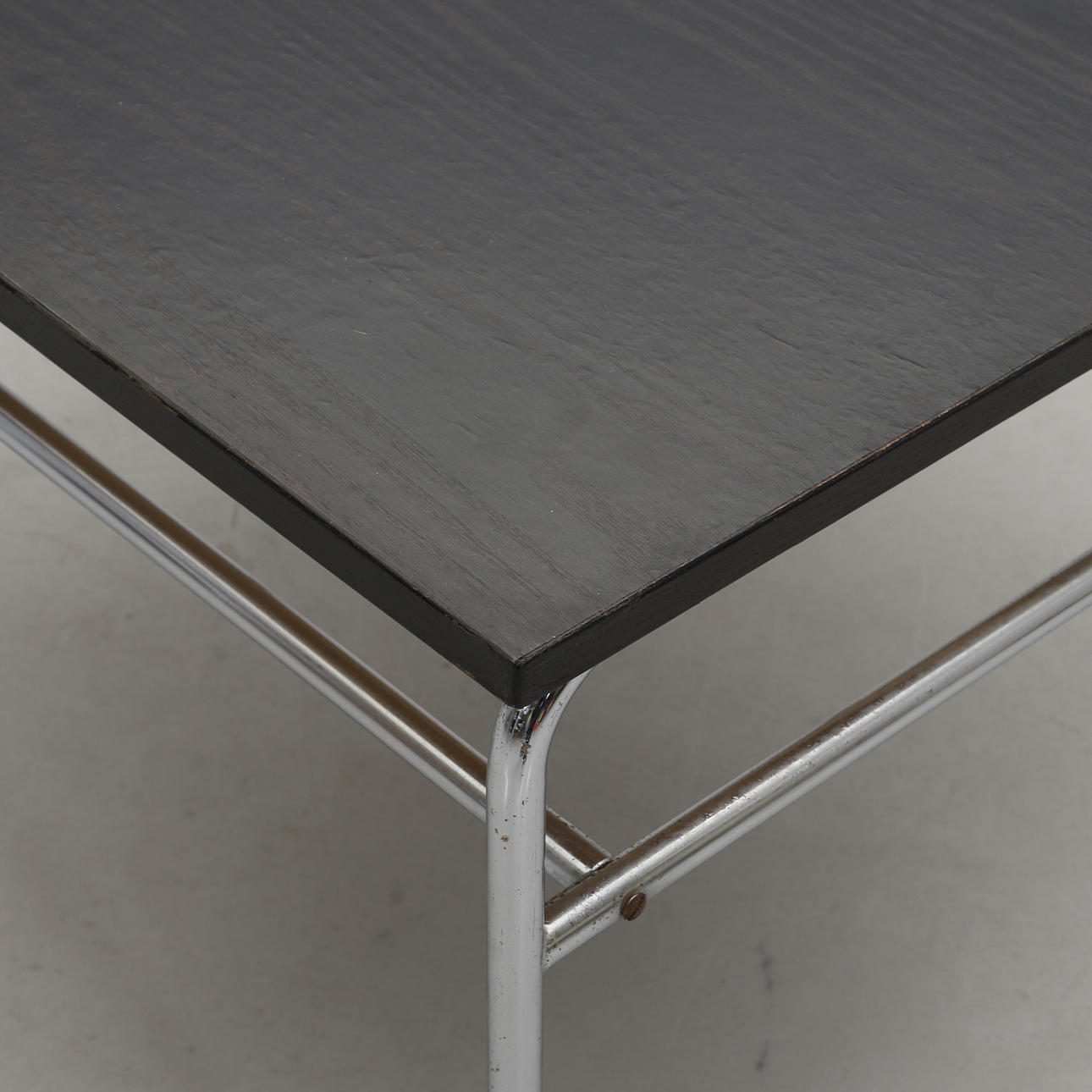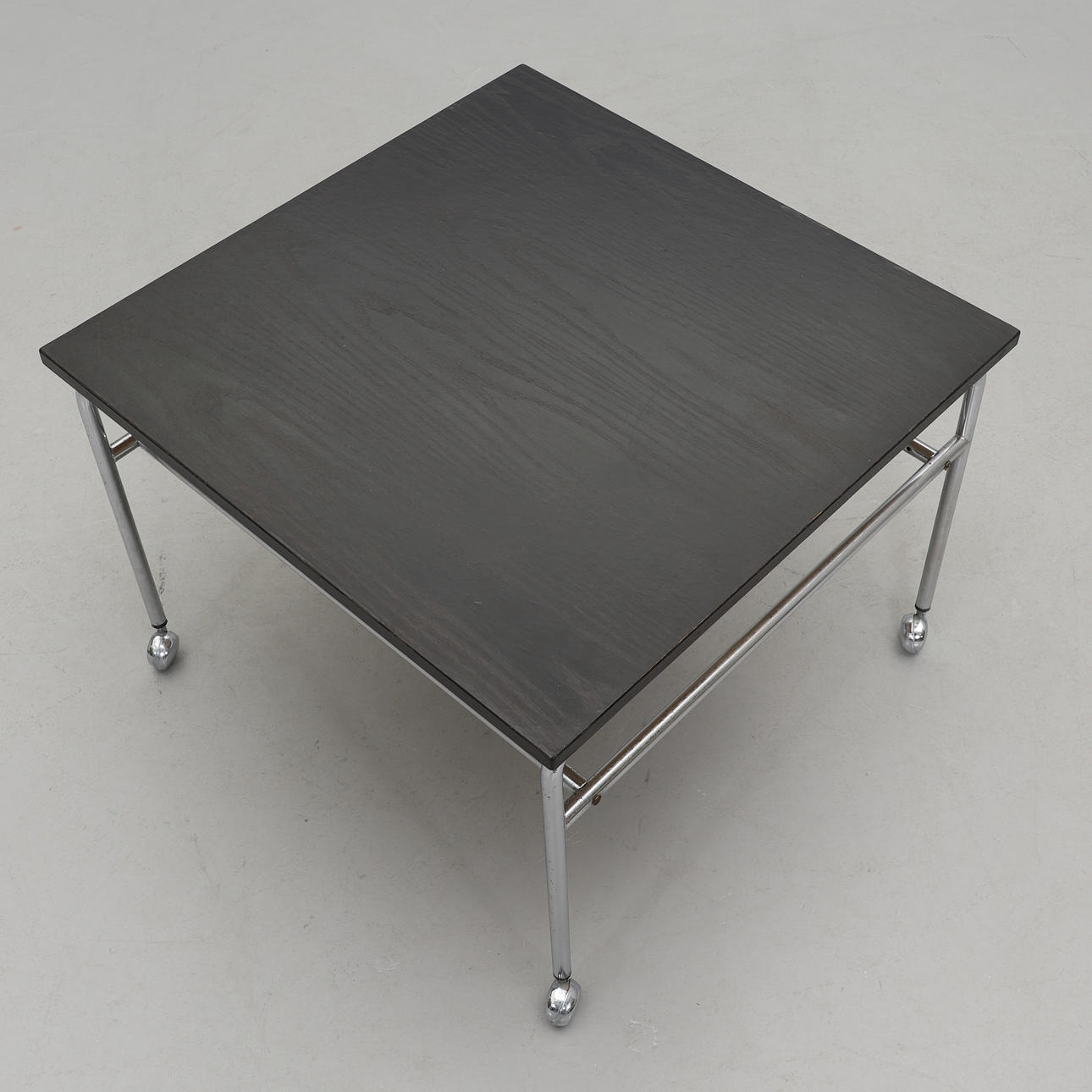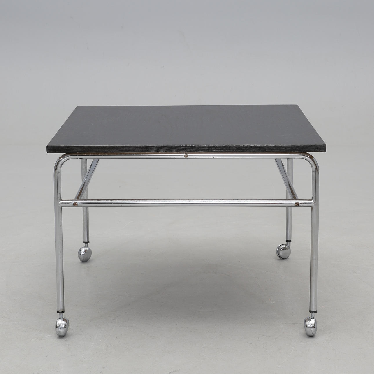 Förkromad benställning på hjultrissor. Svartbetsad skiva. Höjd 49,5, skiva 70 x 70 cm.