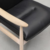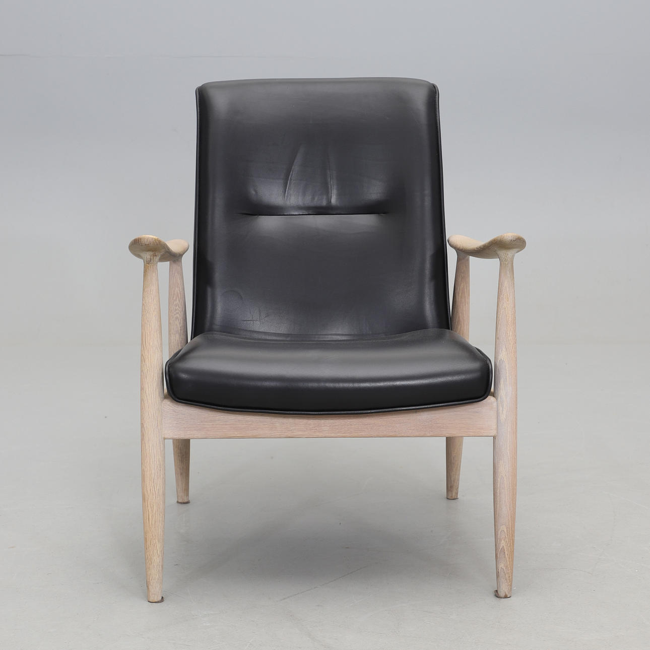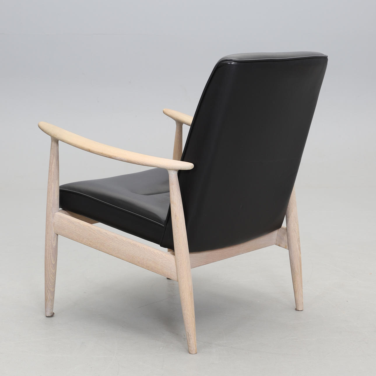 Stomme i vitpigmenterad ek. Svart klädsel i skinn. Sitthöjd 42 cm. Ryghöjd 85 cm.