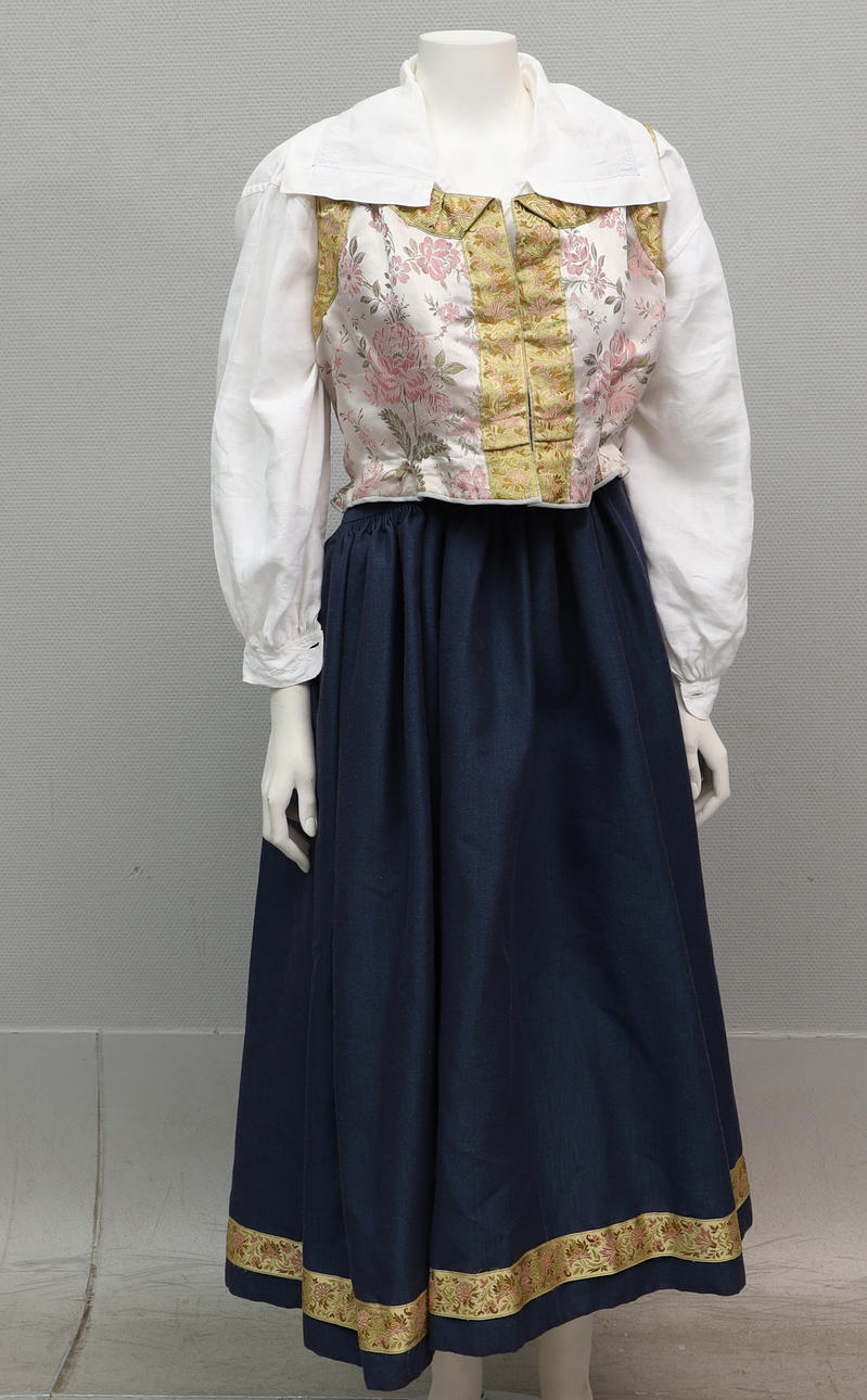 Blå ullkjol; längd ca 85 cm, midjemått ca 68 cm