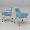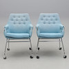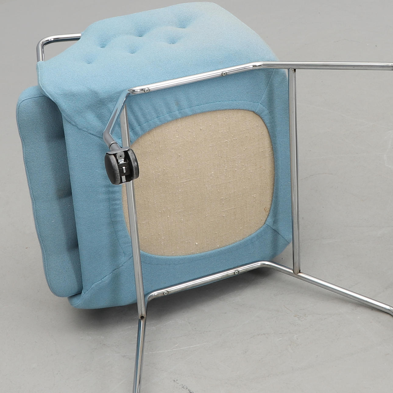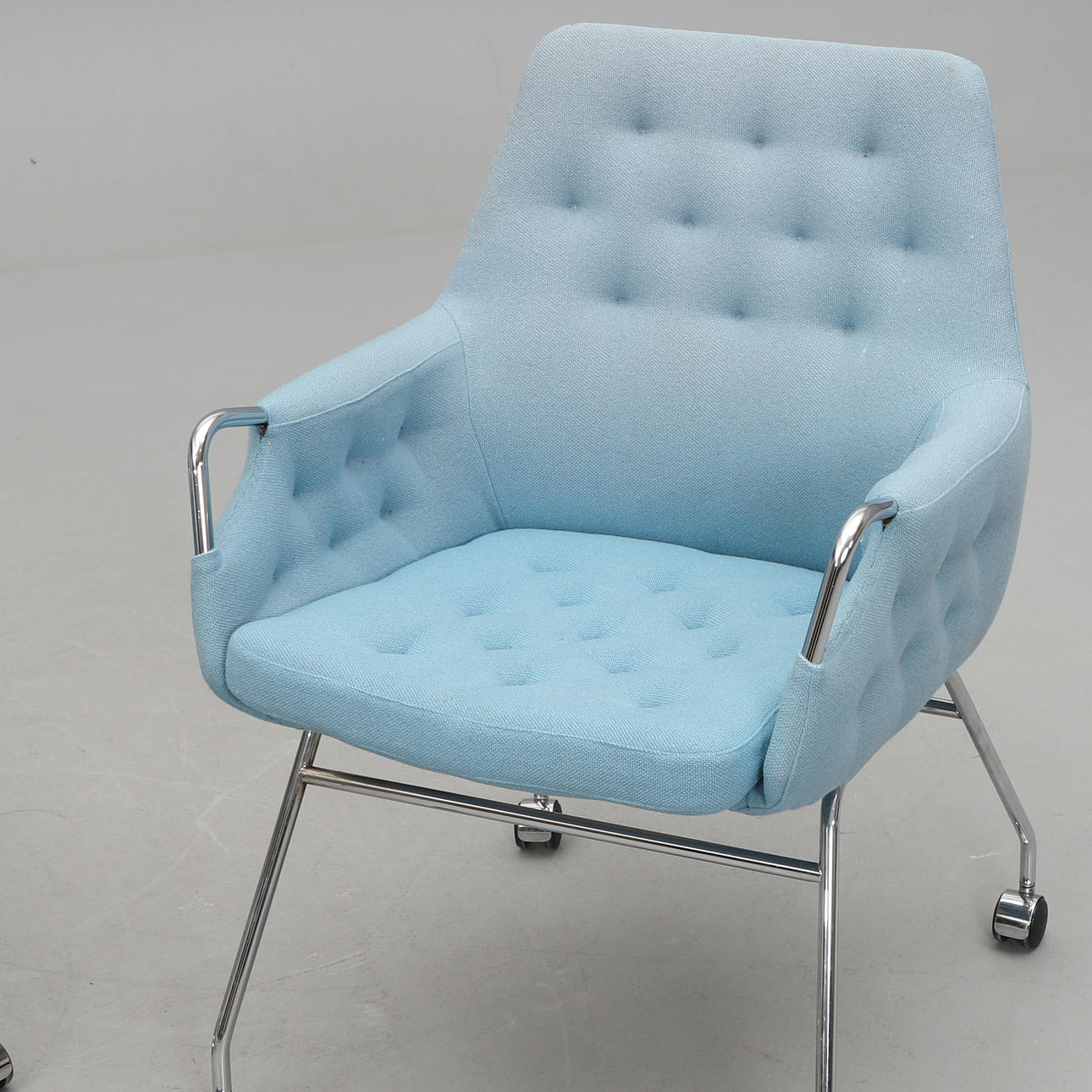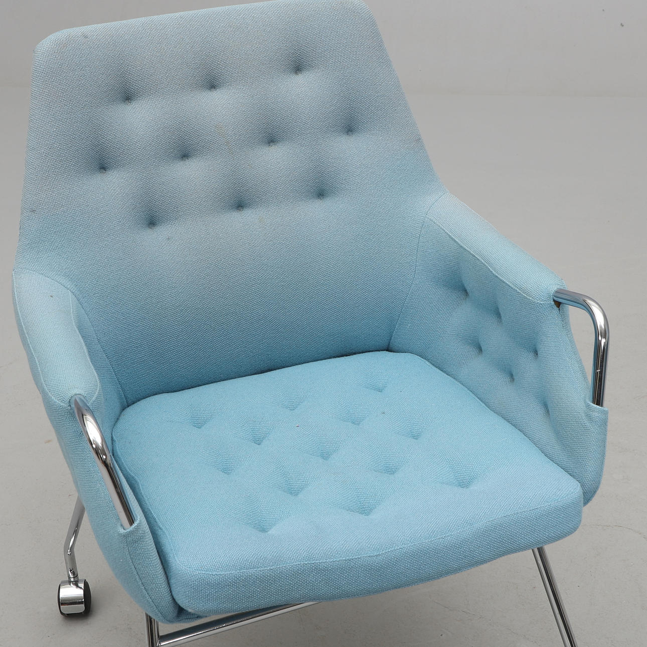 Stoppad med lös dyna i sits. Textilklädsel. Förkromad stålrösstomme, på hjul. Bredd 60, djup 65, rygghöjd 88, sitthöjd 48 cm.