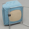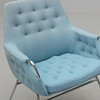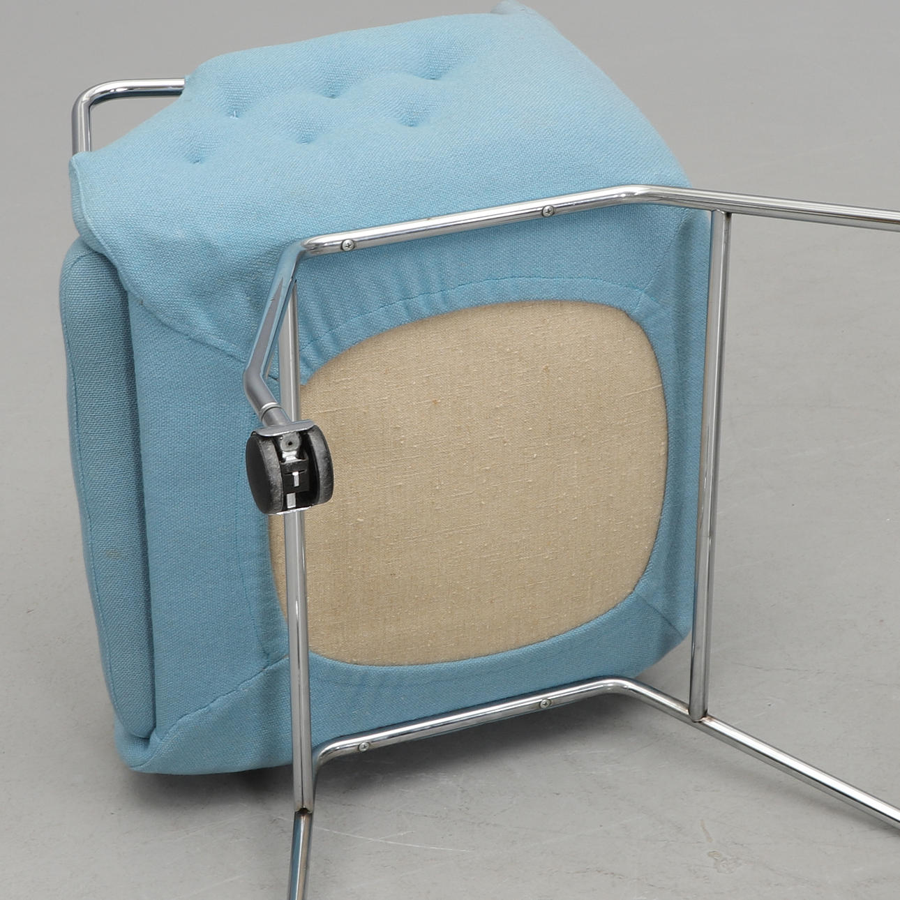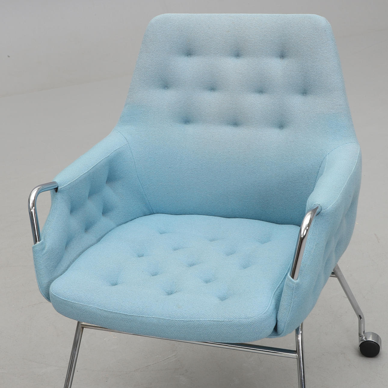 Stoppad med lös dyna i sits. Textilklädsel. Förkromad stålrösstomme, på hjul. Bredd 60, djup 65, rygghöjd 88, sitthöjd 48 cm.