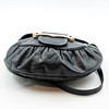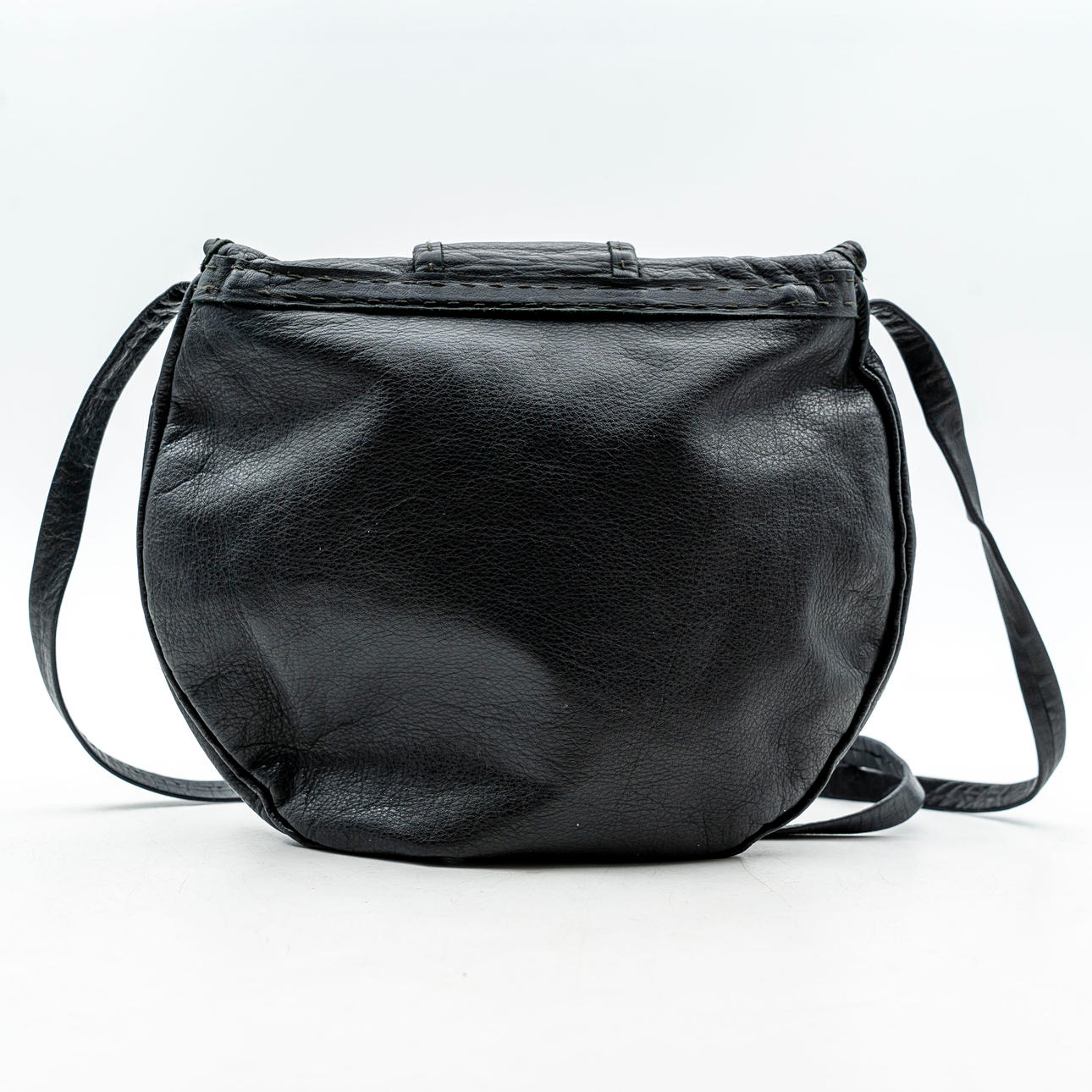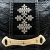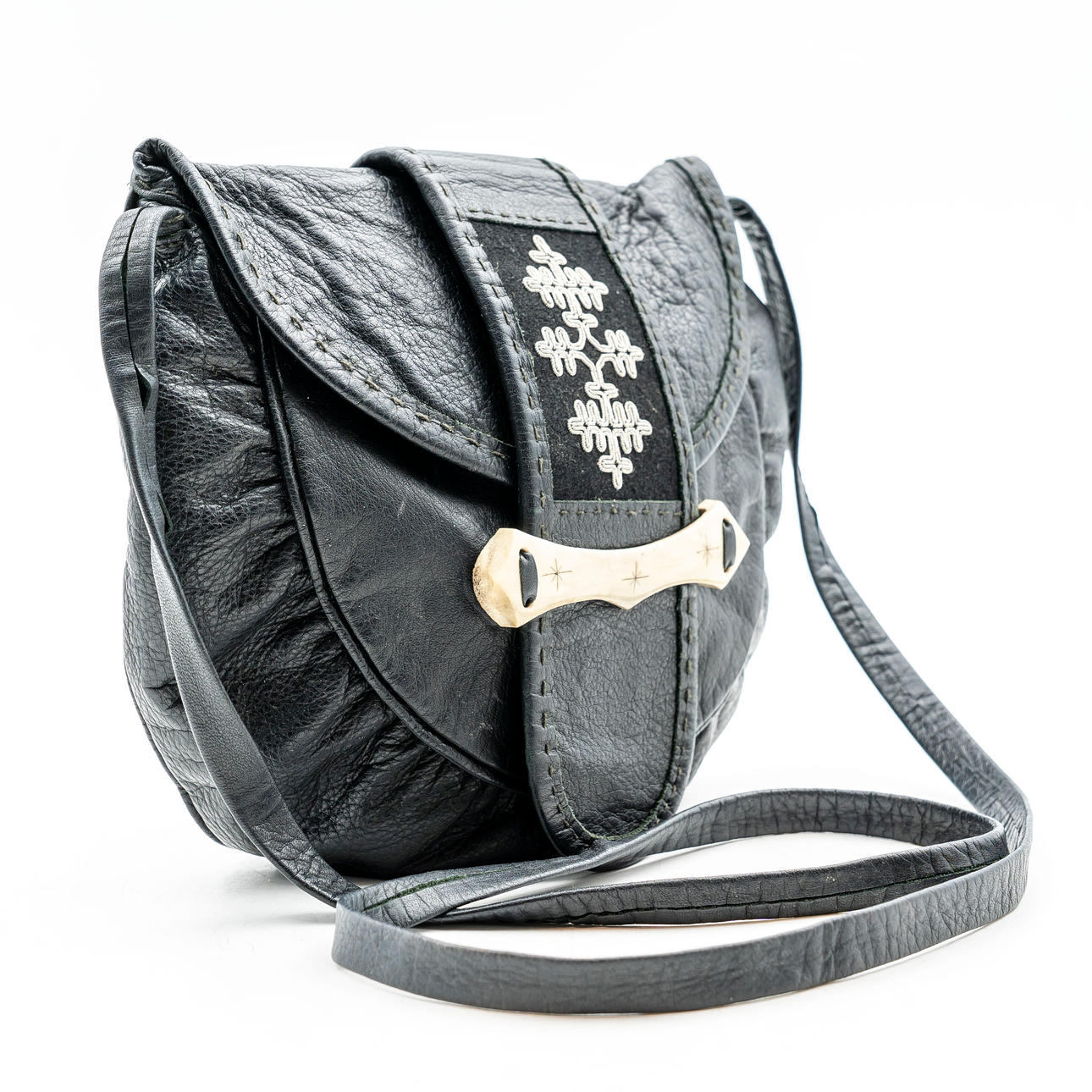 Tillverkad i svart läder, renhorn och tenntråd. Till synes osignerad.
