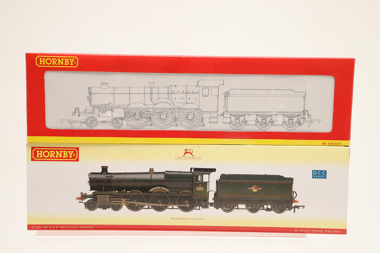Två boxade Hornby-lok, R2232 Castle Class 'Kenilworth Castle' och R2404 Grange Class 'Resolven Grange' Weathered Edition. Lådor 36 cm x 10 cm. (2).