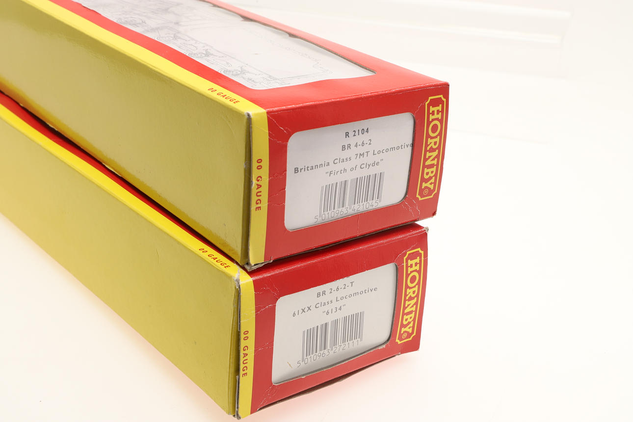 Två boxade lok inklusive R2213B 61xx 6134 lok och R2104 Britannia Class 'Firth of Clyde'. Lådor 36 cm x 10 cm. (2).