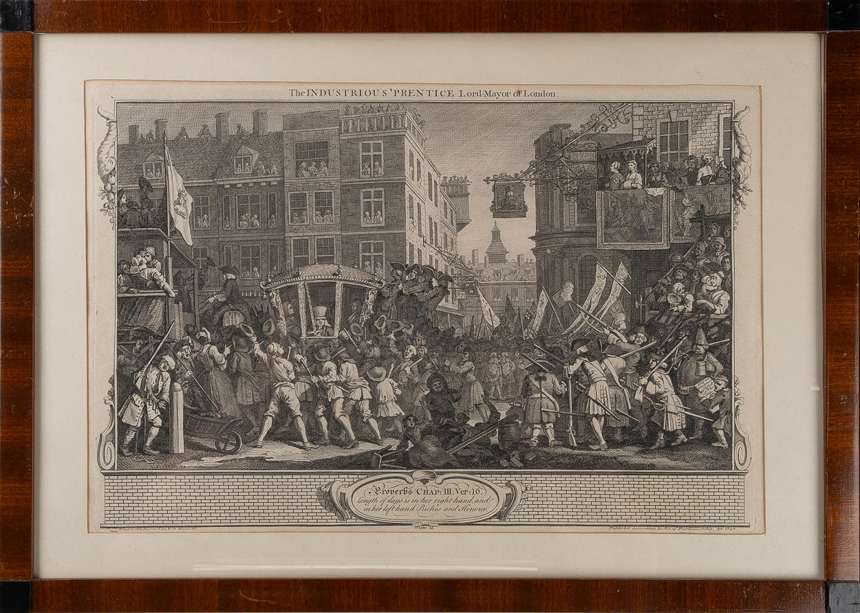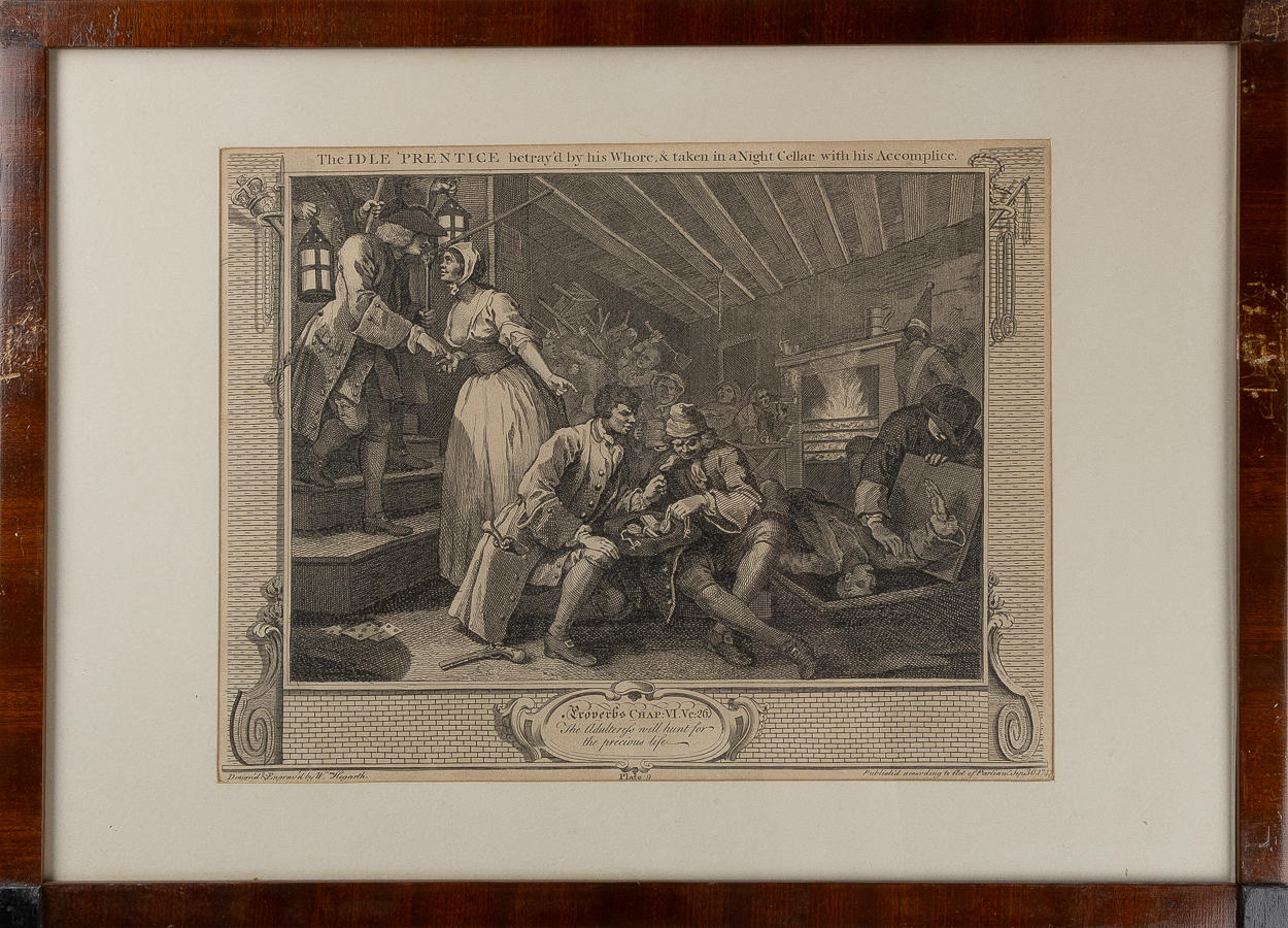 4324624. WILLIAM HOGARTH. "The Idle Prentice" och "The Industrious Prentice", kopparstick, 2 stycken, 1747.