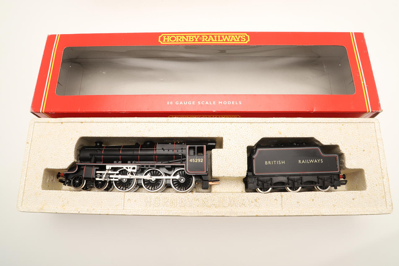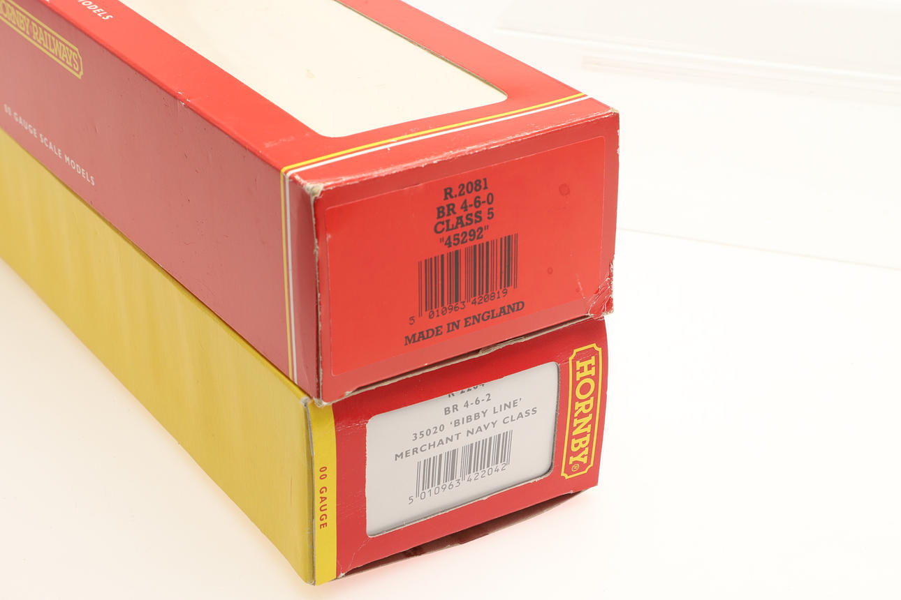 Två boxade lok inklusive R2204 Merchant Navy Class 'Bibby Line' och R2081 Class 5 45292. Lådor 36 cm x 10 cm. (2).