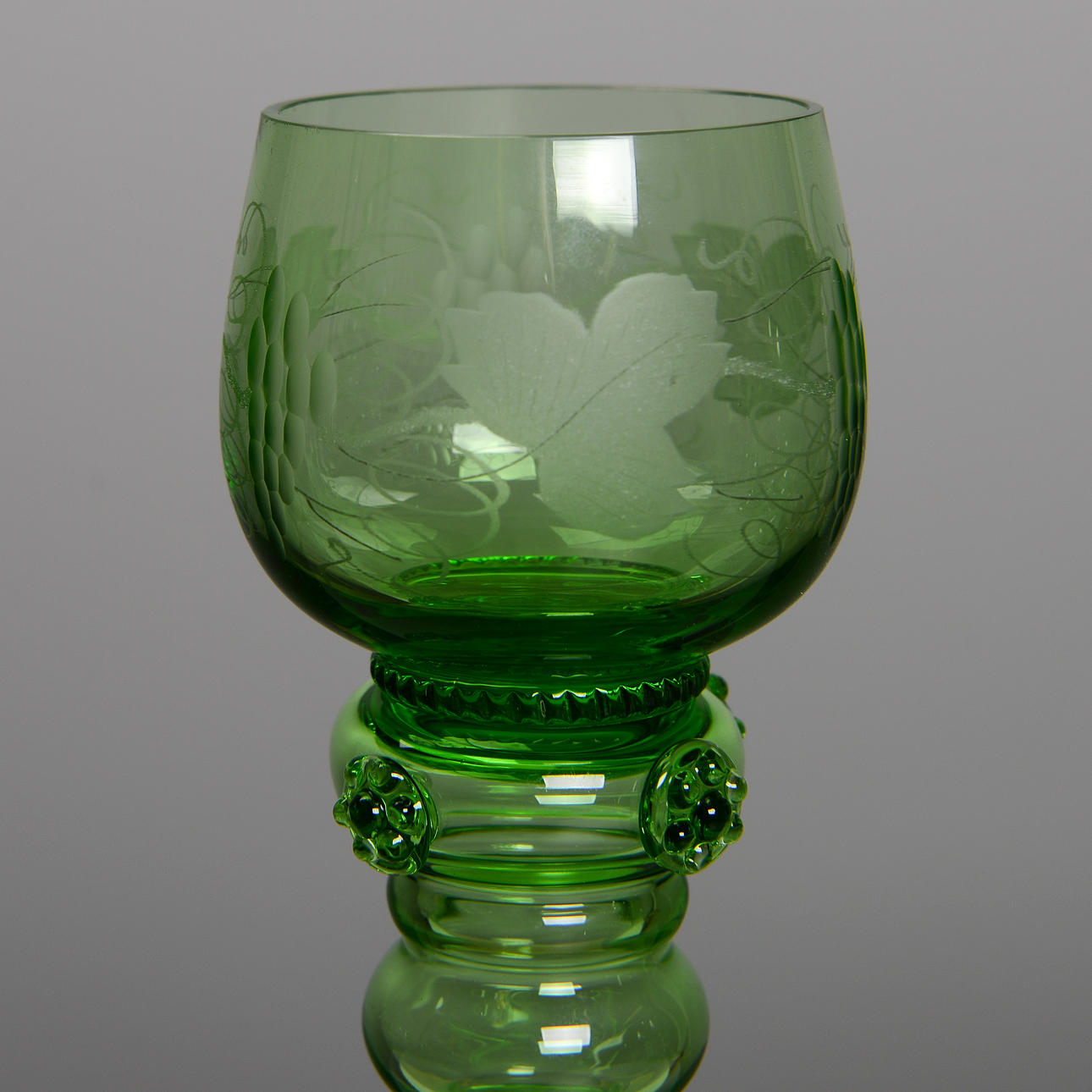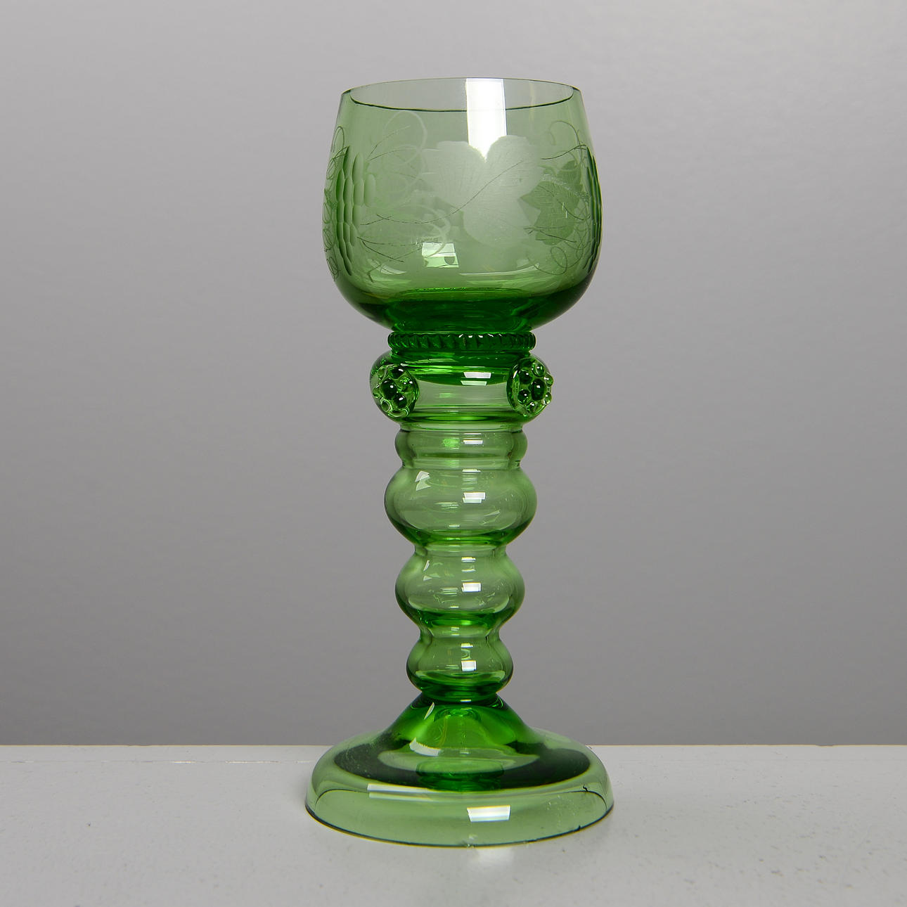 Grön glasmassa med etsad dekor. Höjd 18 cm.