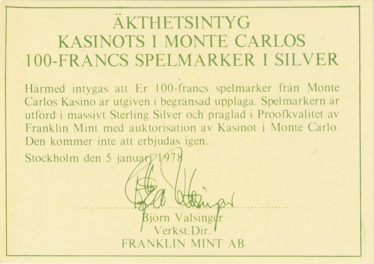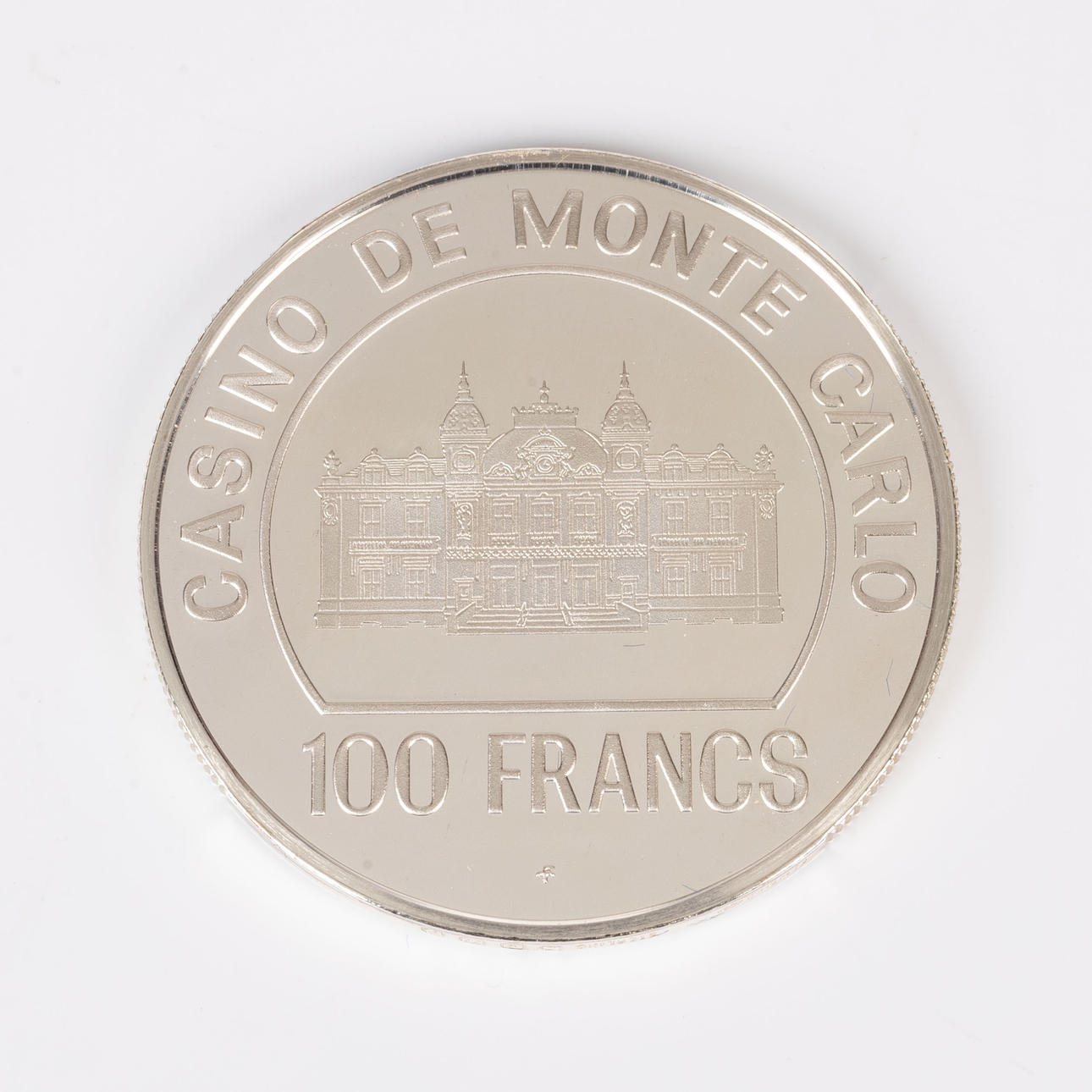 100 francs spelmark från Kasinot i Monte Carlos, Ø 4 cm.