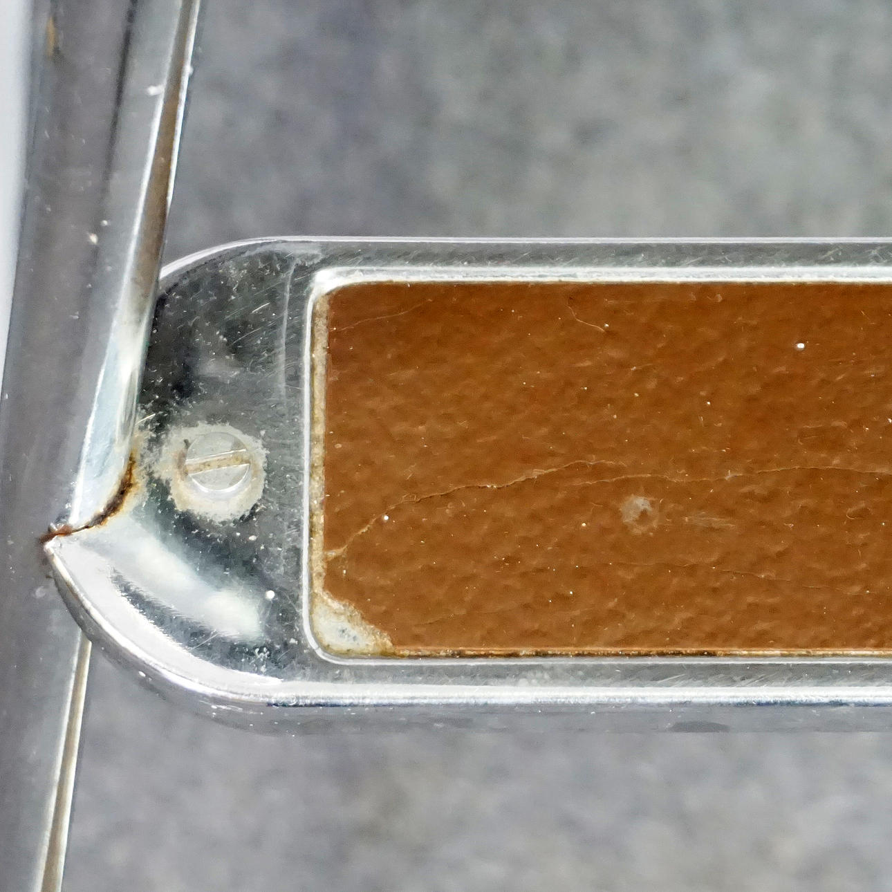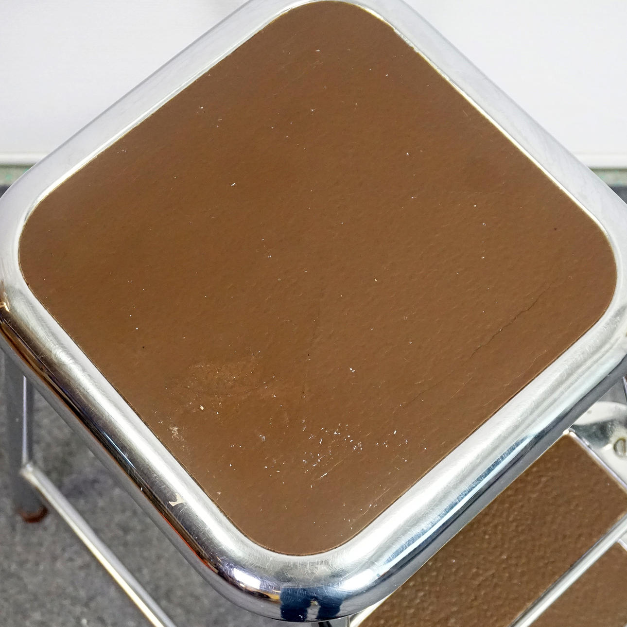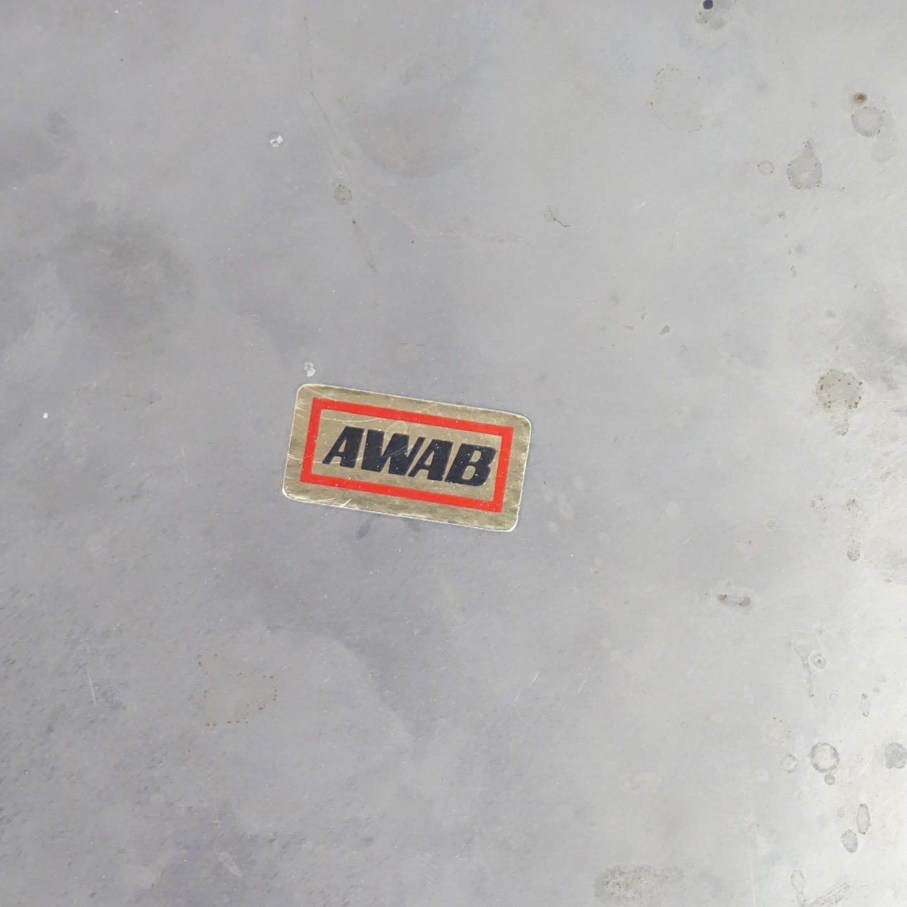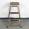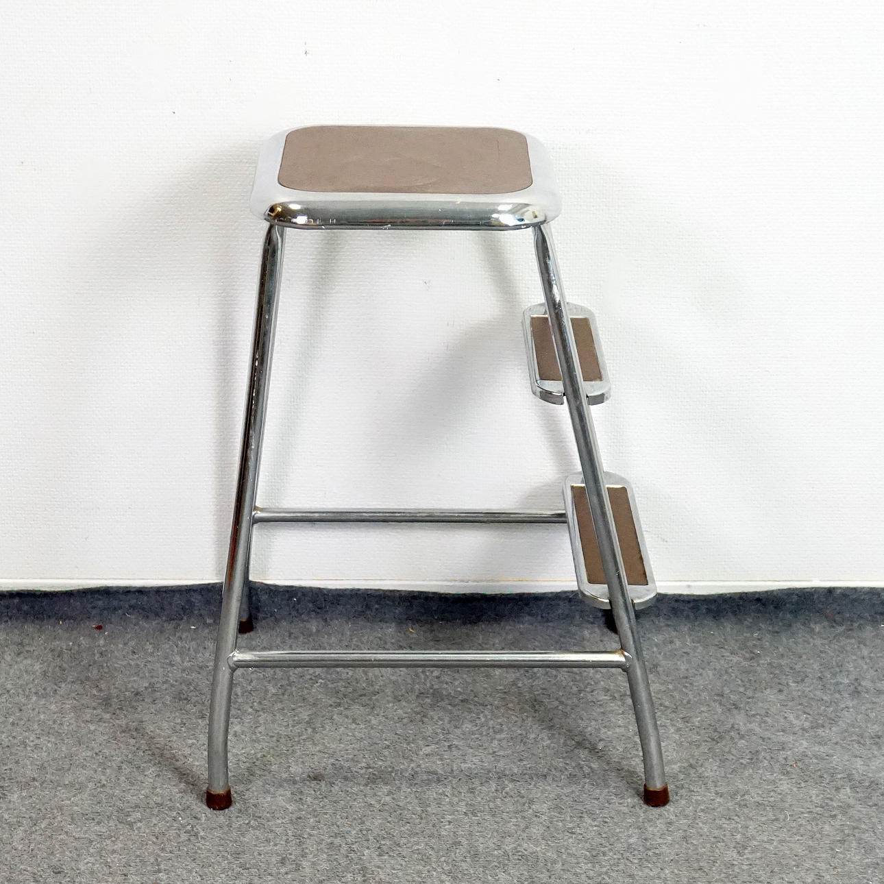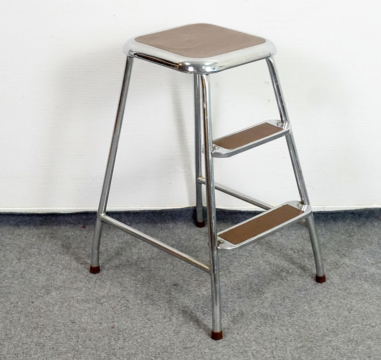 Stegpall med stomme i stål, klädd i brun vinyl. Etikettmärkt " AWAB" undertill. Höjd 58 cm, bredd 37 cm, djup 44 cm.