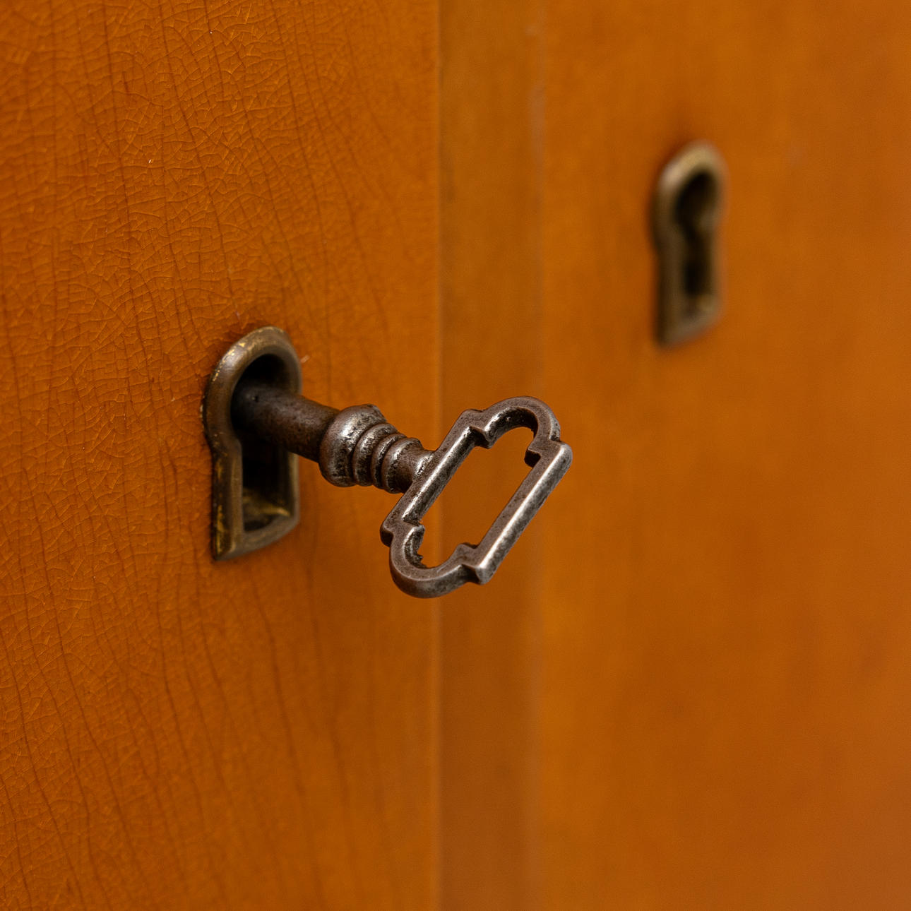 Skåp med rak form, rundade hörn. Inredning med 3 lådor samt flyttbara hyllplan. Längd ca 100, bredd 42,5, höjd 108,5 cm.