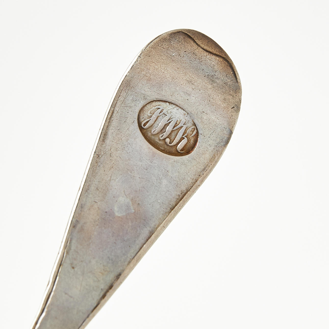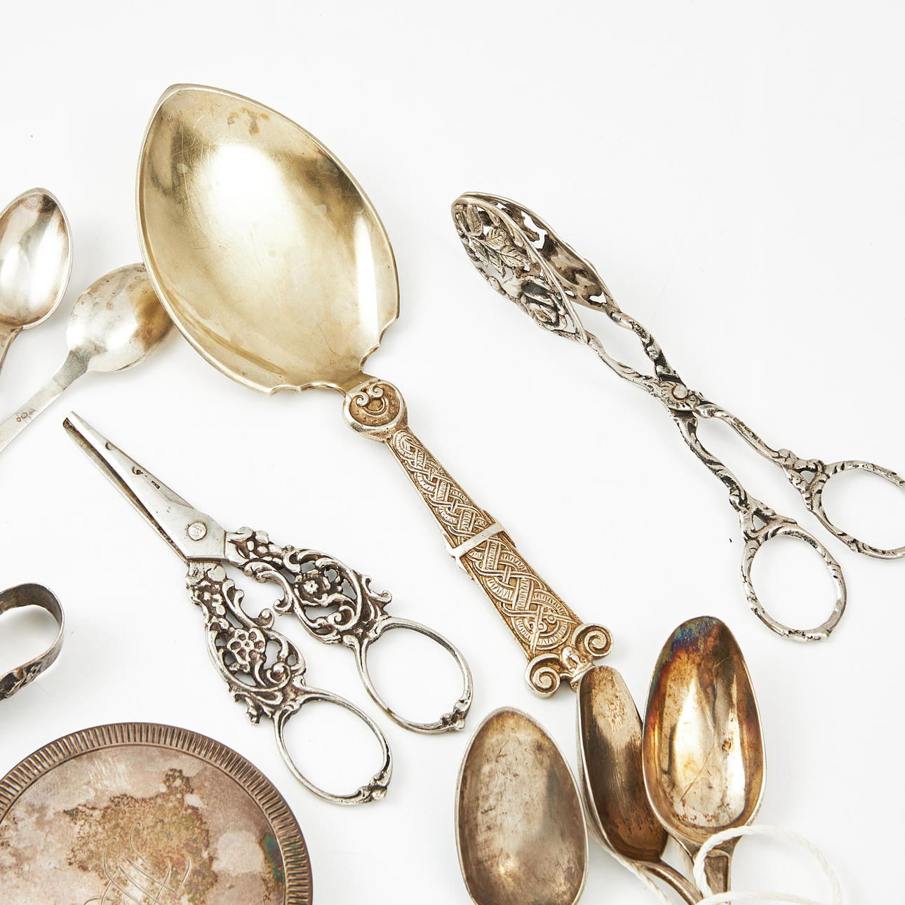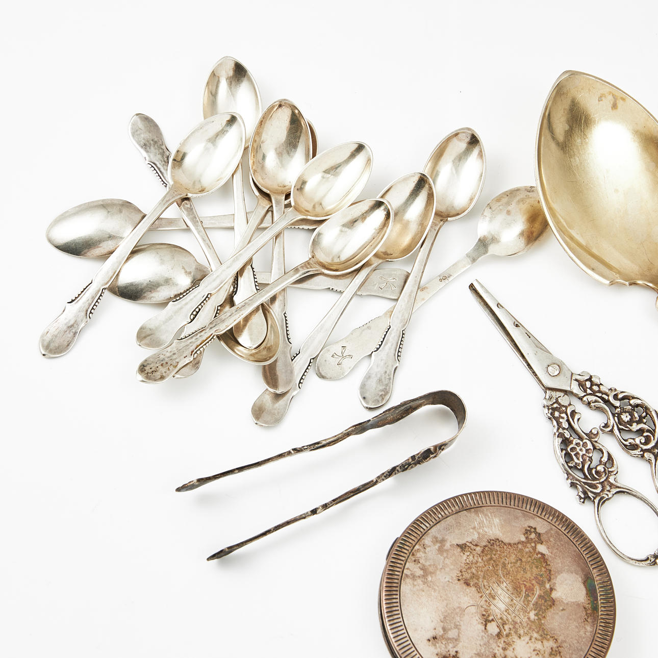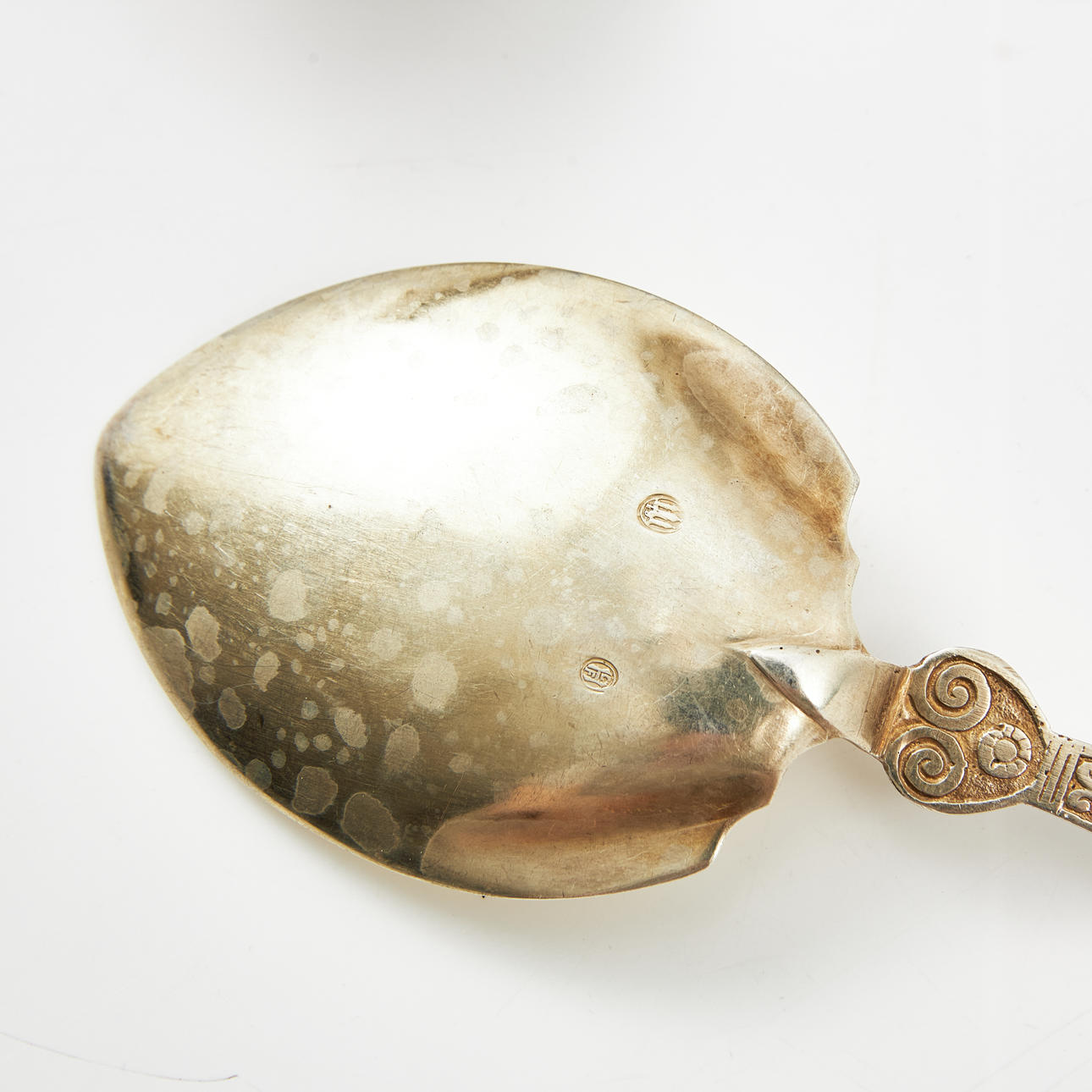 Gravyrer, slitage, två medföljande skedar som saknar stämplar.