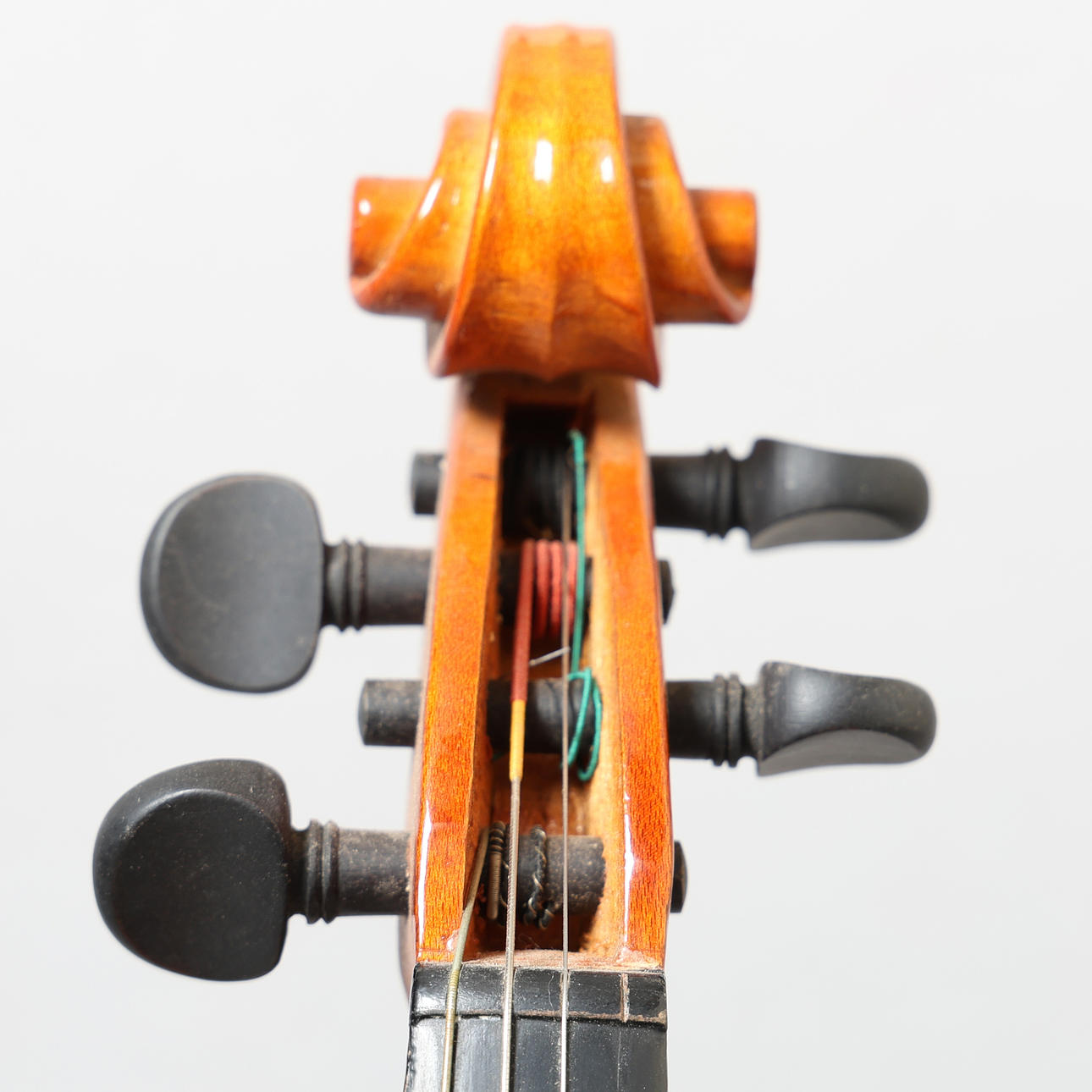 Saknar ett snöre, enstaka ytflisar/tyngre slitage, några gamla limmärken på toppen av muttern, en liten hårlinje delad till ett f-hål, annars i gott skick.