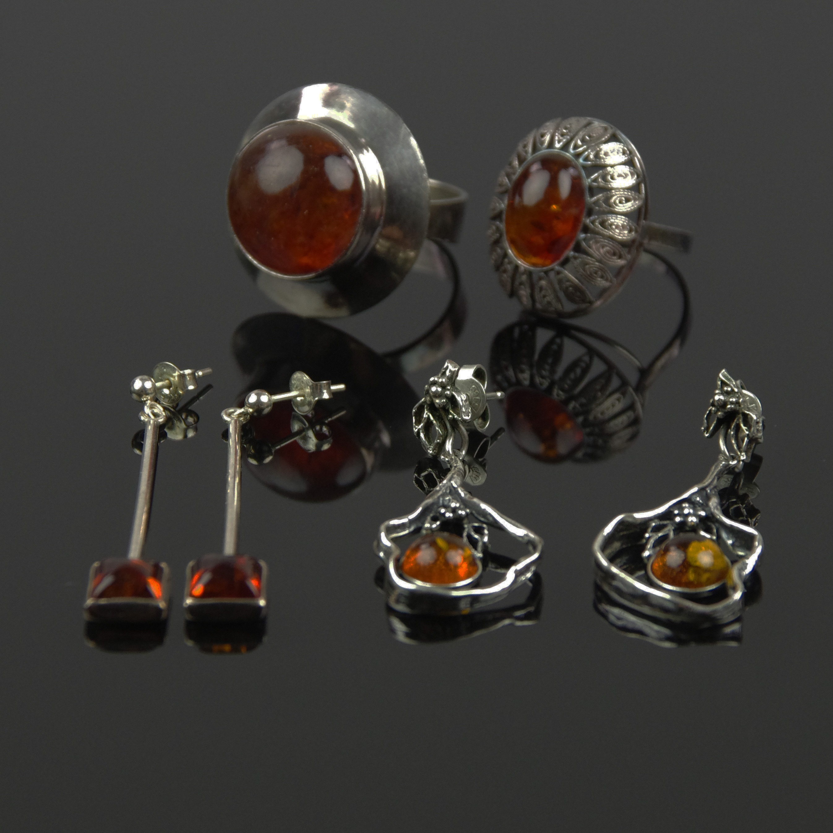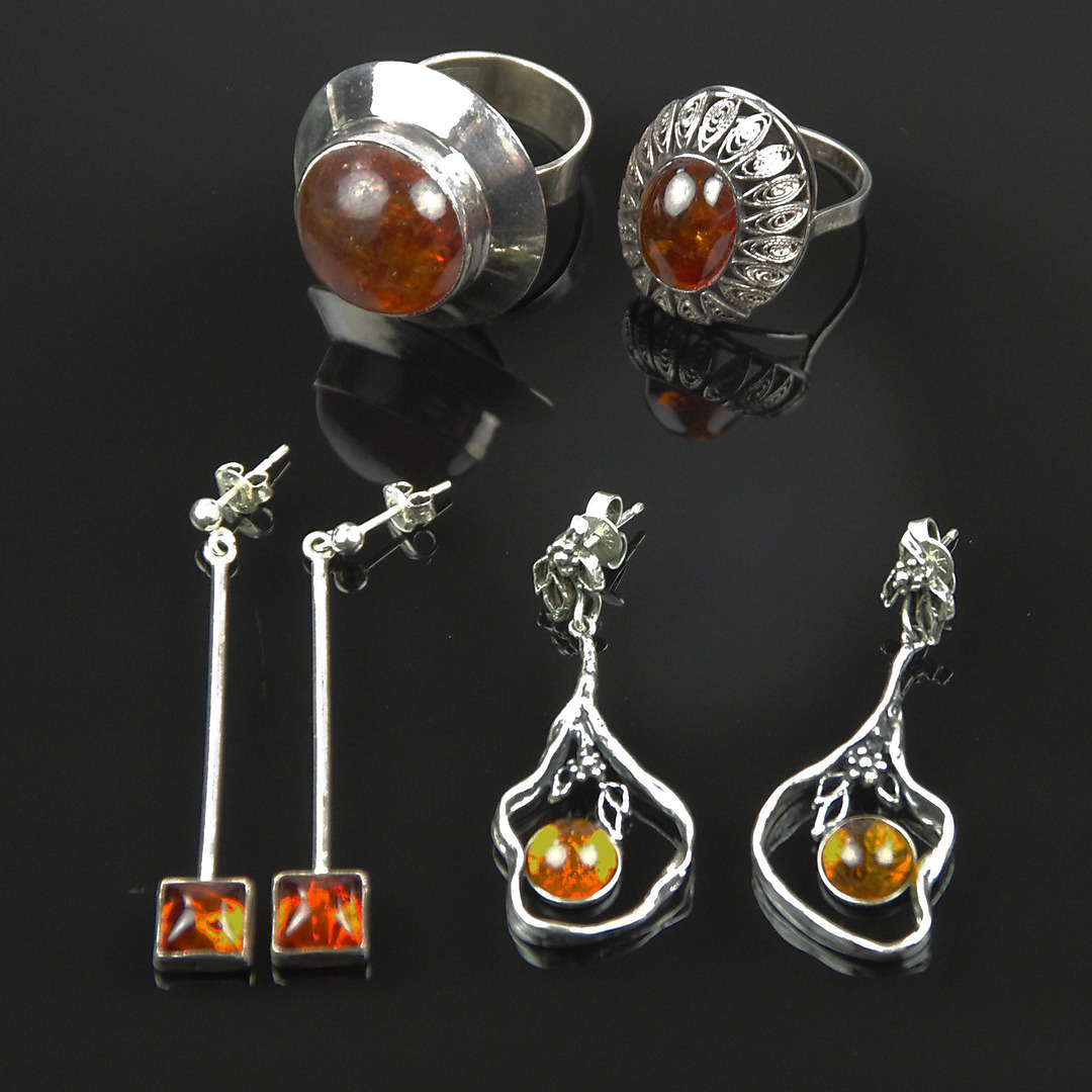 432852. RINGAR SAMT ÖRHÄNGEN, silver/bärnsten.