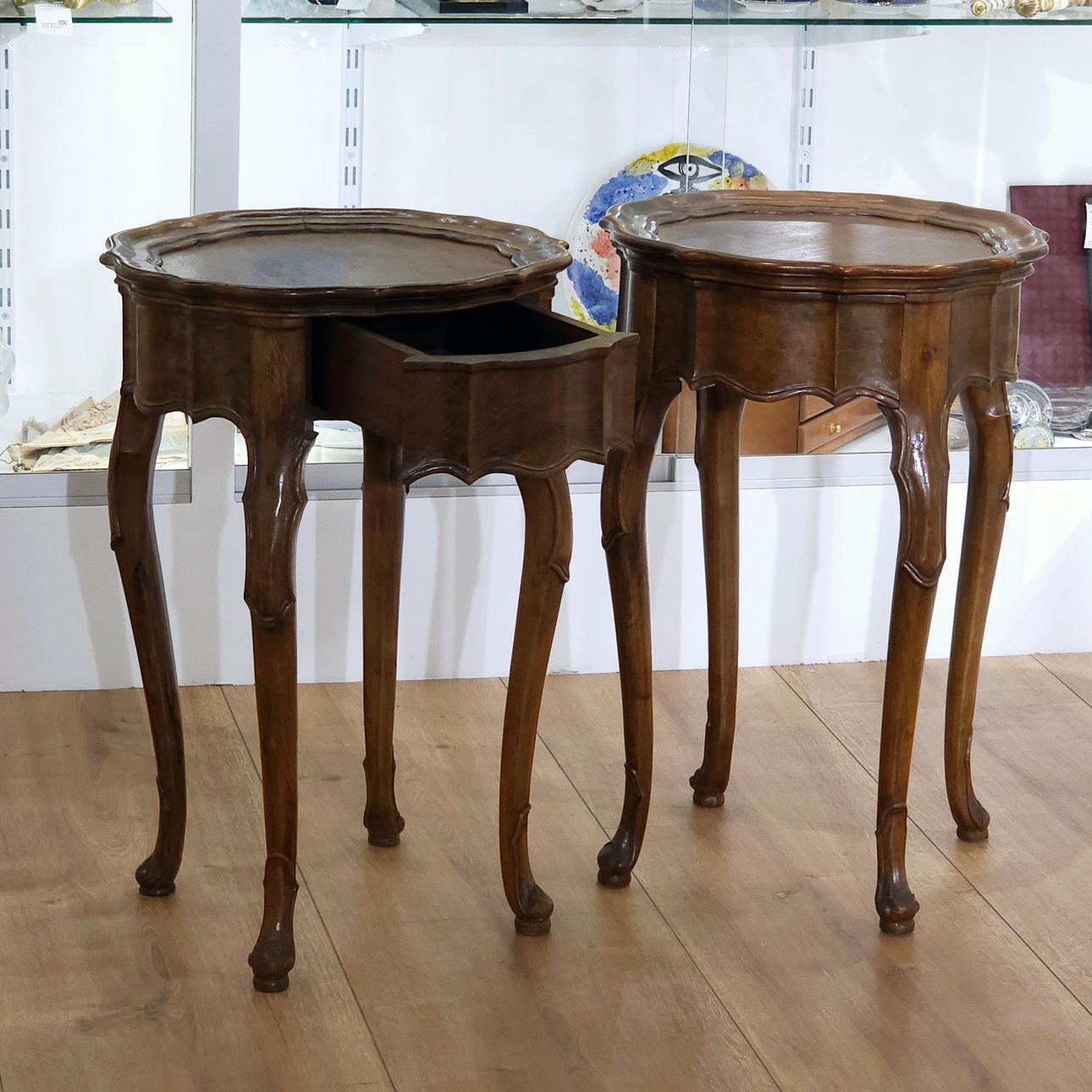 Par träbord med låda.