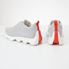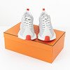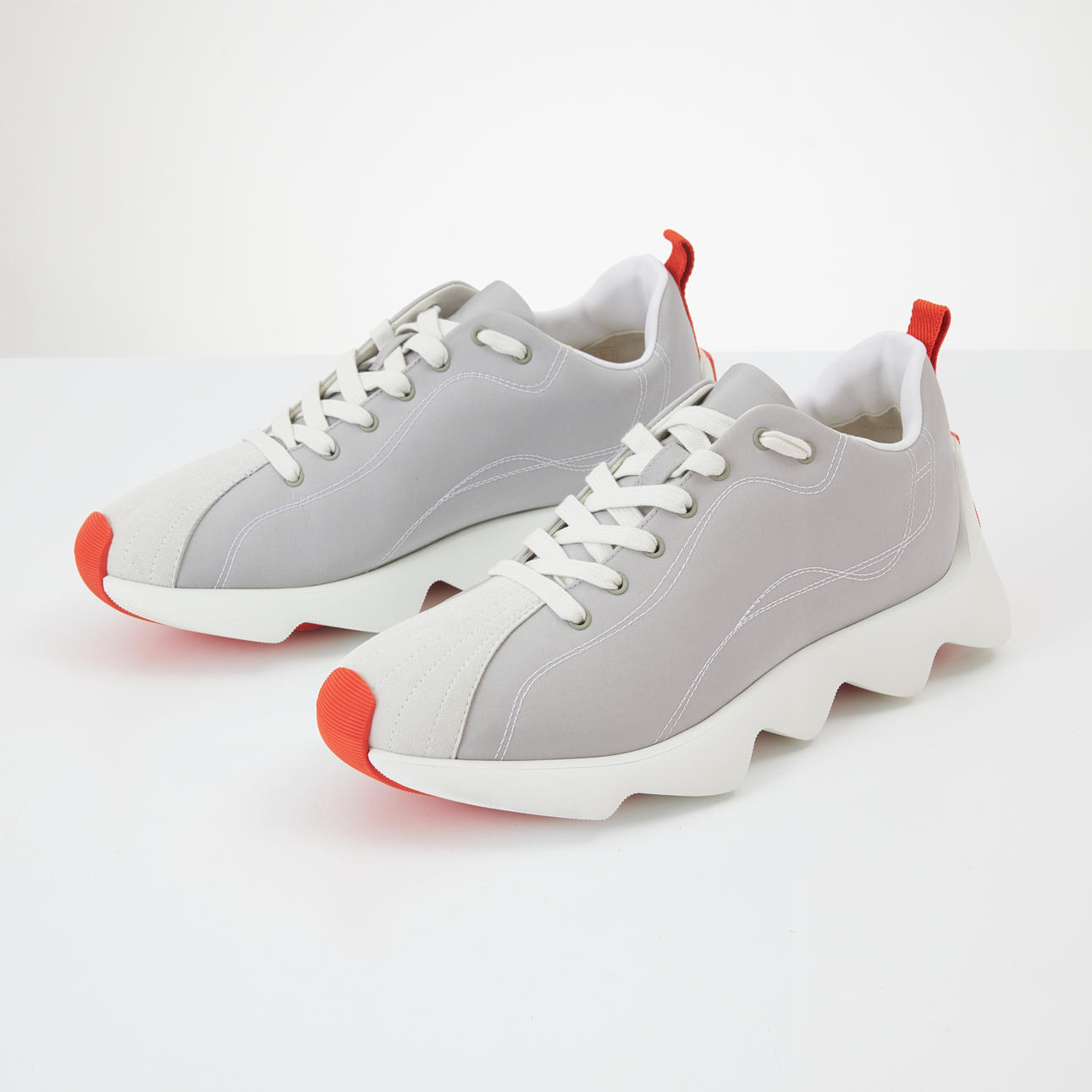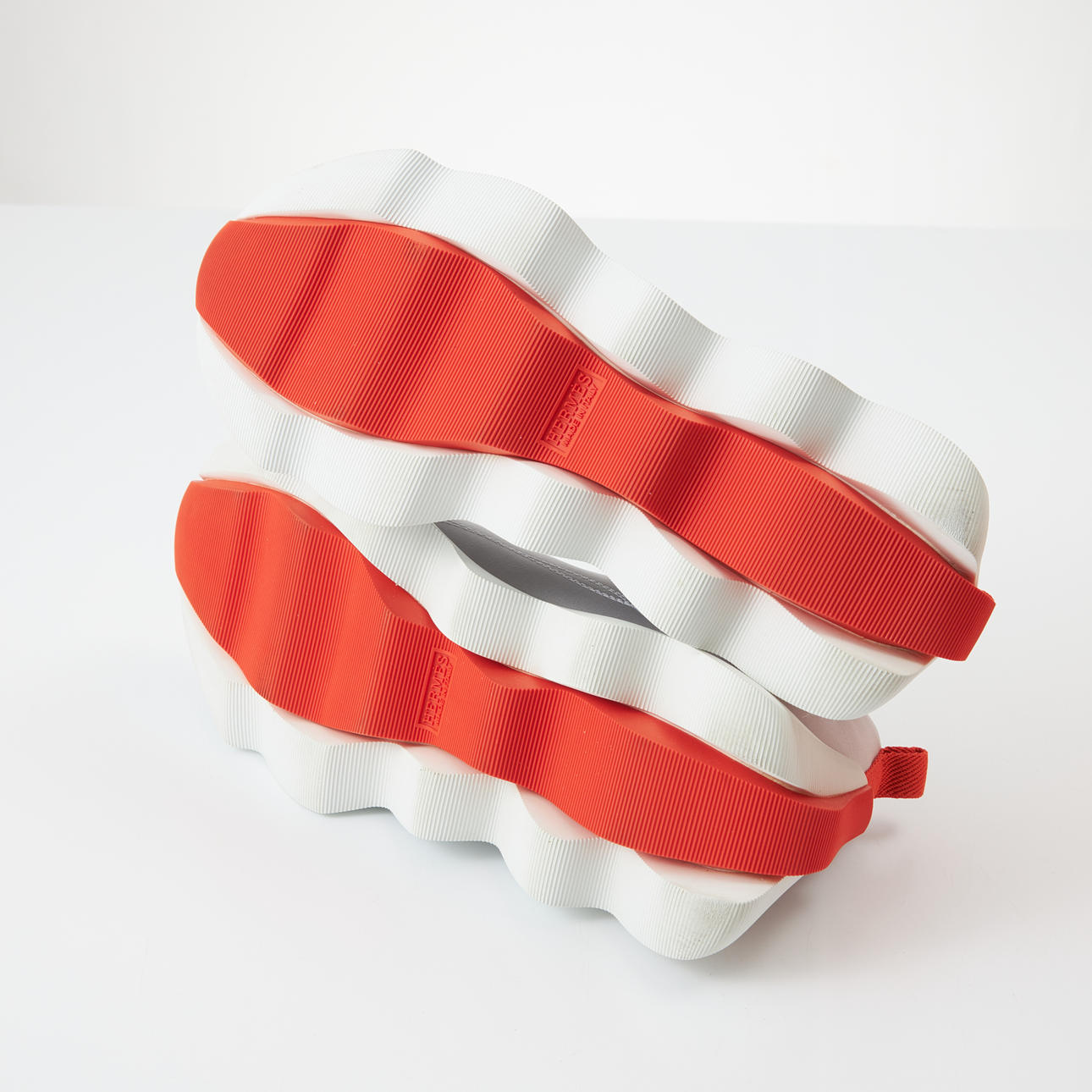 I grå textil/nylon vita sömmar, med vita skosnören, asymmetriskt vågformade sulor i vitt och orange, märkta "Hermès made in Italy", medföljande skopåse, vita skosnören och skokartong, skornas längd ca 30, höjd 14 cm.