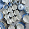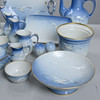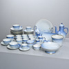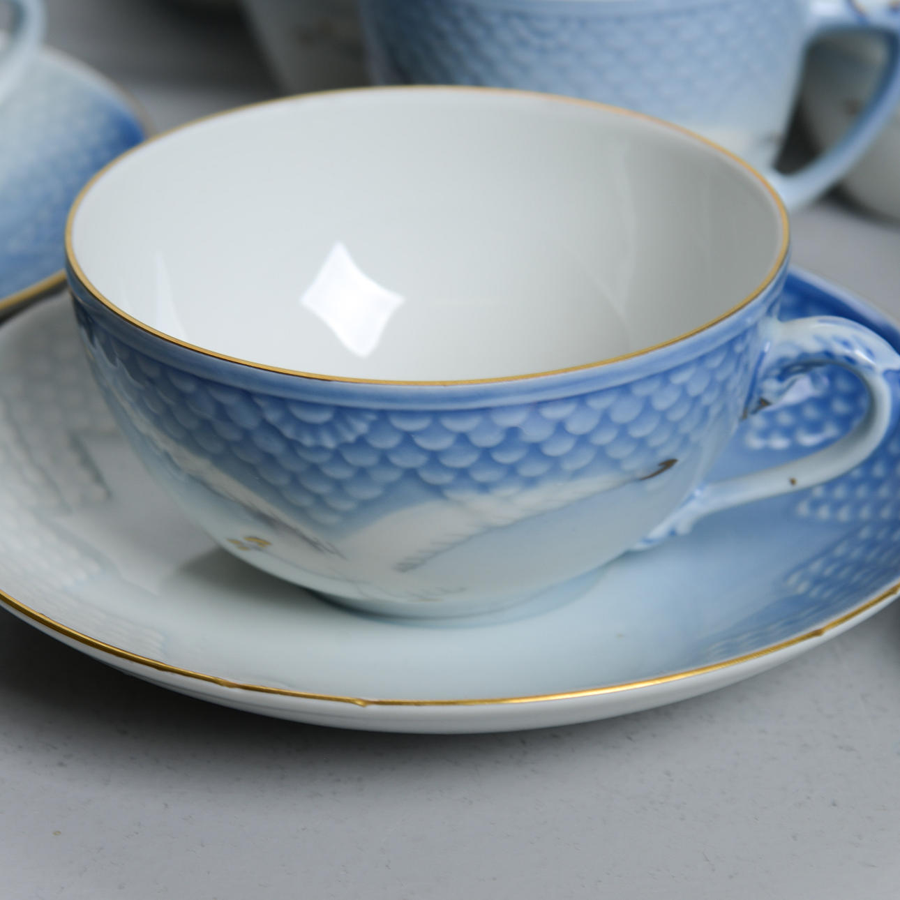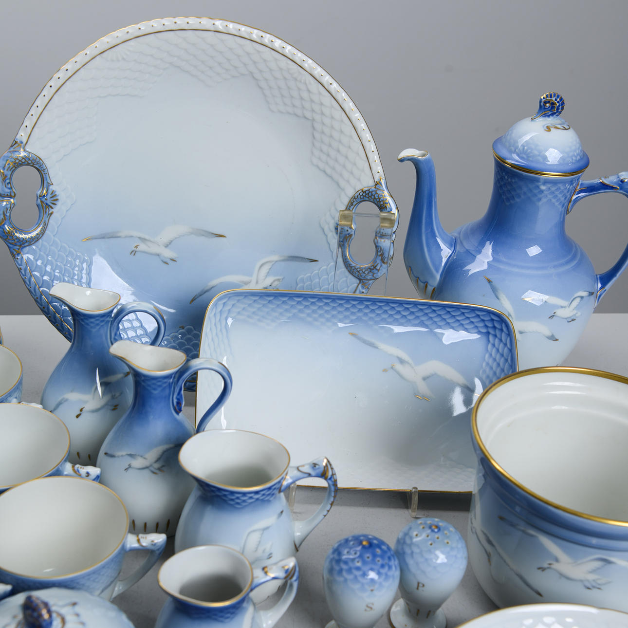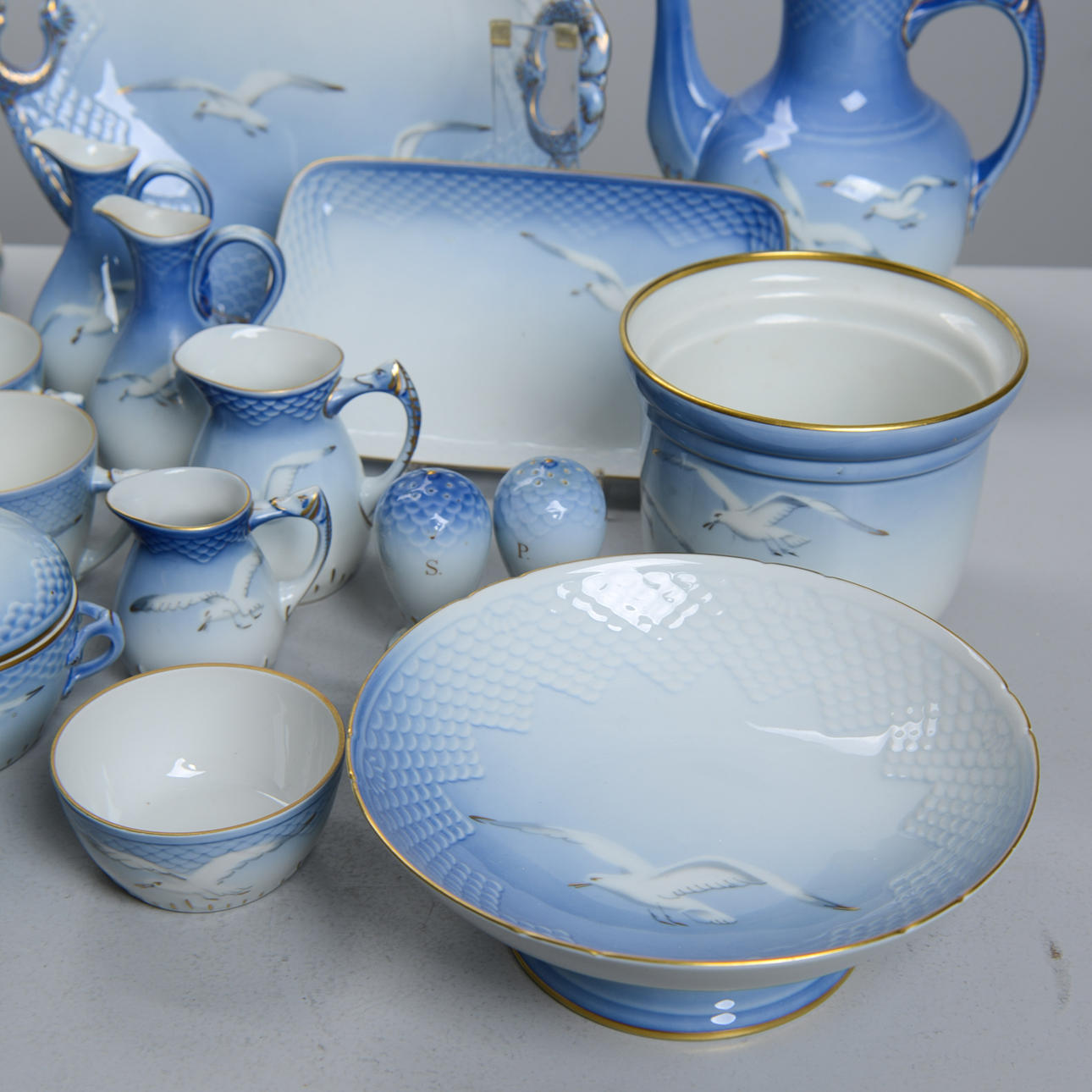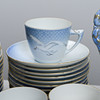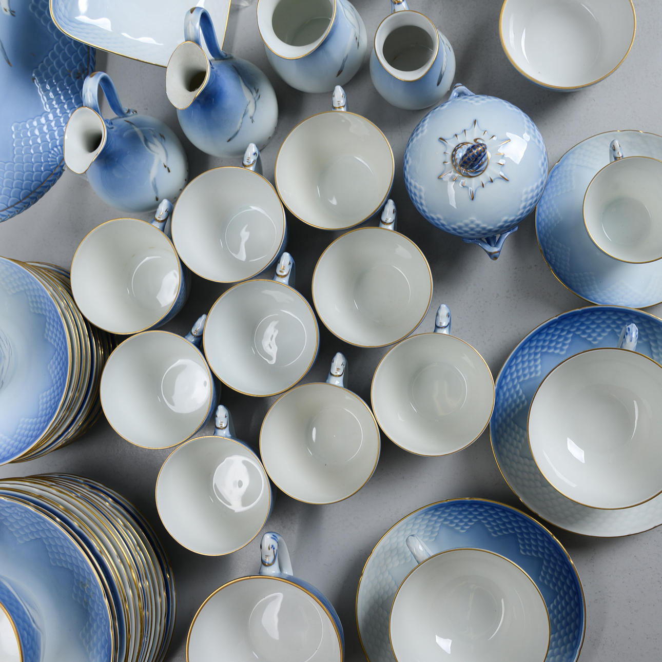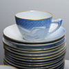 Reliefmönster, dekor i ljusblått porslin. 15 koppar med fat i varierande storlekar (2 extra fat medföljer), 12 assietter, 2 gräddkannor, en sockerskål, ett par salt och pepparkar, 2 små vaser, en liten skål, en urna, ett serveringsfat på fot, två serveringsfat i olika storlekar och former & en kanna, Royal Copenhagen.