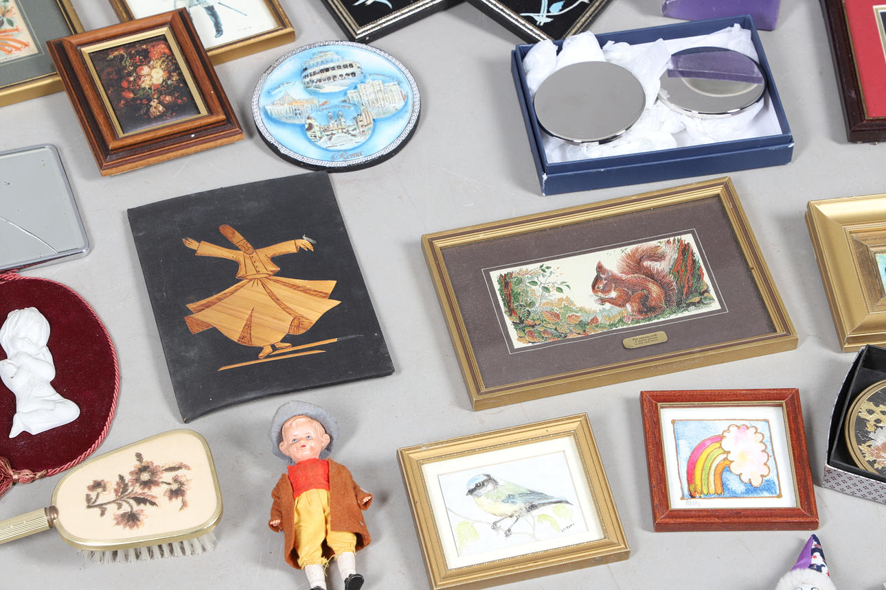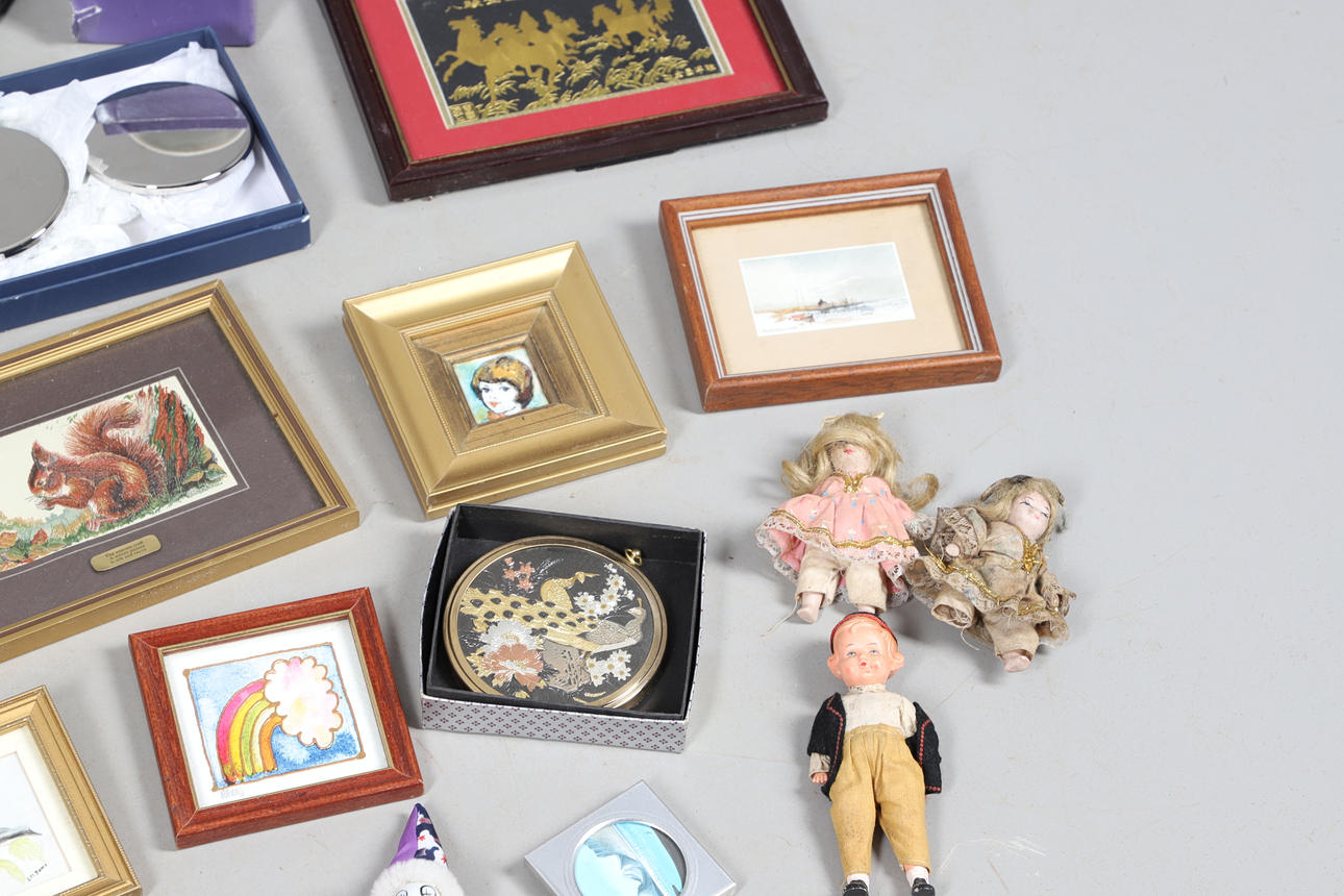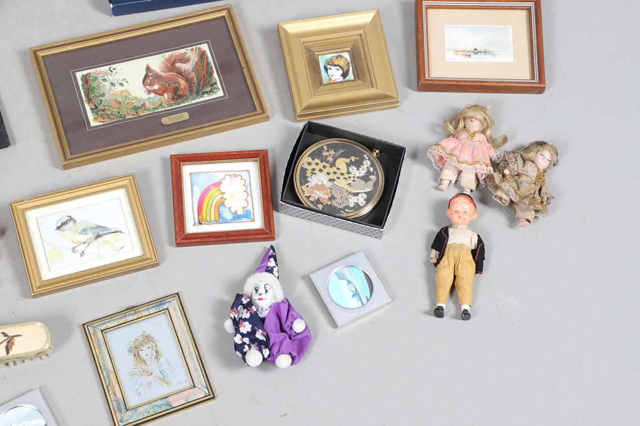 En mängd olika miniatyrtryck av olika motiv och med olika storlekar, största ram 23x18cm. Tillsammans med diverse toalettborstar och en spegel. Blandade dockor och andra samlarföremål etc (Antal).