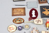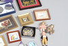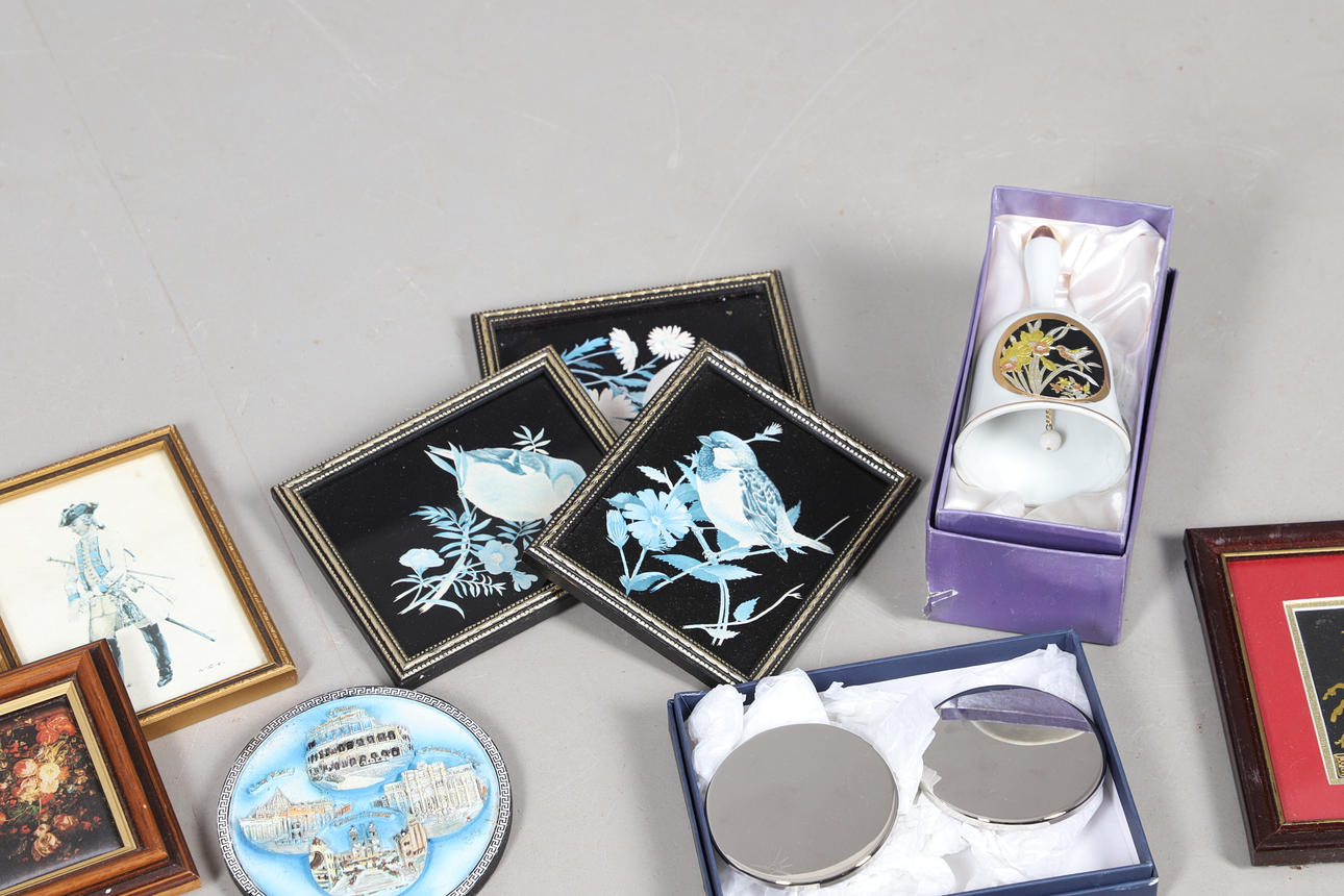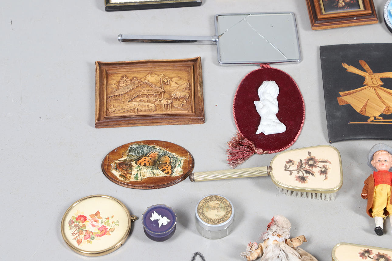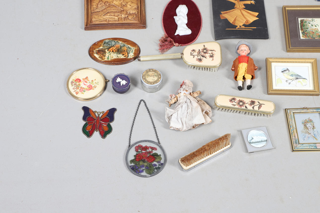 En mängd olika miniatyrtryck av olika motiv och med olika storlekar, största ram 23x18cm. Tillsammans med diverse toalettborstar och en spegel. Blandade dockor och andra samlarföremål etc (Antal).