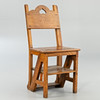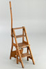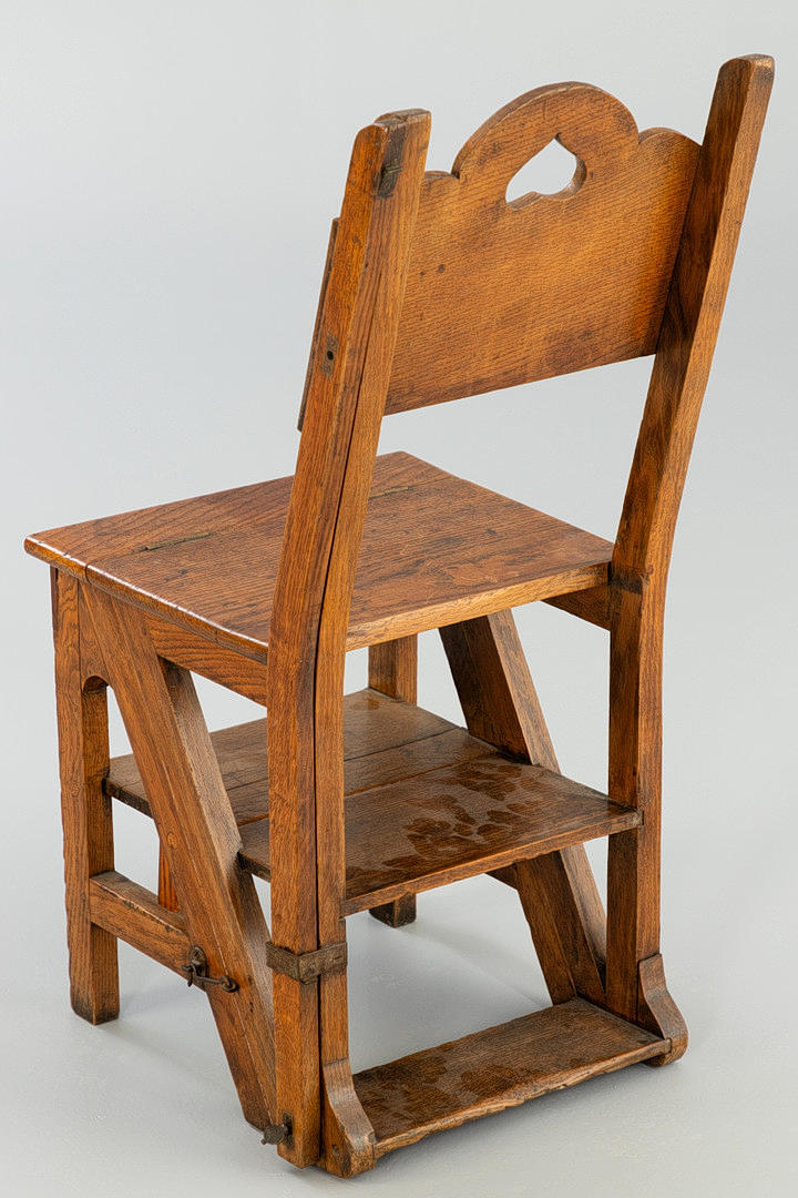 Massiv ek, mörkfärgad. Vikbar, gångjärnsförsedd, kan användas som bibliotekstege. Ordförande H. ca. 90 cm.